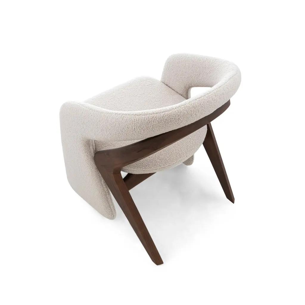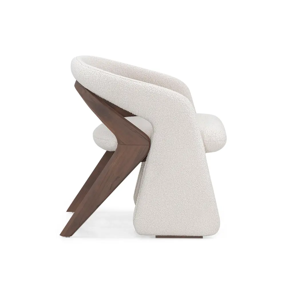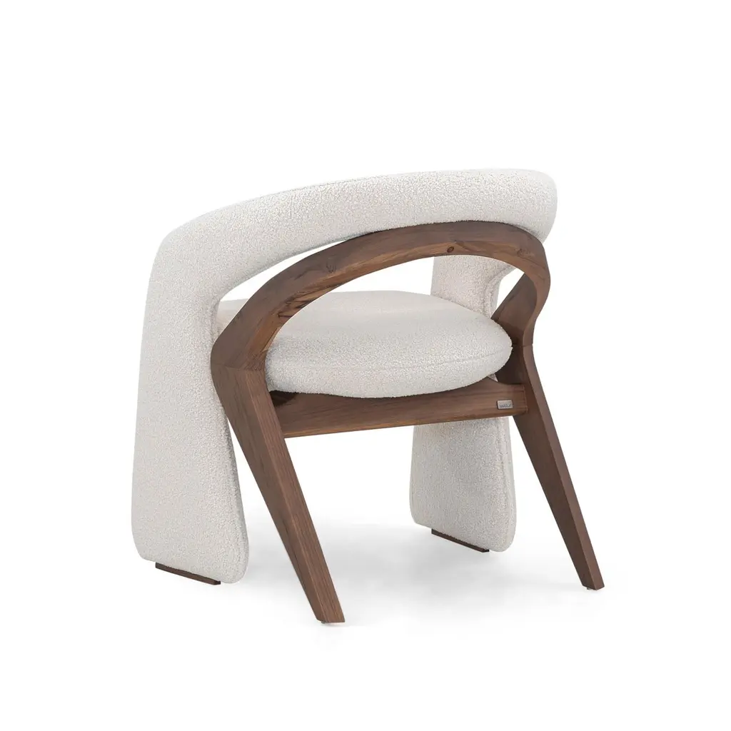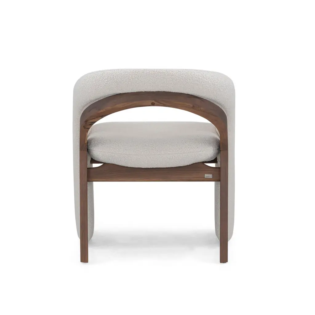 An Olga Scandinavian Modern style dining chair designed by Aciole Félix For Uultis, with walnut finish, upholstered in off-white sheepskin fabric. The Olga dining chair is a bold yet refined addition to any modern space, seamlessly blending style and function. Designed with a striking open-back silhouette, this piece features a walnut finish frame. Upholstered in plush Cream Faux Sheepskin fabric, the Olga chair brings a soft, textured touch to your dining or office setup. The interplay between the wood’s minimalist curves and the fabric’s cozy allure creates a harmonious look that exudes elegance and comfort.Perfect for dining areas, the Olga chair works exceptionally well at the head of the table, adding a statement of sophistication. Pair it with Cappio chairs to form a cohesive yet dynamic dining set, where Olga anchors the ends and Cappio lines the sides. Beyond the dining room, this versatile chair transitions beautifully to home offices or living spaces, offering a comfortable seating option for work or relaxation. Its ergonomically curved back and padded seat ensure extended comfort, while the durable frame promises long-lasting use.Ideal for contemporary interiors with daring design themes, the Olga chair is delivered fully assembled for immediate enjoyment. Crafted with environmentally conscious materials, it’s a sustainable choice for homes or commercial spaces seeking a blend of modernity and warmth.