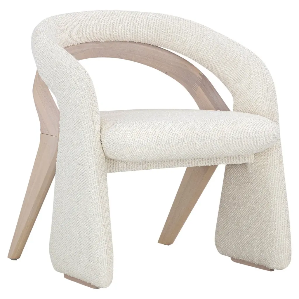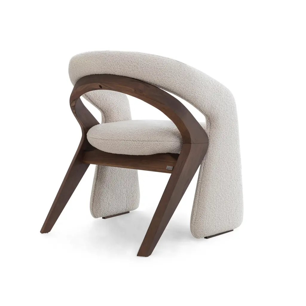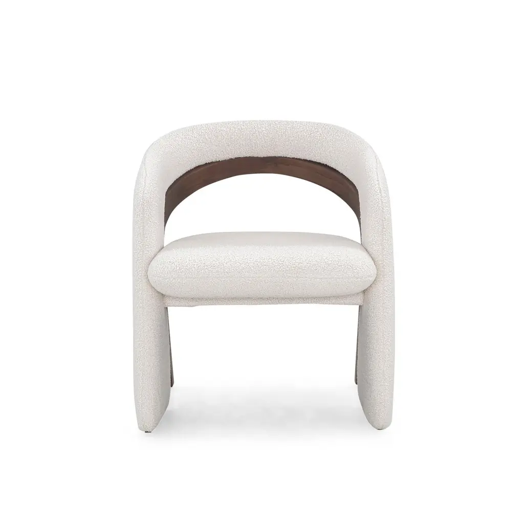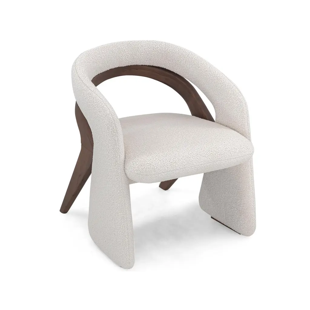 An Olga Scandinavian Modern style dining chair designed by Aciole Félix For Uultis, with walnut finish, upholstered in off-white sheepskin fabric. The Olga dining chair is a bold yet refined addition to any modern space, seamlessly blending style and function. Designed with a striking open-back silhouette, this piece features a walnut finish frame. Upholstered in plush Cream Faux Sheepskin fabric, the Olga chair brings a soft, textured touch to your dining or office setup. The interplay between the wood’s minimalist curves and the fabric’s cozy allure creates a harmonious look that exudes elegance and comfort.Perfect for dining areas, the Olga chair works exceptionally well at the head of the table, adding a statement of sophistication. Pair it with Cappio chairs to form a cohesive yet dynamic dining set, where Olga anchors the ends and Cappio lines the sides. Beyond the dining room, this versatile chair transitions beautifully to home offices or living spaces, offering a comfortable seating option for work or relaxation. Its ergonomically curved back and padded seat ensure extended comfort, while the durable frame promises long-lasting use.Ideal for contemporary interiors with daring design themes, the Olga chair is delivered fully assembled for immediate enjoyment. Crafted with environmentally conscious materials, it’s a sustainable choice for homes or commercial spaces seeking a blend of modernity and warmth.