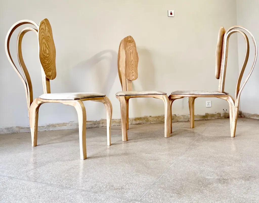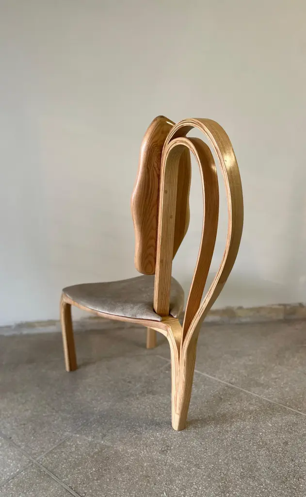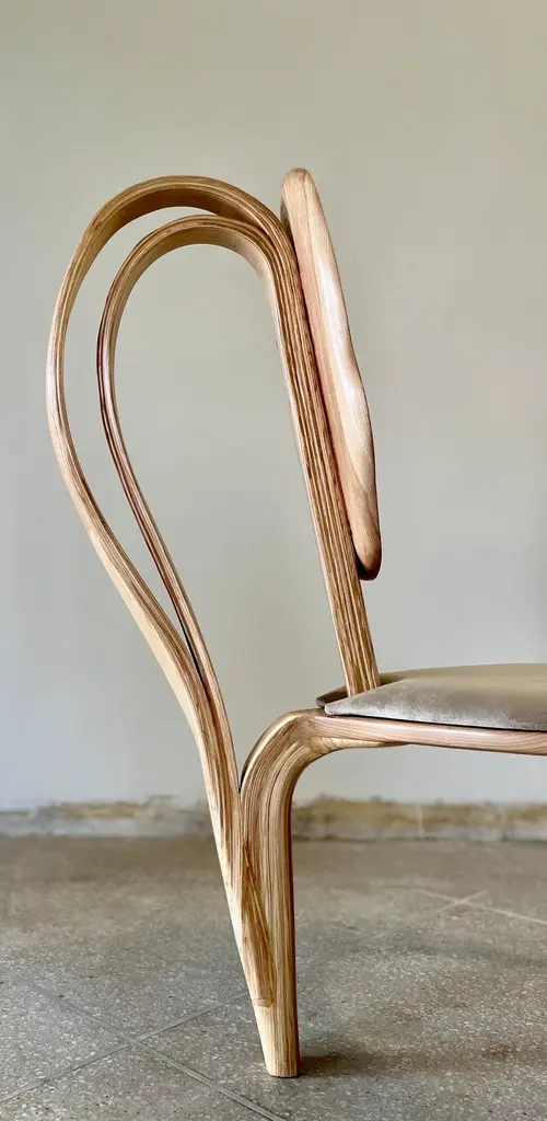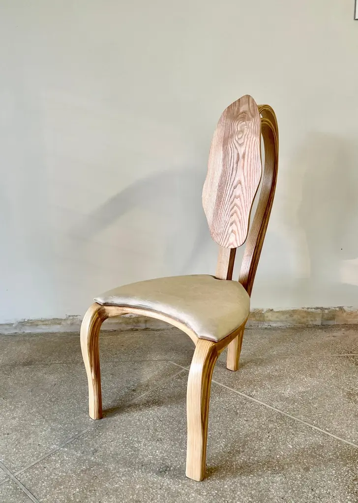 This is the Dining Chair No. 1 of the Fluentum Series of works. The Dining Chair No.1 has a free-form design; the wood bends and curves with beautiful flows to create the design. The handcrafted details on the piece such as the curves, varying thickness of the wood and twists give the piece its organic flows. The table creates an element of presence in a subtle manner; providing a unique style to any working space. The seat has velvet upholstery.The Studio has taken its exploration of wood further with the Fluentum Series. This Series uses techniques and skills learned over the years to create works that embody details that are unique to the Studio's design aesthetic and the craft of bending wood. These techniques allow the natural flow of the wood to take the reins of design; therefore, no two pieces are exactly the same, making each piece unique.Other points worth knowing:- The design may vary slightly from the piece in the pictures since each piece is handmade.- You can choose from an array of finishes.- The dimensions of the piece are customizable.