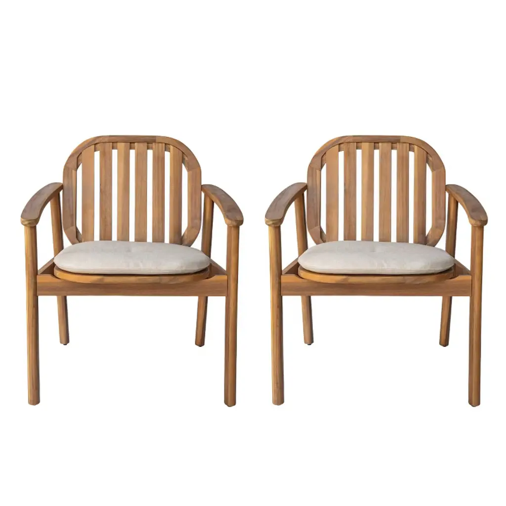 Refresh your patio or garden dining space with this inviting Acacia Wood Outdoor Dining Chair Set with Cushions. Built from solid acacia wood, these chairs highlight the natural grain and warmth of real hardwood, delivering a beautiful, durable seating solution for any outdoor gathering. The eucalyptus wood legs offer exceptional strength and stability, withstood against warping or cracking for years of dependable use in the sun or shade. Designed with comfort and style in mind, each armrest wooden garden chair features a gracefully curved back with vertical slats—providing ergonomic support and an airy, contemporary look that suits any outdoor decor. Smoothly rounded armrests make long meals and lively conversations even more enjoyable. The included thin beige seat cushion, crafted from soft, weather-resistant polyester, adds a plush layer of comfort while effortlessly complementing the natural wood tones. Perfect for patios, balconies, gardens, or by the pool, this outdoor dining chair with cushion set is engineered for lasting performance. The weather resistant deck chair construction stands up to the elements, making it a smart, reliable choice for outdoor entertaining or daily relaxation. The versatile modern design ensures these chairs look just as sophisticated with any dining table, or used as accent seating throughout your outdoor living spaces.