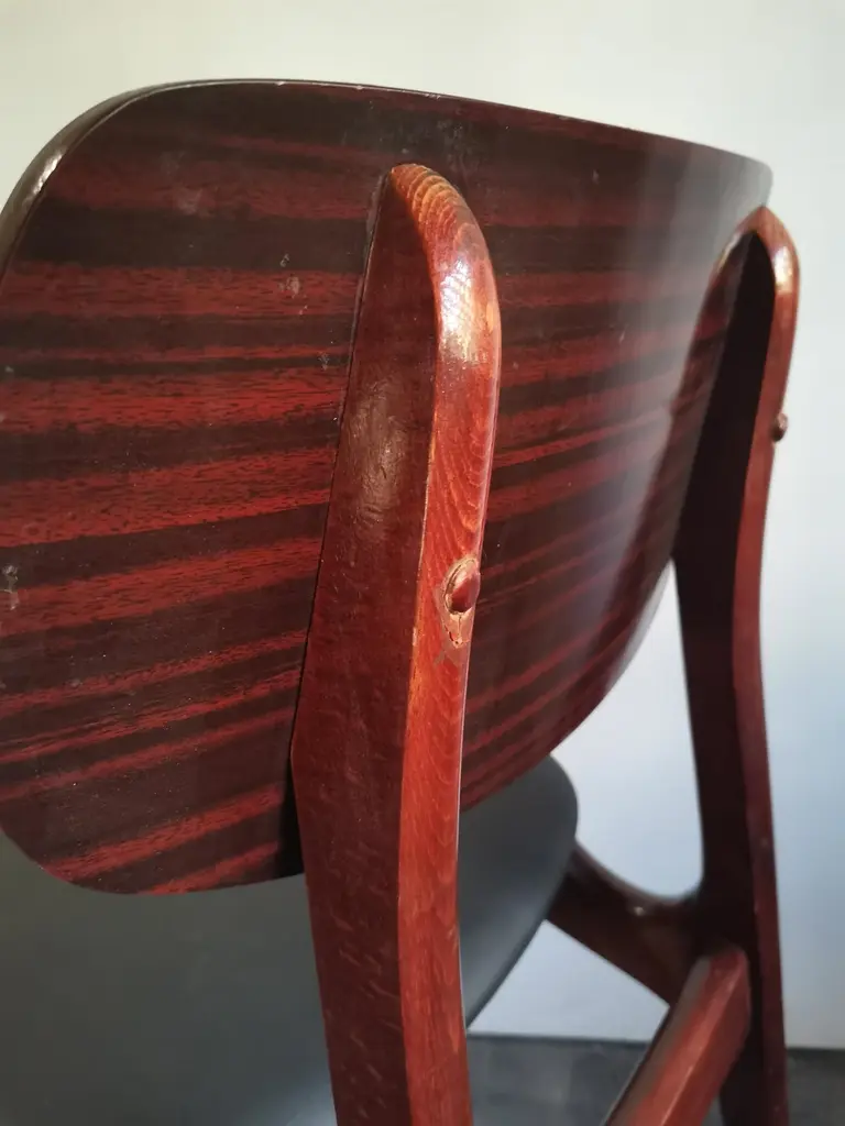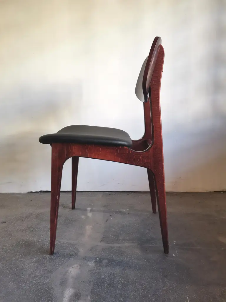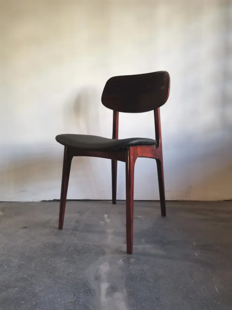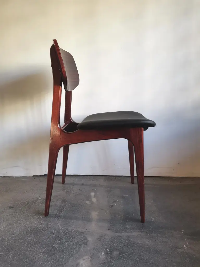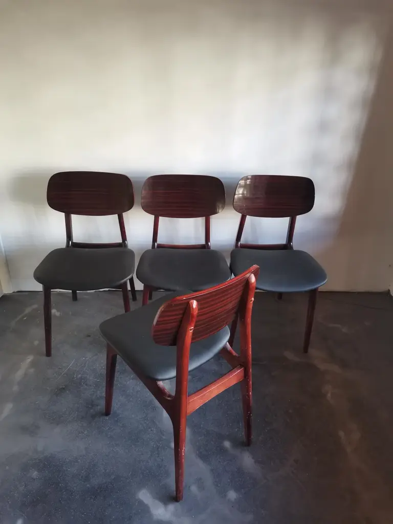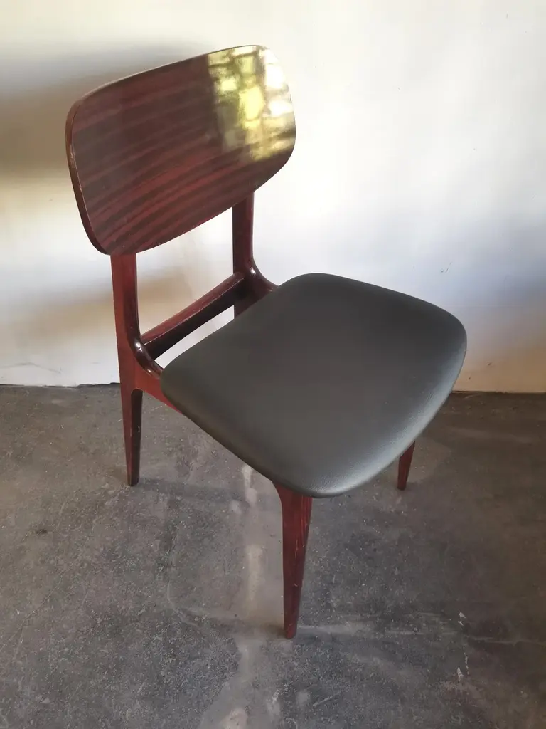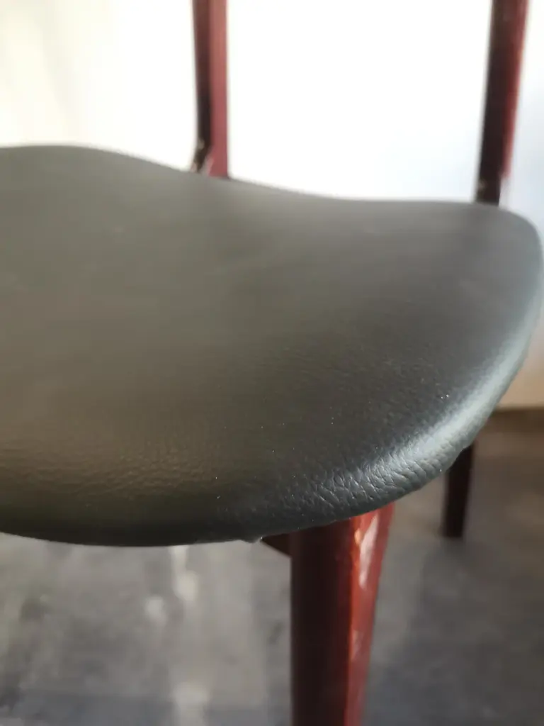 Dining chairs 1970sGreat design with new upholstered seats in black faux leather.Vintage patina in redish colour.