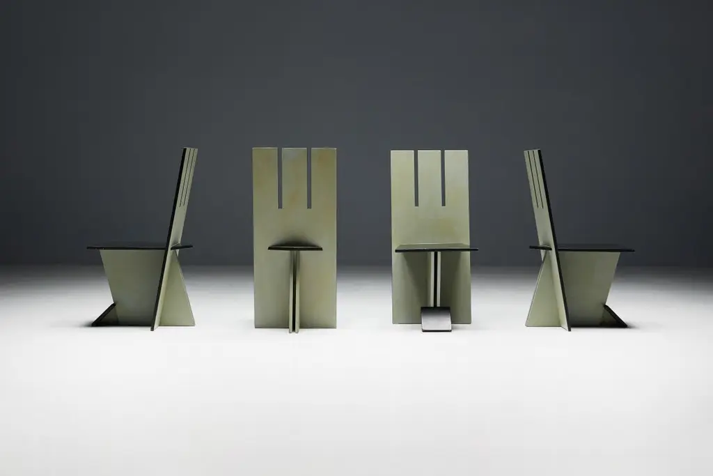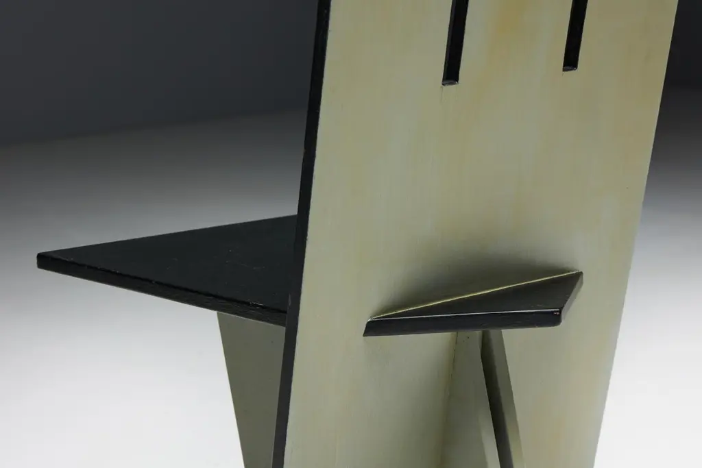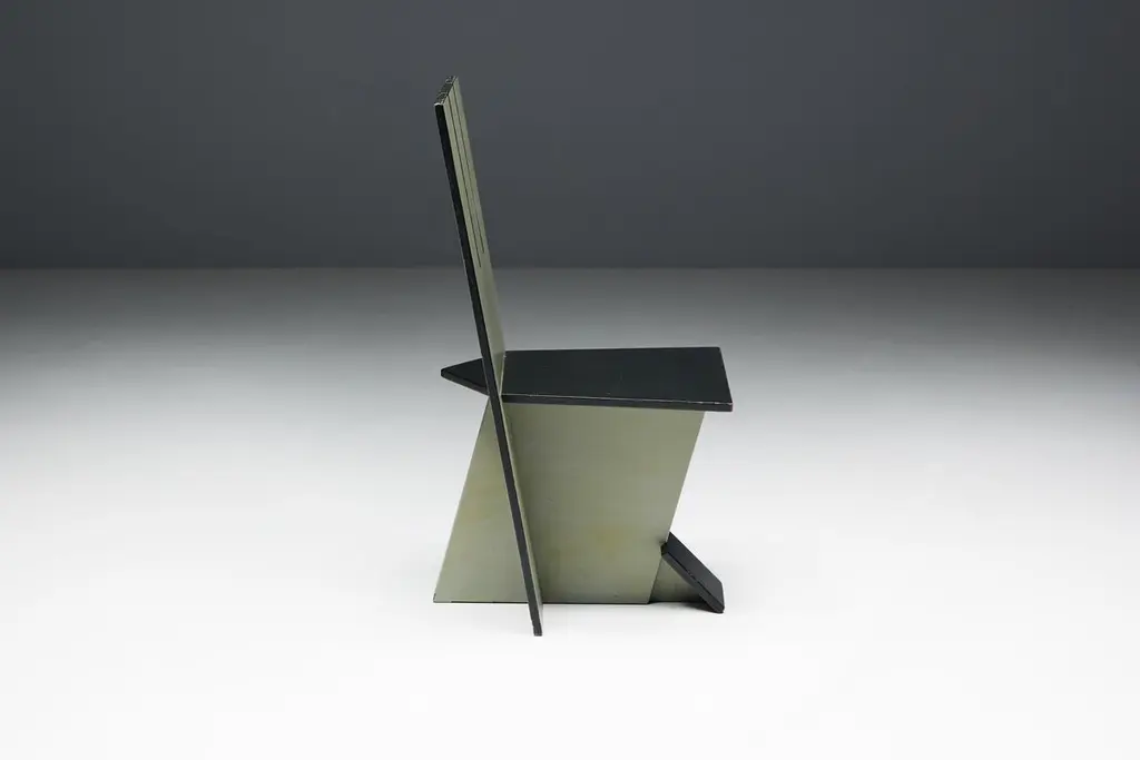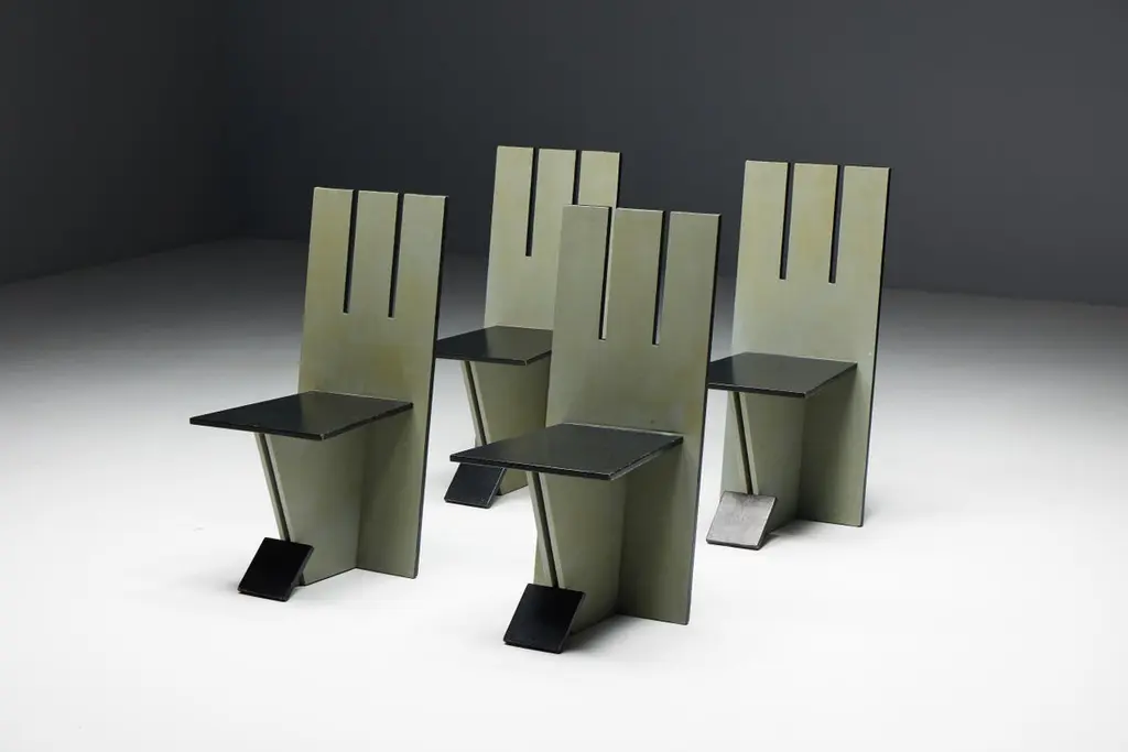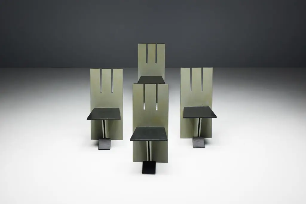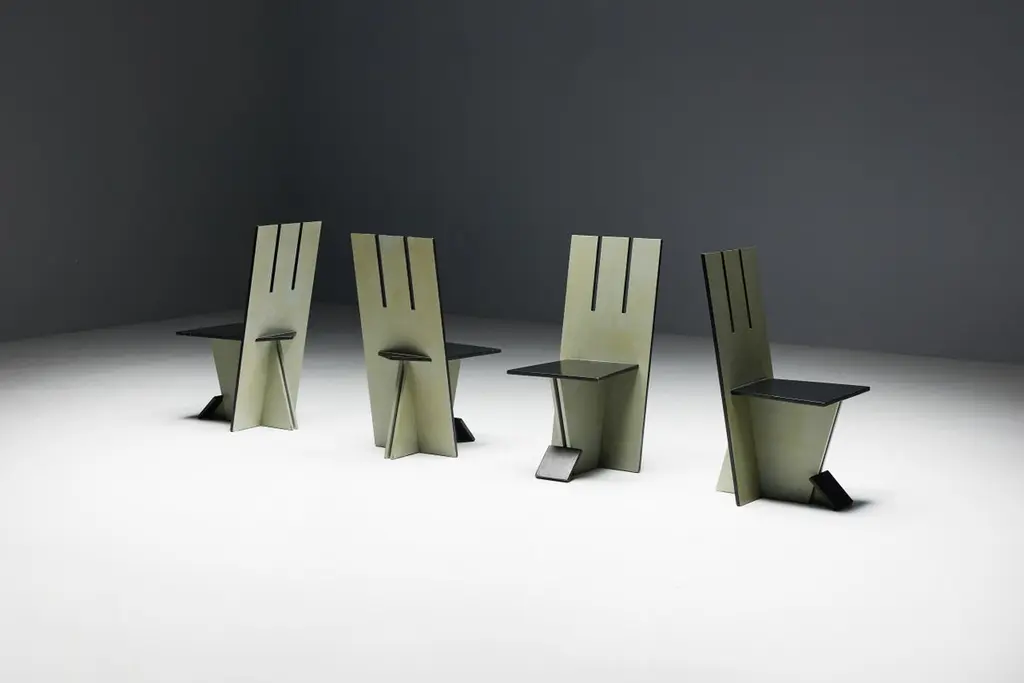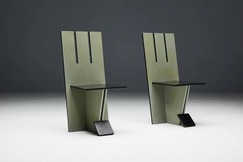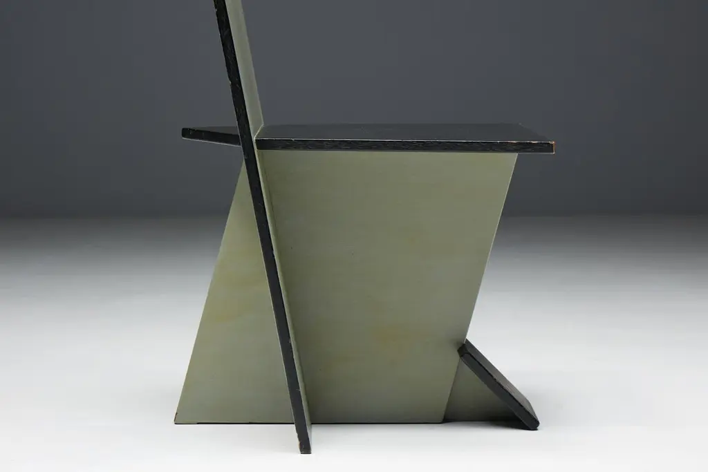 Set of 4 dining chairs, echoing the visionary spirit of the De Stijl movement of the 1930s and inspired by the pioneering works of Vilmos Huszar and Piet Zwart. Constructed from painted wood, these chairs exhibit meticulous attention to detail, featuring geometric forms reminiscent of the Stijl movement. With a beautiful patina, they are poised to enhance the aesthetics of any modernist interior or serve as a bold statement piece in any setting. Make a bold statement with these iconic chairs that embody the essence of De Stijl's avant-garde design principles. Priced per piece.