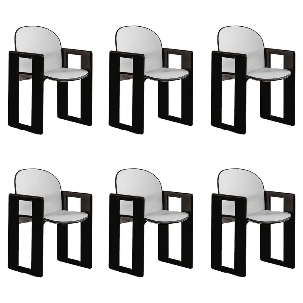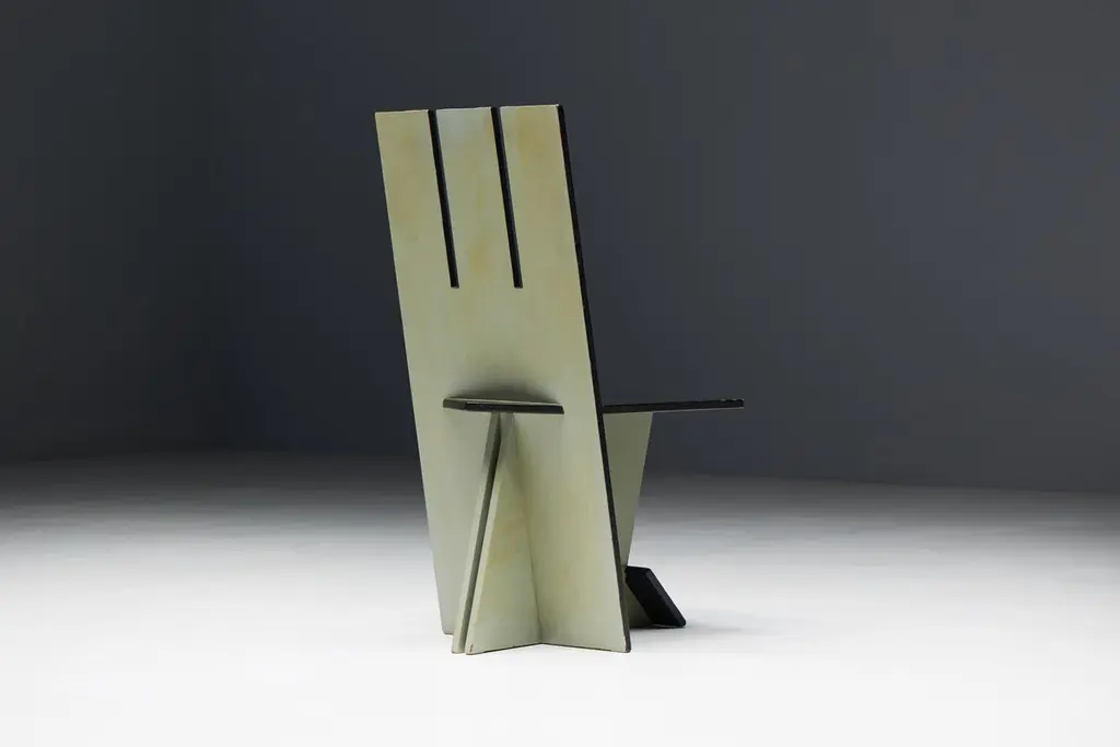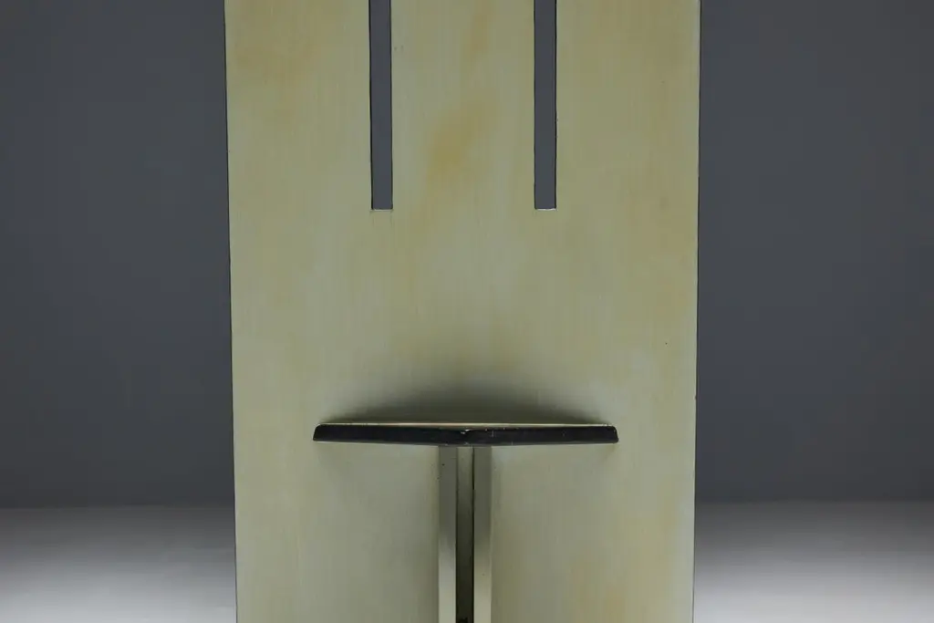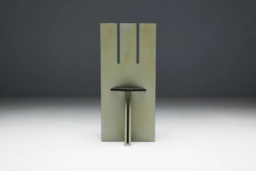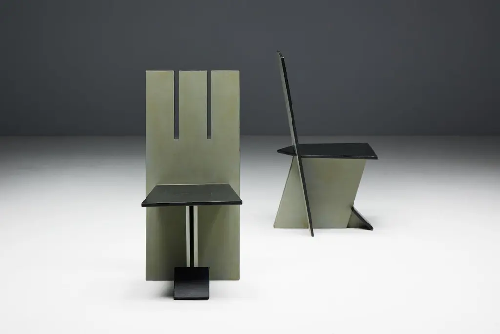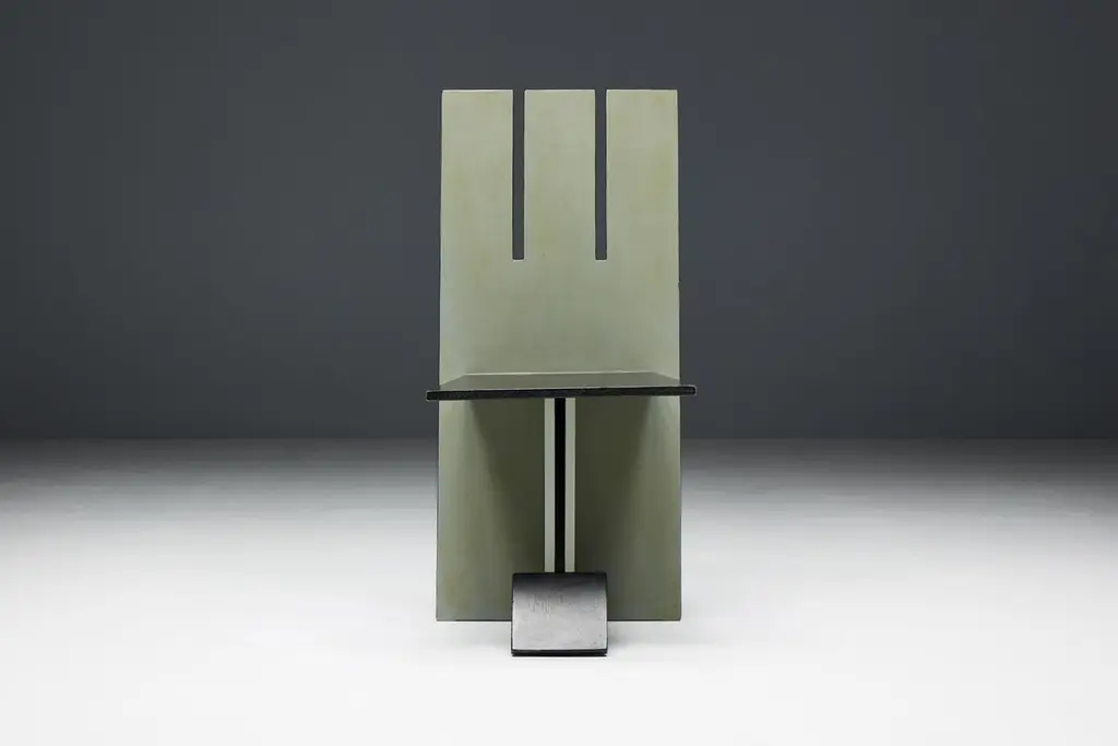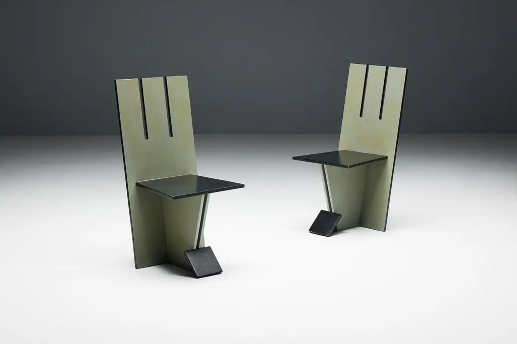 Set of 4 dining chairs, echoing the visionary spirit of the De Stijl movement of the 1930s and inspired by the pioneering works of Vilmos Huszar and Piet Zwart. Constructed from painted wood, these chairs exhibit meticulous attention to detail, featuring geometric forms reminiscent of the Stijl movement. With a beautiful patina, they are poised to enhance the aesthetics of any modernist interior or serve as a bold statement piece in any setting. Make a bold statement with these iconic chairs that embody the essence of De Stijl's avant-garde design principles. Priced per piece.