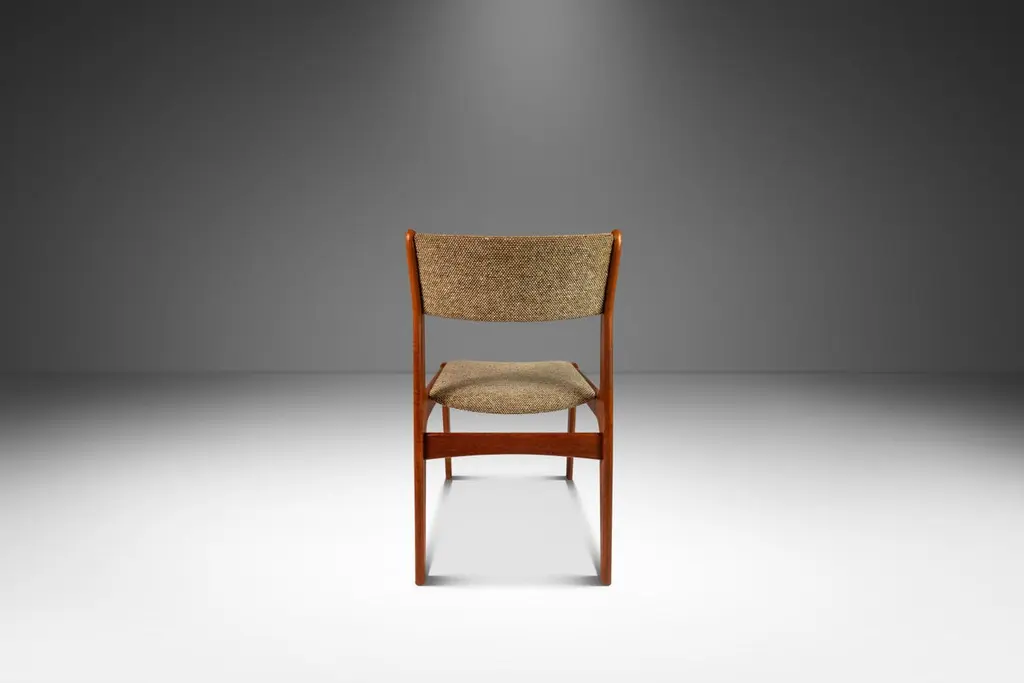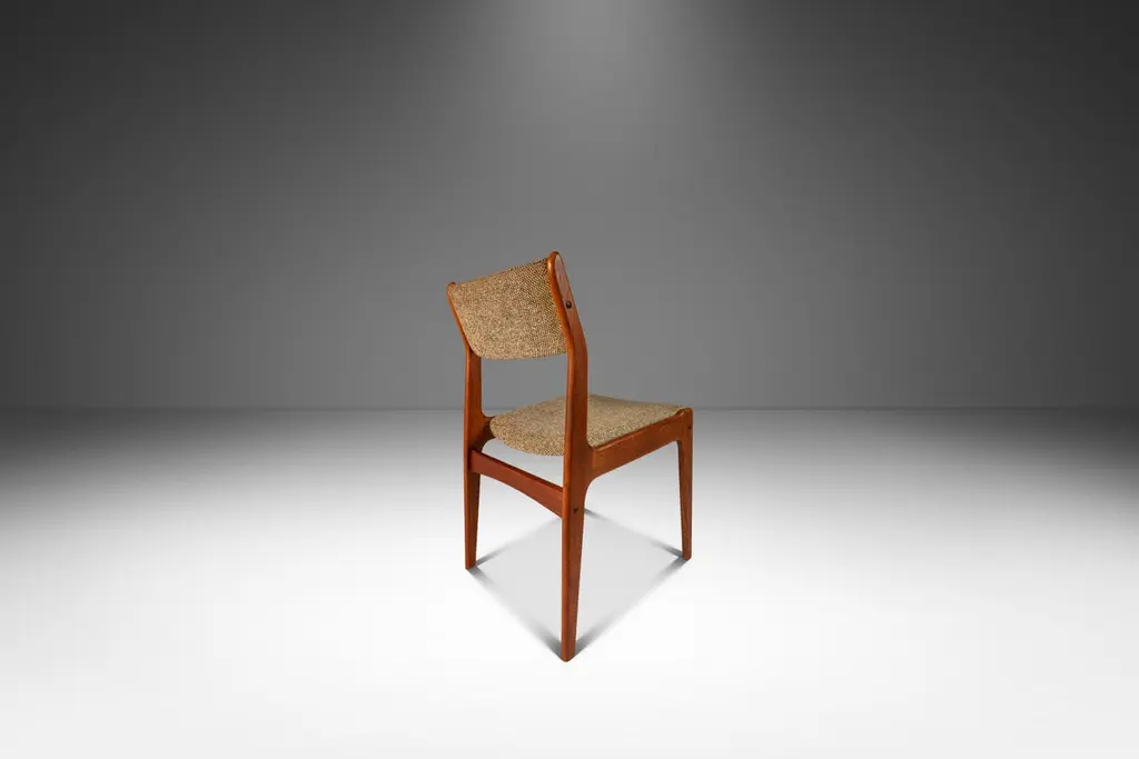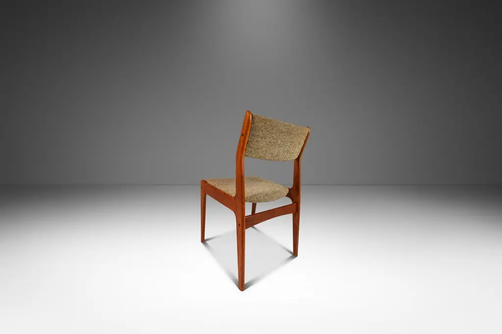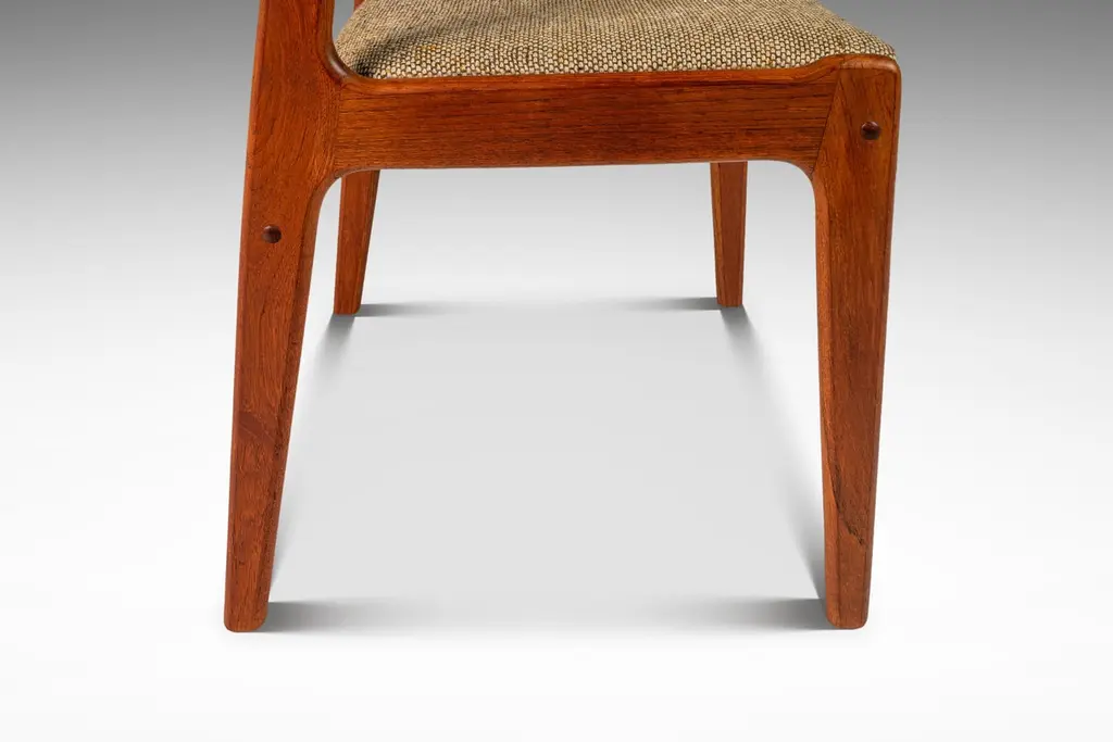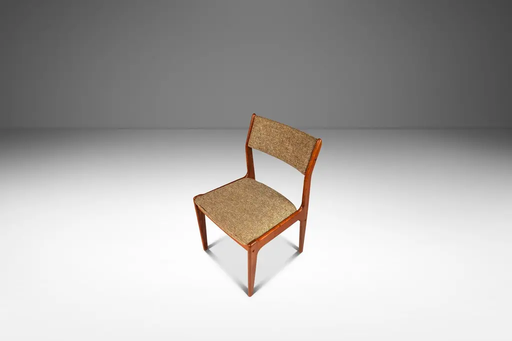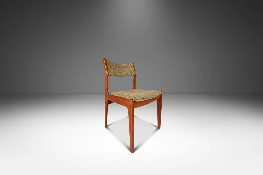 This refined Danish Mid-Century Modern dining or desk chair by Scandinavia Woodworks Co. exemplifies the minimalist elegance of 1970s Scandinavian design. Crafted from solid teak, the chair showcases the wood’s warm, honeyed tones and fine grain, with a gracefully curved backrest and tapered legs that lend an airy, lightweight silhouette. The original speckled gray fabric upholstery, with its subtle texture, complements the teak’s natural beauty while adding a tactile warmth to the piece. The ergonomic backrest and sturdy frame ensure both comfort and durability, making this chair a versatile addition to a dining space, home office, or collector’s curated interior. A testament to Denmark’s legacy of functional craftsmanship, this piece captures the timeless appeal of mid-century design.Scandinavia Woodworks Co. was a Danish furniture manufacturer active during the mid-20th century, known for producing high-quality pieces that embodied the principles of Danish Modern design. Operating primarily in the 1960s and 1970s, the company specialized in crafting furniture from premium woods like teak and oak, focusing on minimalist forms and functional beauty. While not as widely documented as larger firms like J.L. Møller, Scandinavia Woodworks contributed to the global popularity of Scandinavian design by creating durable, aesthetically refined pieces that remain cherished by collectors today.---Dimensions---Width: 19.5 in / 49.53 cmDepth: 21 in / 53.34 cmHeight: 32.5 in / 82.55 cmSeat Height: 18 in / 45.72 cmThis elegant desk / side chair is in 100% original, vintage condition. The solid Burmese teak frame shows only minor nicks and light scratches (the worst of which can be seen in the detail photos provided) but shows no stains, gouges or cracks whatsoever and the teak woodgrains are absolutely stunning in natural light.The original fabric, in a neutral oatmeal, heavy-knit polyester and cotton blend shows only minor discoloration on the seat as well as a thin strip of what appears to be discoloration but is actually a strand of darker thread original to the upholstery (please view in the detail photos provided).This chair is incredibly comfortable, structurally sound and ready for a lifetime more of use. Please view all photos and video provided for details on this chairs current condition. We're limited on the amount of media we can post so additional photos and videos are available upon request.