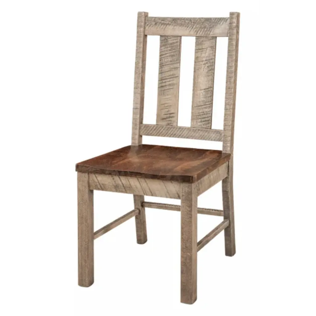 Rustic Elegance and fine Amish craftsmanship are hallmarks of this dining chair. Constructed in the classic barn wood style with timber and peg joinery, the chair is made with new rough sawn pine, sanded smooth and finished with 3 coats of professionally applied lacquer.Amish made in the USARough sawn pine sanded smooth to touch with wooden peg accentsProfessionally applied lacquer finish for added beauty and durabilityDue to variability in the rough sawn process, each item will be uniqueDigital colors may vary slightly from photographs