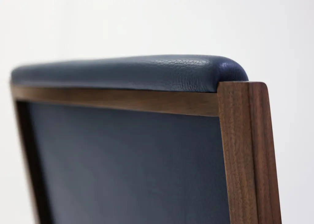 The Nevin dining chair from Lf upholstery is a comfortable and beautifully crafted side chair that can double as both a dining chair and game chair, shown in blue leather with soft foam on back and seat with hand-carved mahogany wood frame.ITEM IS AVAILABLE FOR IMMEDIATE DELIVERY "AS IS" - INQUIRE FOR CUSTOM PRICING PRICE IS SUBJECT TO INCREASE BASED ON WOOD, FINISH AND SIZE.