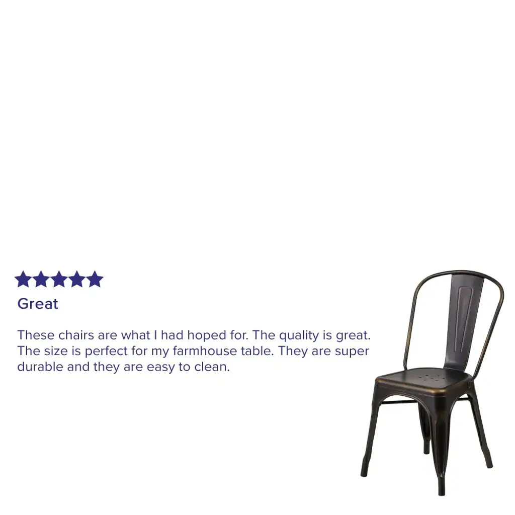 Bring a touch of industrial charm to your indoor or outdoor dining area with this distressed metal chair. With its powder-coated frame, curved seat back, and supportive cross braces, this chair is not only stylish but also durable. Available in 10 versatile finishes to match any decor, this stackable chair is designed for convenience and space-saving storage.Features: