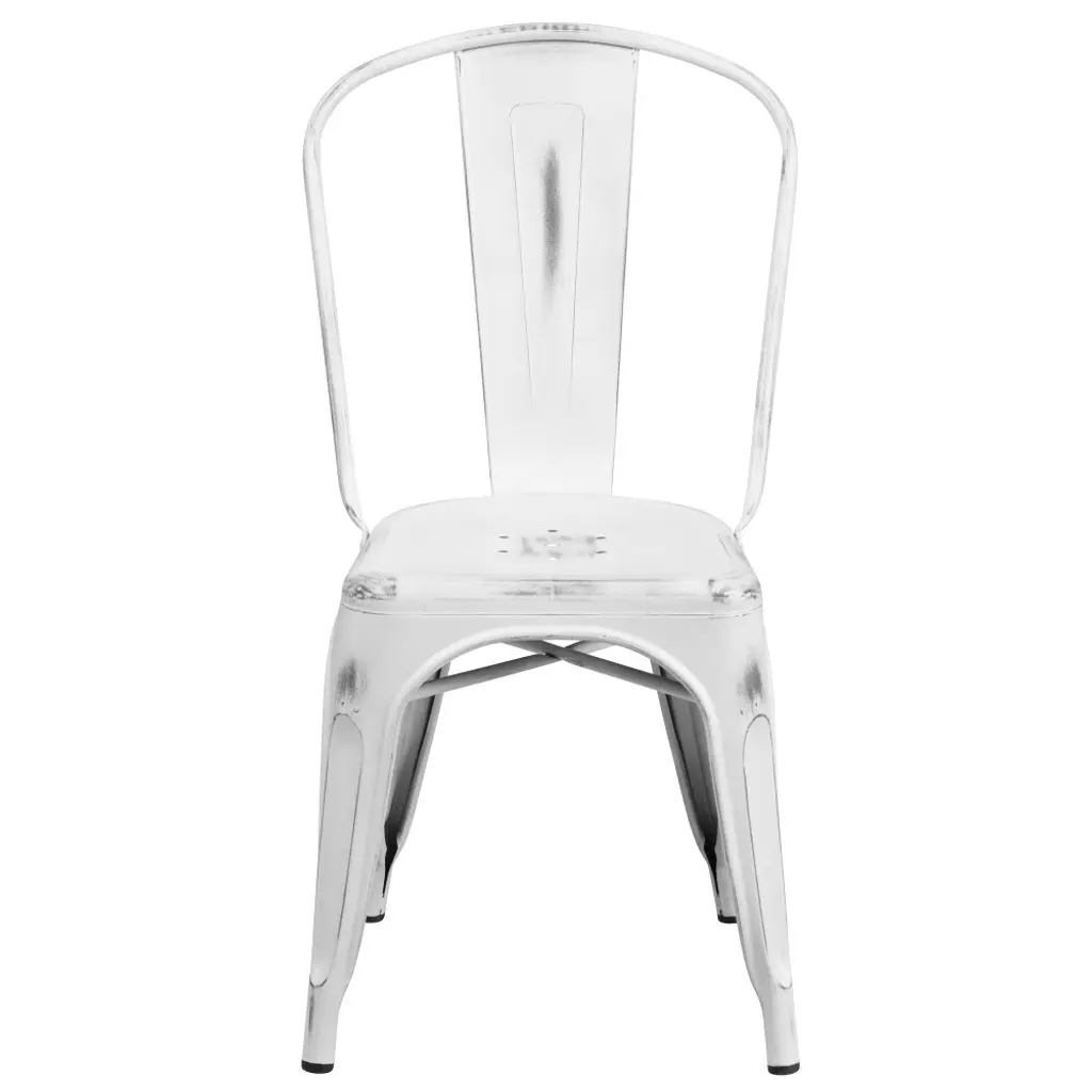 Bring a touch of industrial charm to your indoor or outdoor dining area with this distressed metal chair. With its powder-coated frame, curved seat back, and supportive cross braces, this chair is not only stylish but also durable. Available in 10 versatile finishes to match any decor, this stackable chair is designed for convenience and space-saving storage.Features: