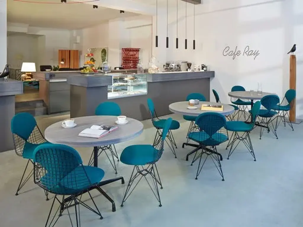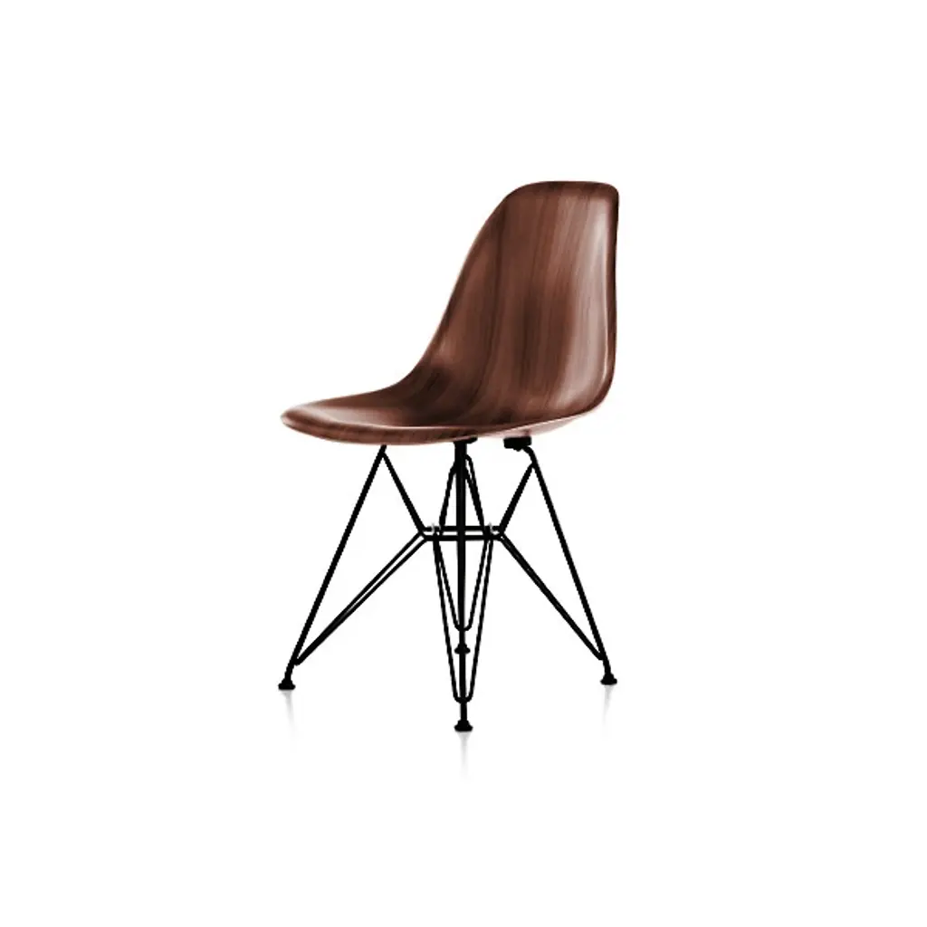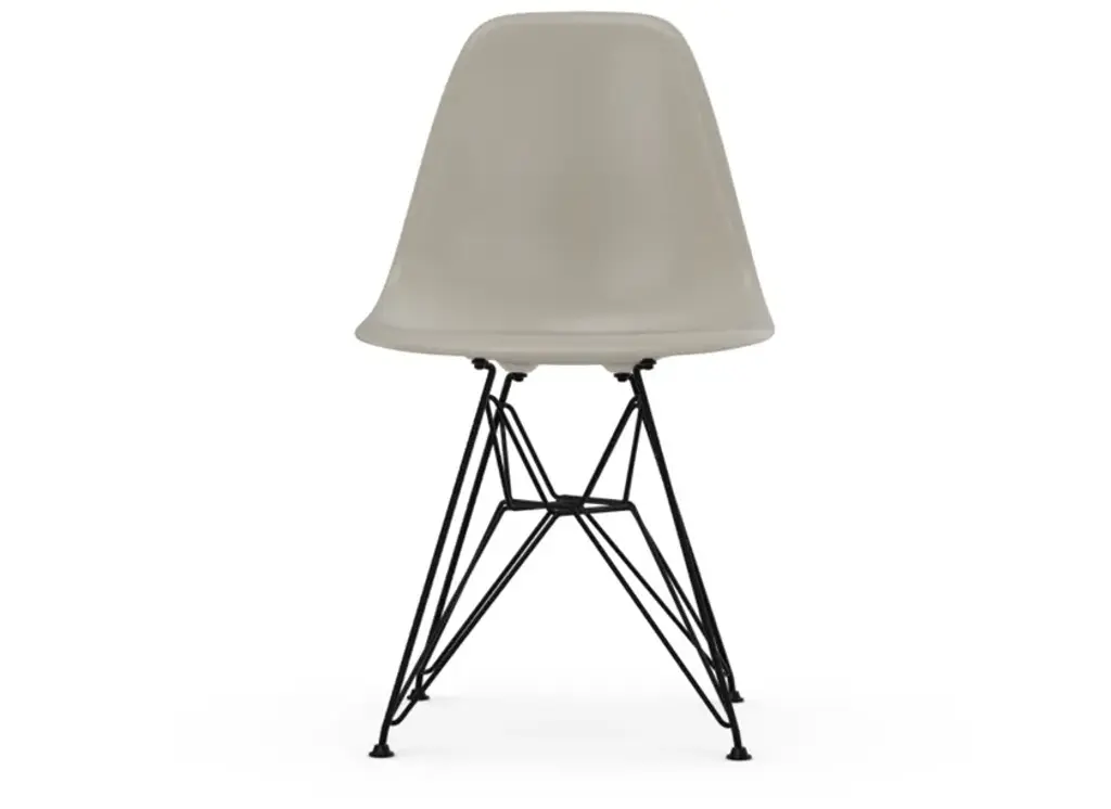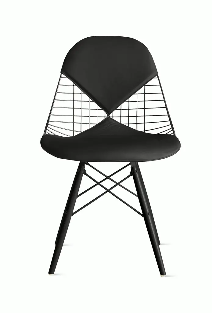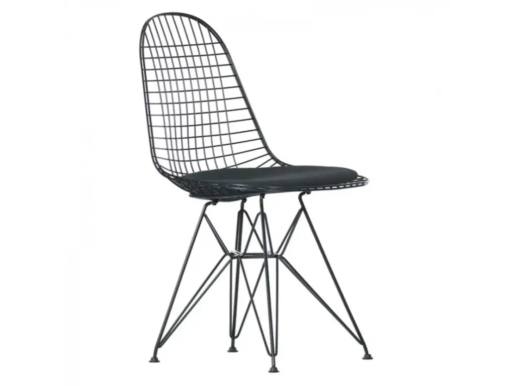 DKR: Dining Height K-Wire Shell R-Wire Base- Back and seat: bent and welded steel wire, chrome-plated or powder-coated finish. The powder-coated version is suitable for outdoor use.- Base: four-legged wire base with cross struts. Fitted with glides for carpet; felt glides optionally available for hard floors.- Upholstery: unupholstered, with seat cushion or with seat and back pad. Seat and back pads can be removed and reattached; available in Hopsak fabric or leather.Designed by Charles and Ray Eames out of welded steel wire, the Wire Chair is a variation on the theme of the organically shaped one-piece seat shell, combining transparent lightness with technological sophistication. The seat shell can be combined with a choice of different bases. The Wire Chair is available without upholstery, with a seat cushion or with a two-piece seat and back cushion known as the ‚Bikini‘ pad due to its shape.The Wire Chairs have a powder-coated finish; some models are also available in a chrome-plated version. DKR and DKX models with a powder-coated finish are ideally suited for both indoor and outdoor use.In 2016, Vitra added roughly 20 mm to the base height of the Wire Chairs while adapting the seat geometry accordingly.These revisions, which are aesthetically almost imperceptible, increase the comfort of this classic chair design, especially in combination with contemporary tables.The Wire Chairs by Charles and Ray Eames owe their transparent look to the spot-welded steel wire shell, while the wooden base of the DKW (Dining Chair K-Wire Wood Base) lends a contrasting note of warmth to the essentially technical appearance of the design. The metal components of the DKW chair have a black powder-coated finish; the wooden legs of the base come in various shades of maple.Upholstery: unupholstered, with seat cushion or with seat and back pad. Seat and back pads can be removed and reattached; available in Hopsak fabric or leather.