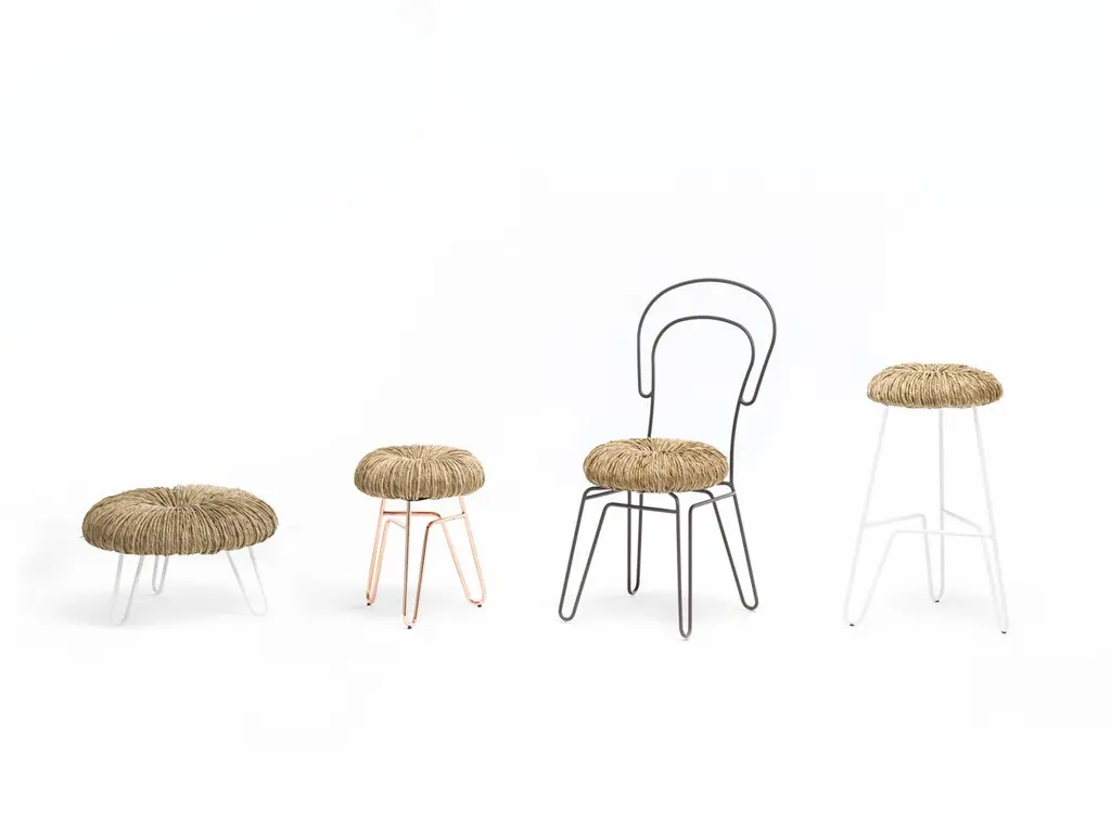 "Stools straw. Handmade stuffing with the marsh grass (sedge still green) is an old art always used to cover the seats, an artisan culture that belongs to our country. The collection Donut keeps alive this art, supporting the tradition of our ancestors.The plot with the straw is interpreted in a contemporary way: the rope in natural fibers (marsh grass) is rolled up on a padded base to get a comfortable seat. The structure is made of metal rod bent".