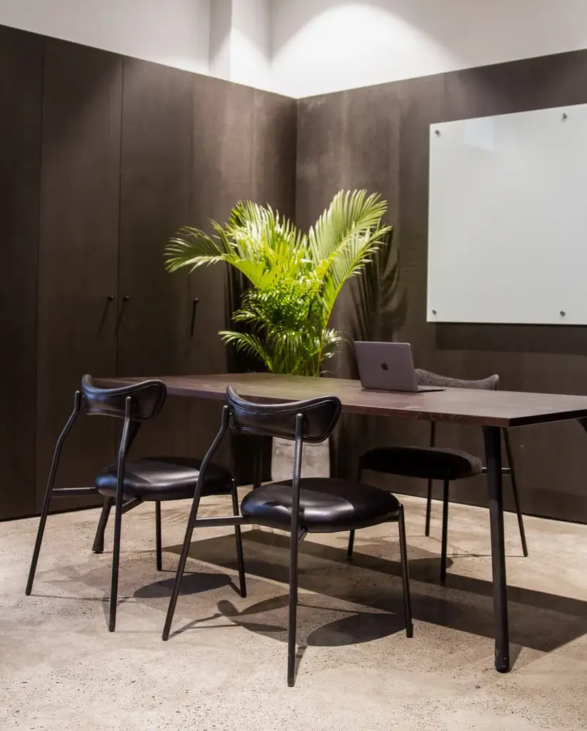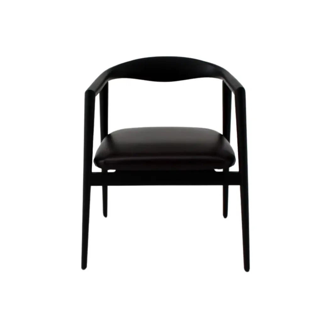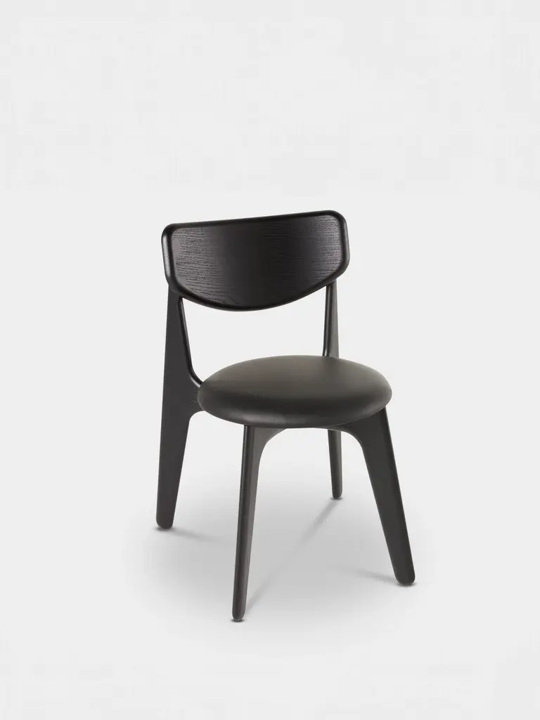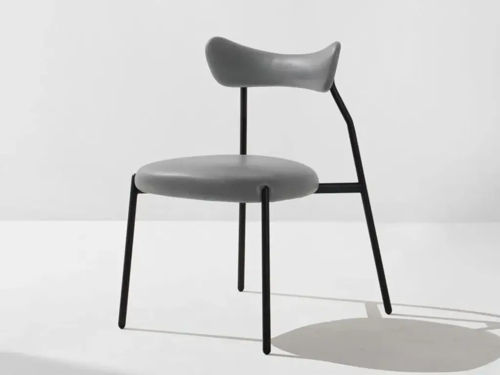 The Dragonfly dining chair features a thin and enveloping backrest. Its frame is built with blackened steel tubes, while the seat comes in either a leather or fabric upholstery.
