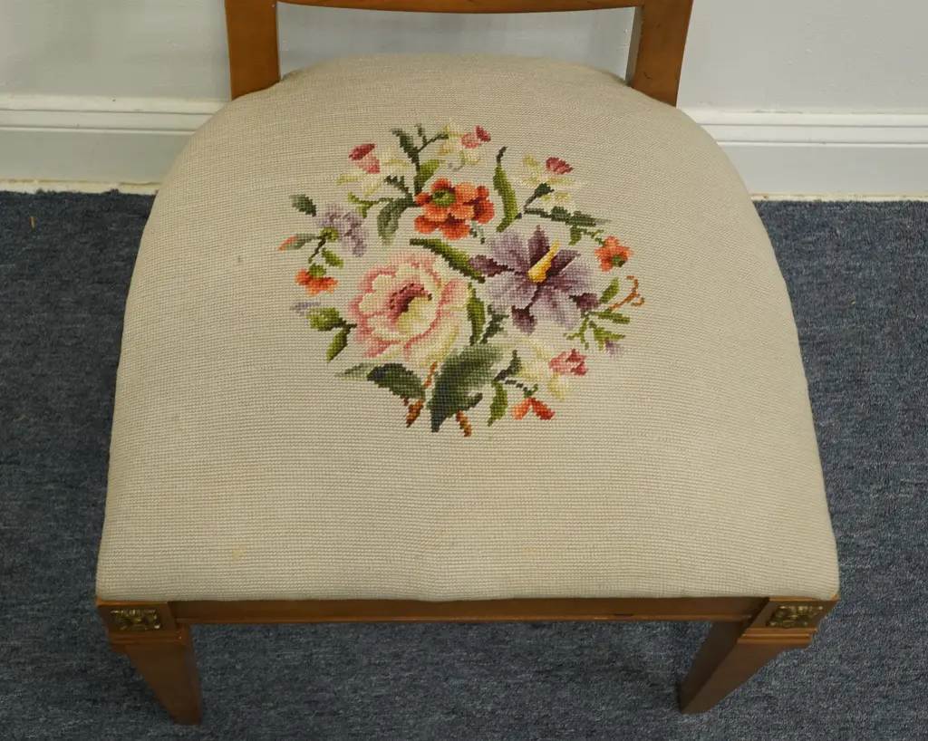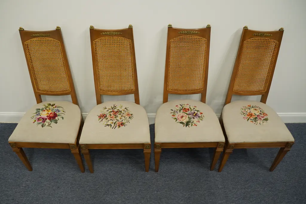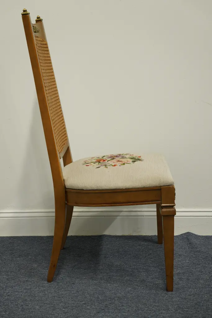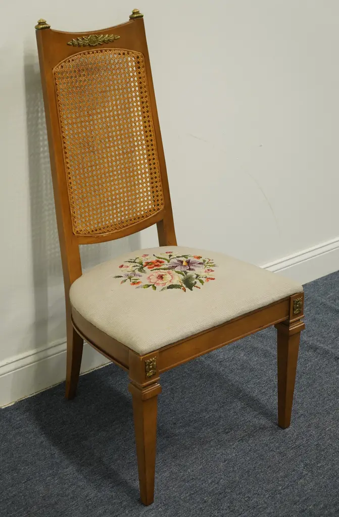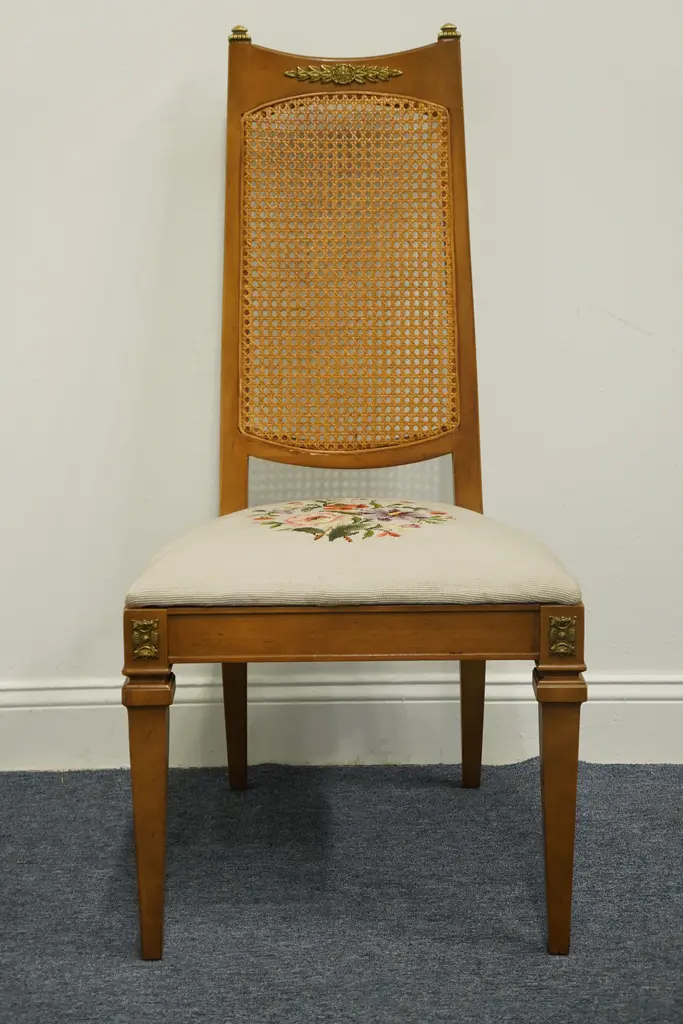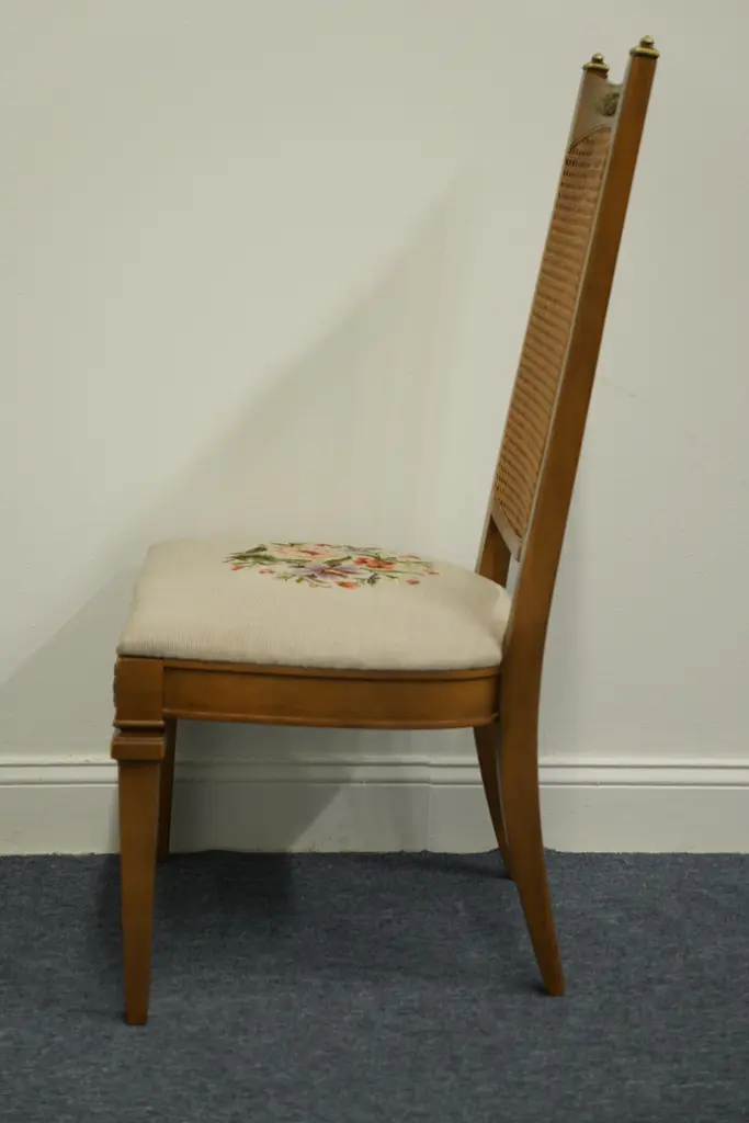 DREXEL FURNITURE San Remo Italian Style Cane Back Dining Side Chair Needlepoint seats have four different patterns; see photos in gallery. 41.75" High 20.5" Wide 22" Deep Seat: 18" High We specialize in high end used furniture that we consider to be at least an 8 on a scale of 1 to 10 regarding condition, unless otherwise noted.