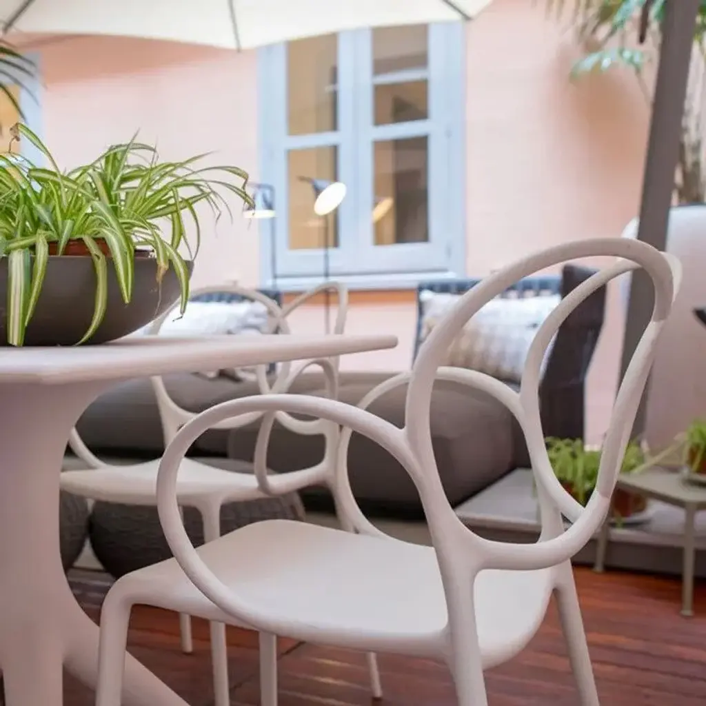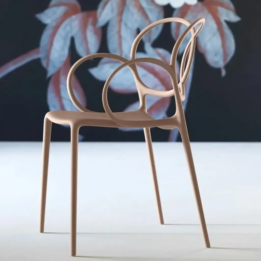 Monobloc armchair in polypropylene copolymer with glass fiber, natural polyethylene semisoft feet. stackable up of four pieces.Indoor/outdoor use.Sissi is a sculptural, very versatile, self- centred and contemporary piece.