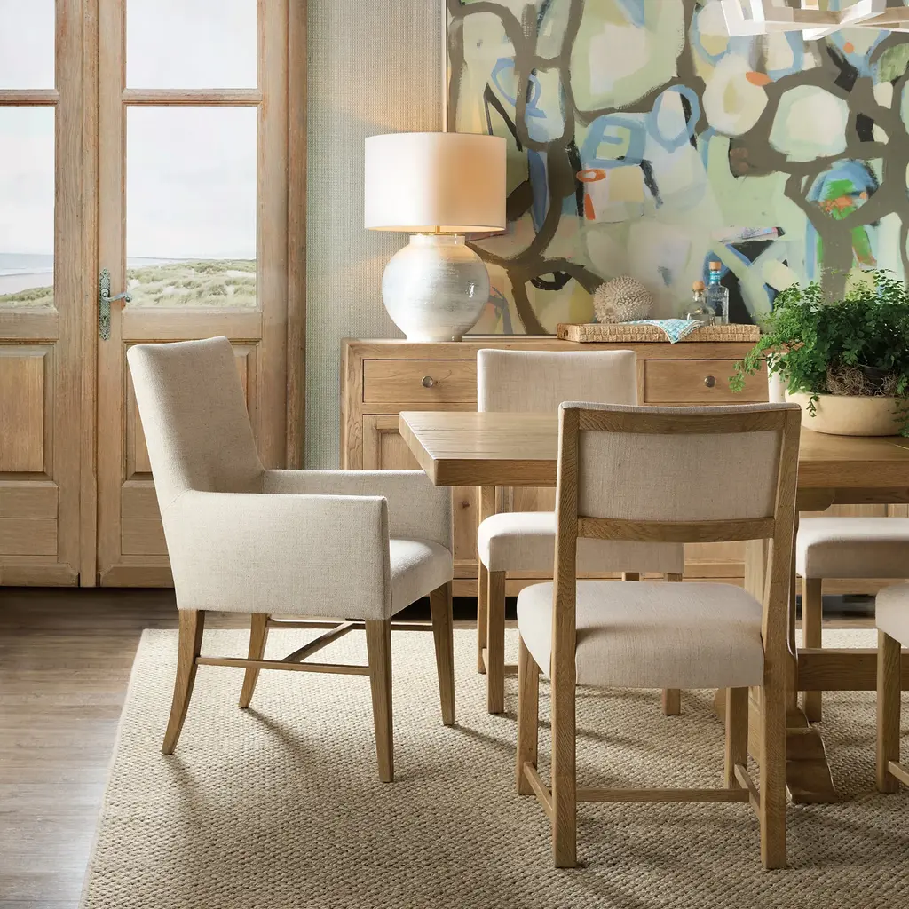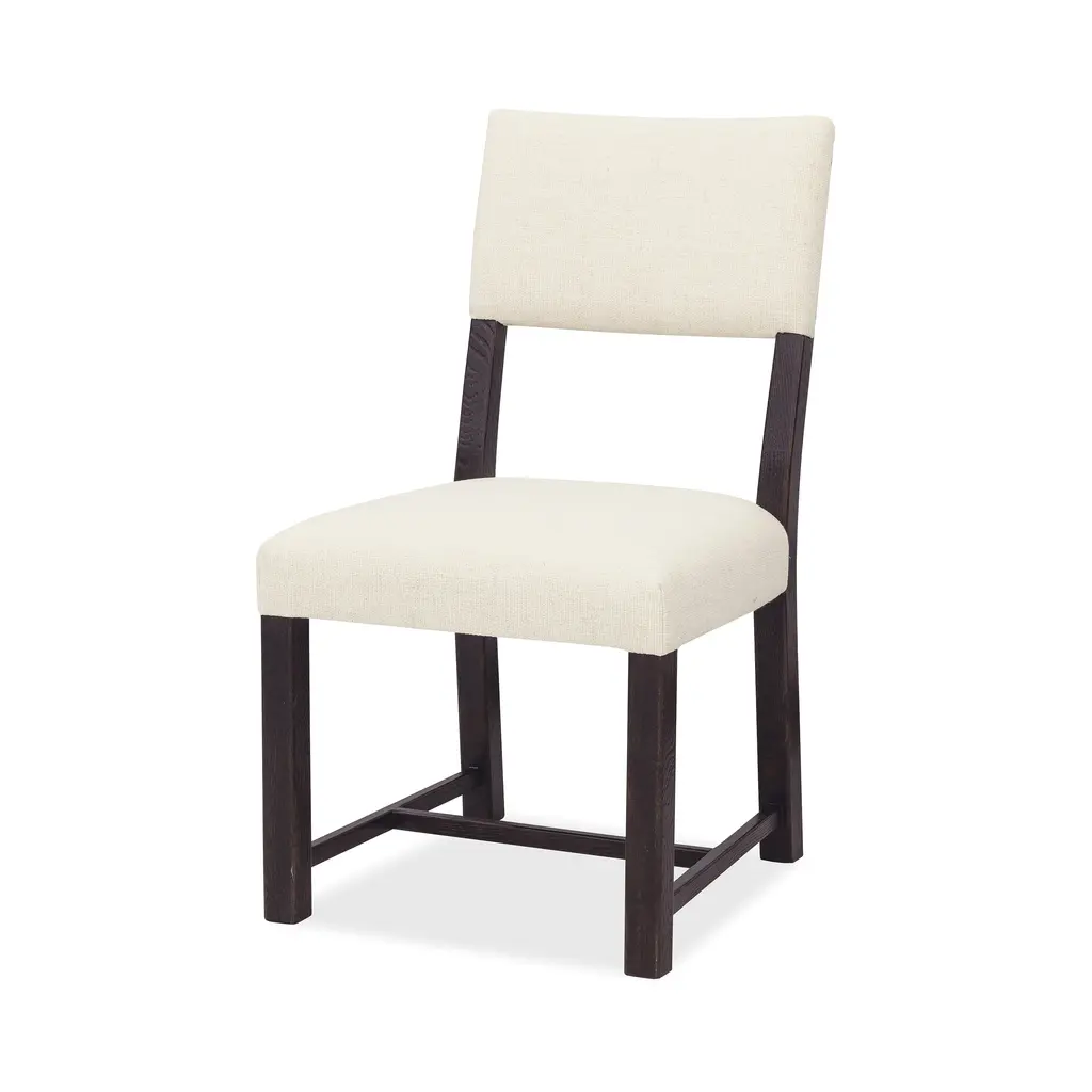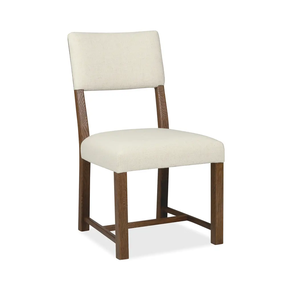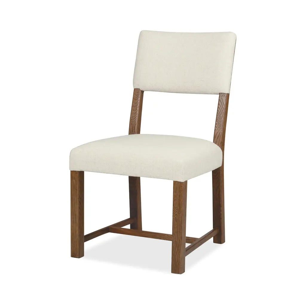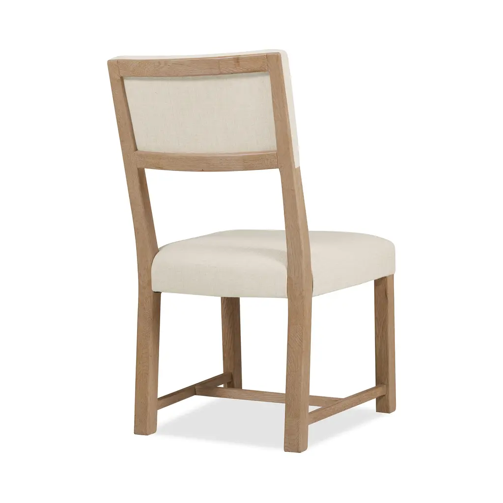 A perfect blend of rustic charm and upholstered comfort, the Driftwood Upholstered Side Chair from Hooker Furniture offers a warm, inviting seat for the dining room. This unique chair is crafted from solid oak with a distressed, timeworn finish that adds a touch of heritage character. The design features a distinctive open back, creating a light and airy silhouette. With a comfortable, fabric-upholstered seat and back and a versatile armless profile, it’s a stylish choice for any cozy dining space. Highlights: