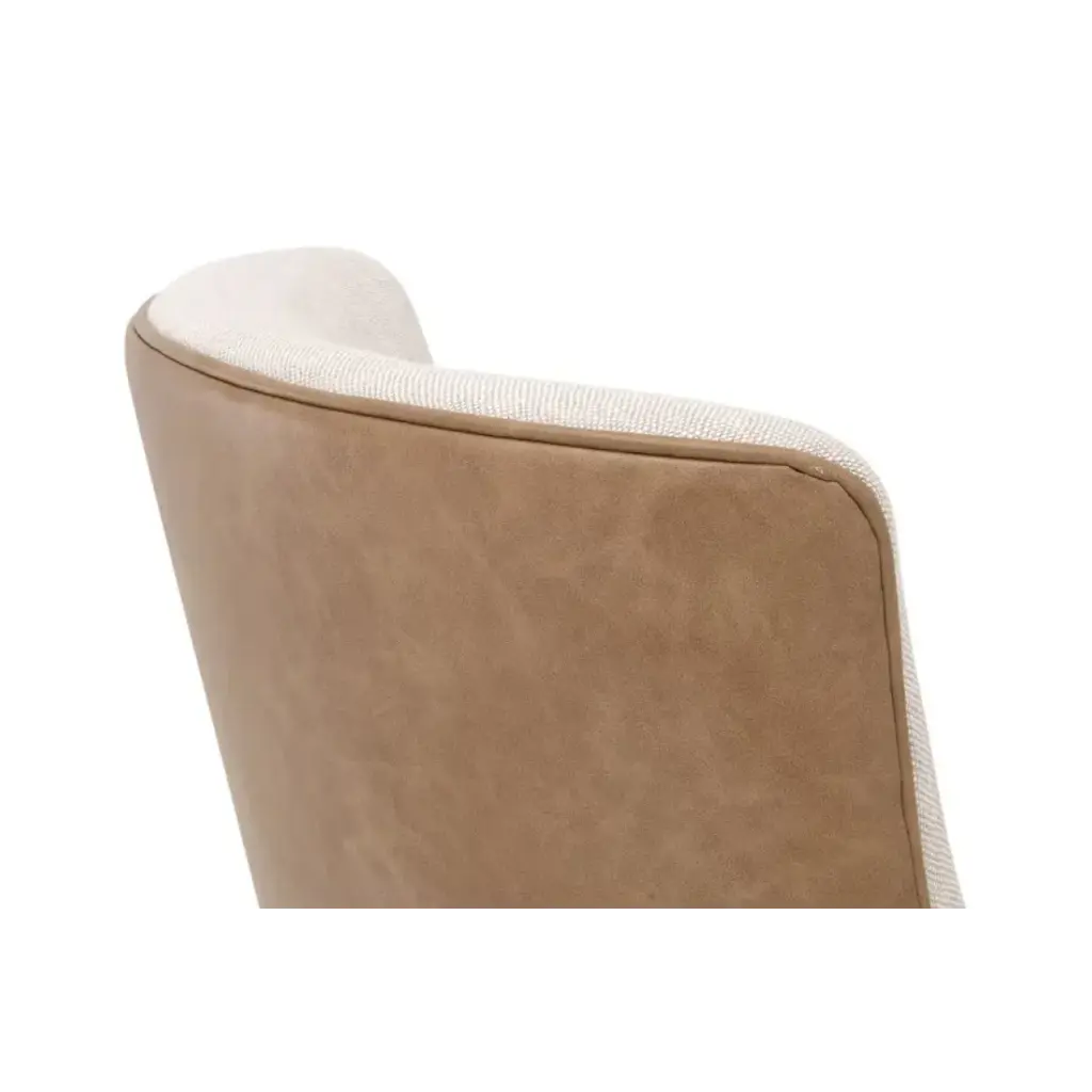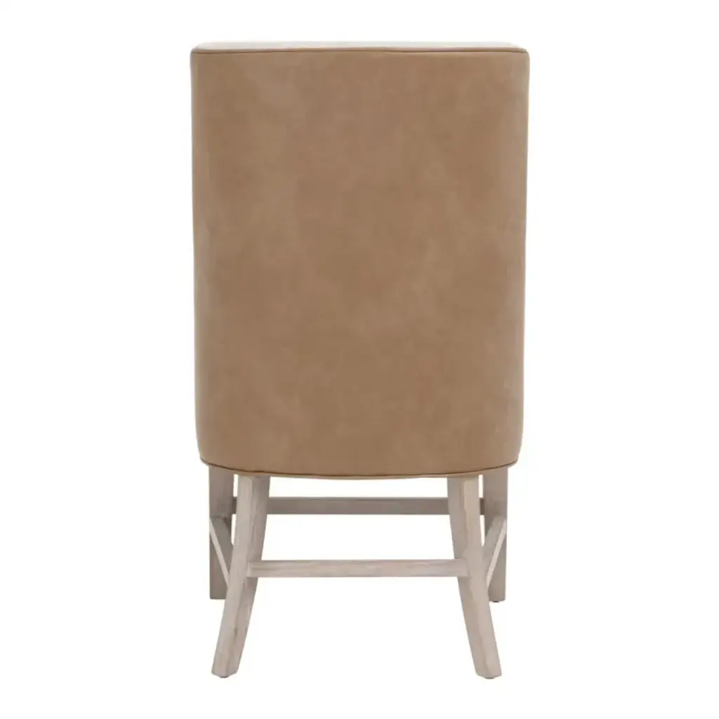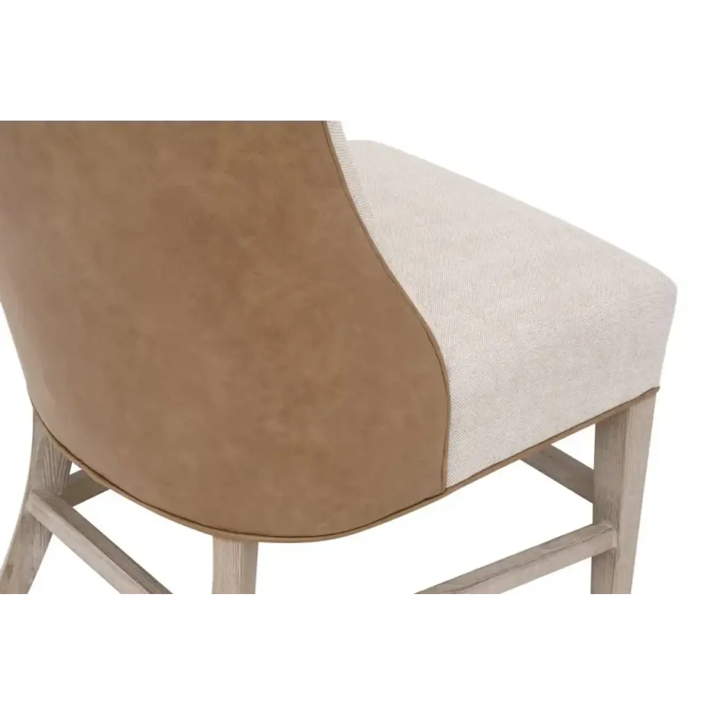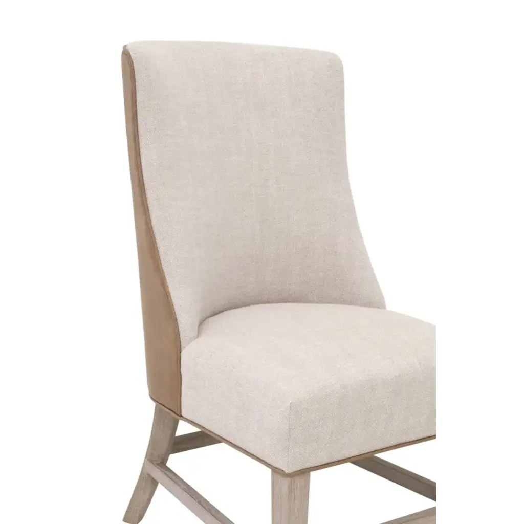 The elegant Duet Head Chair by Essentials For Living features a visually appealing two-tone design that is unique and sure to stand out. The frame, crafted from solid ash wood with a natural gray finish, offers a sturdy foundation with its leg stretchers. Upholstered in a performance Bisque French Linen blend on the front and Ivanhoe Toast vegan leather on the back, the chair combines sophistication with durability. Stain-resistant treatment ensures easy maintenance, while contrast edge piping adds a refined touch. With a seat height of 20.5" and over all dimensions of 22†wide, 29.5†deep, and 40.75†high, it is a perfect solution for capping off the ends of a dining table.