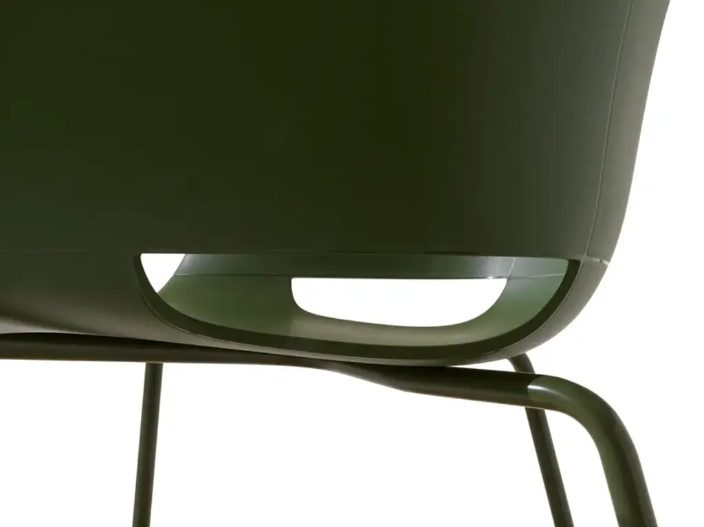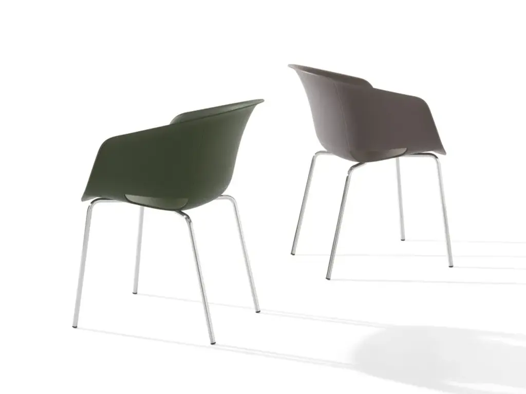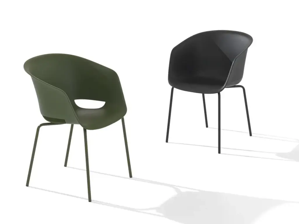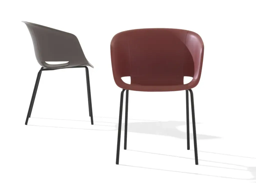 Dunk 1190 is a chair with polypropylene shell and steel tube legs.With its ductile and eclectic multifaceted soul, the Dunk armchair becomes even more versatile. The polypropylene shell is available in two versions, with and without holes and with different types of frames. The collection’s green soul is highlighted by the marsala-coloured version in recycled polypropylene (r-PP) made from post-consumer materials.The new versions feature a shell with either an upholstered seat, or else fully upholstered and two new frames: four wooden and rocking legs. The range of use becomes truly infinite.