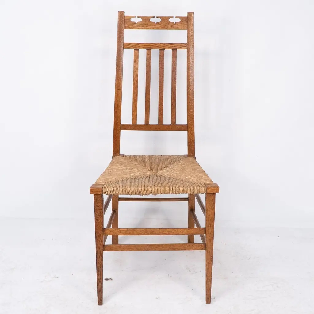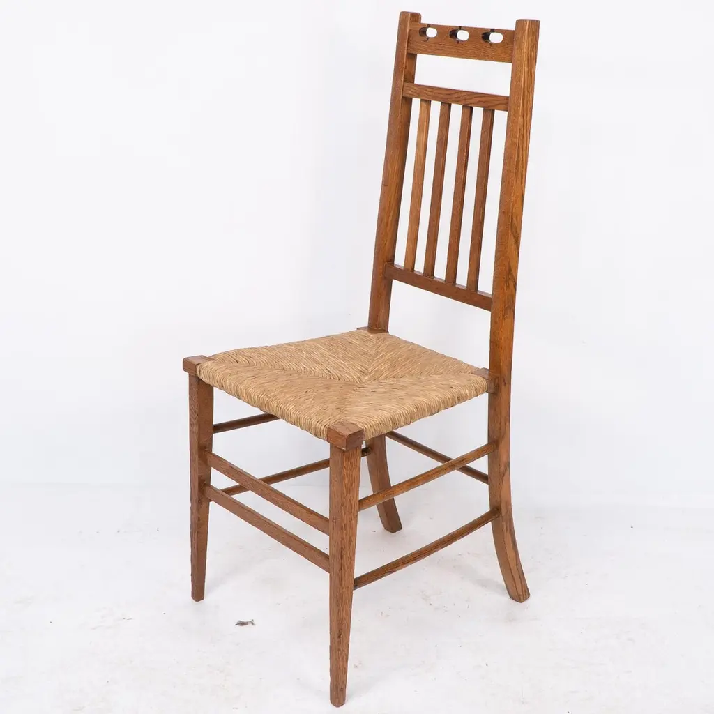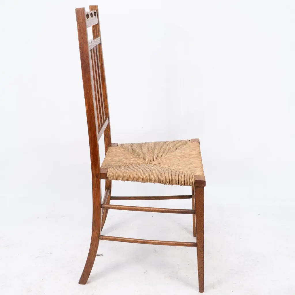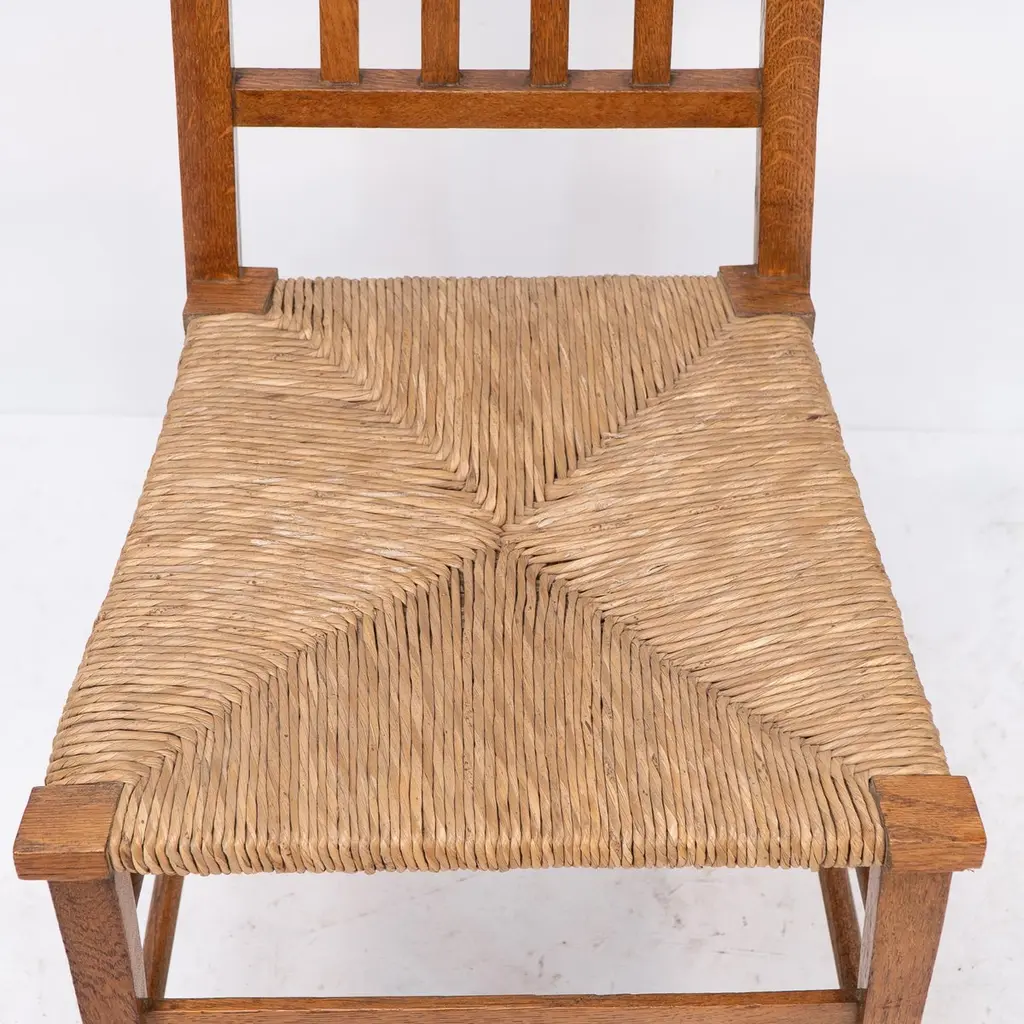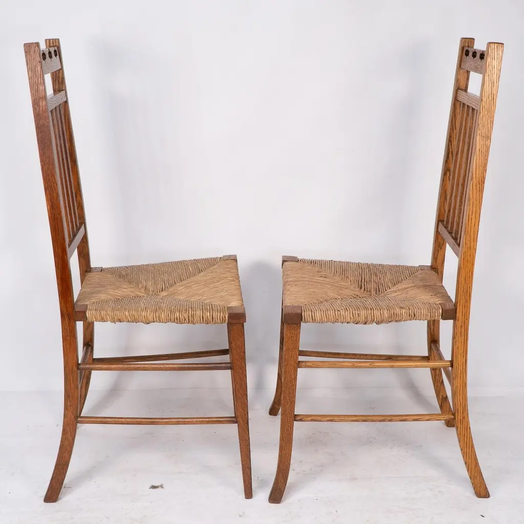 E A Taylor attributed a pair of rush seated side or bedroom chairs made by Wylie and Lochhead. One has straight front legs and one has the slightly splayed front legs, both chairs have been professionally restored and recently re-rushed..