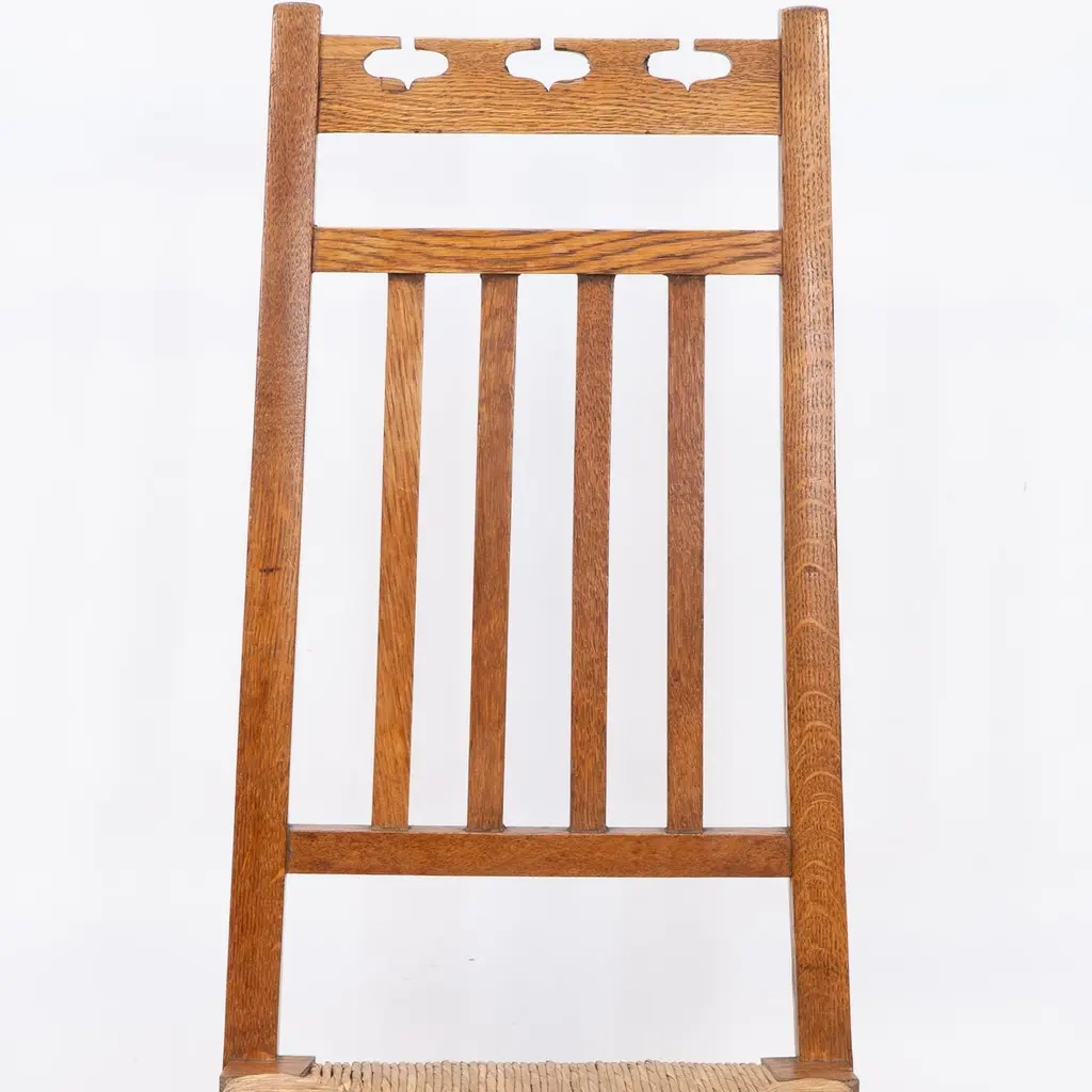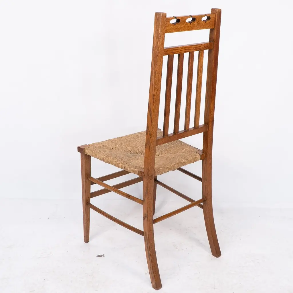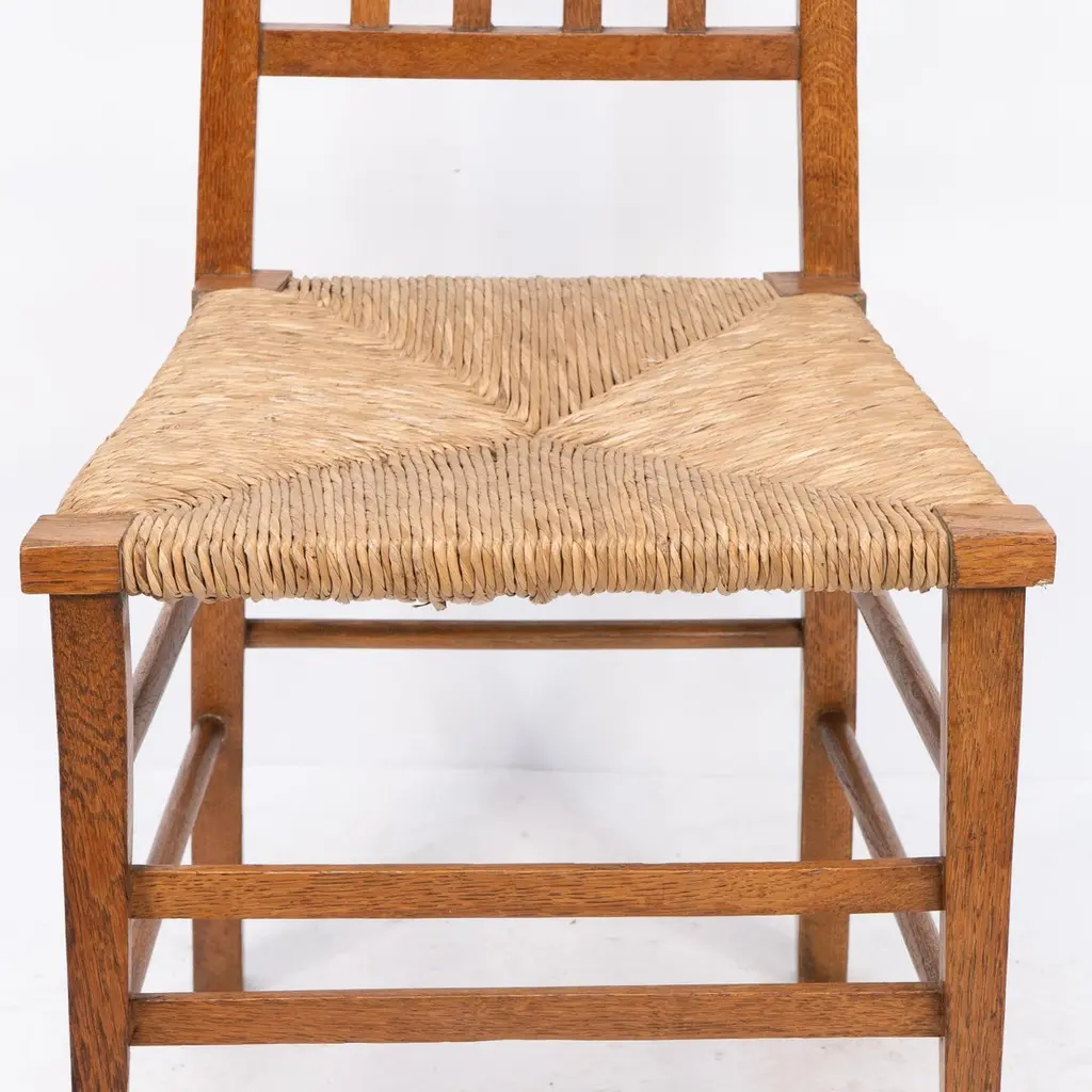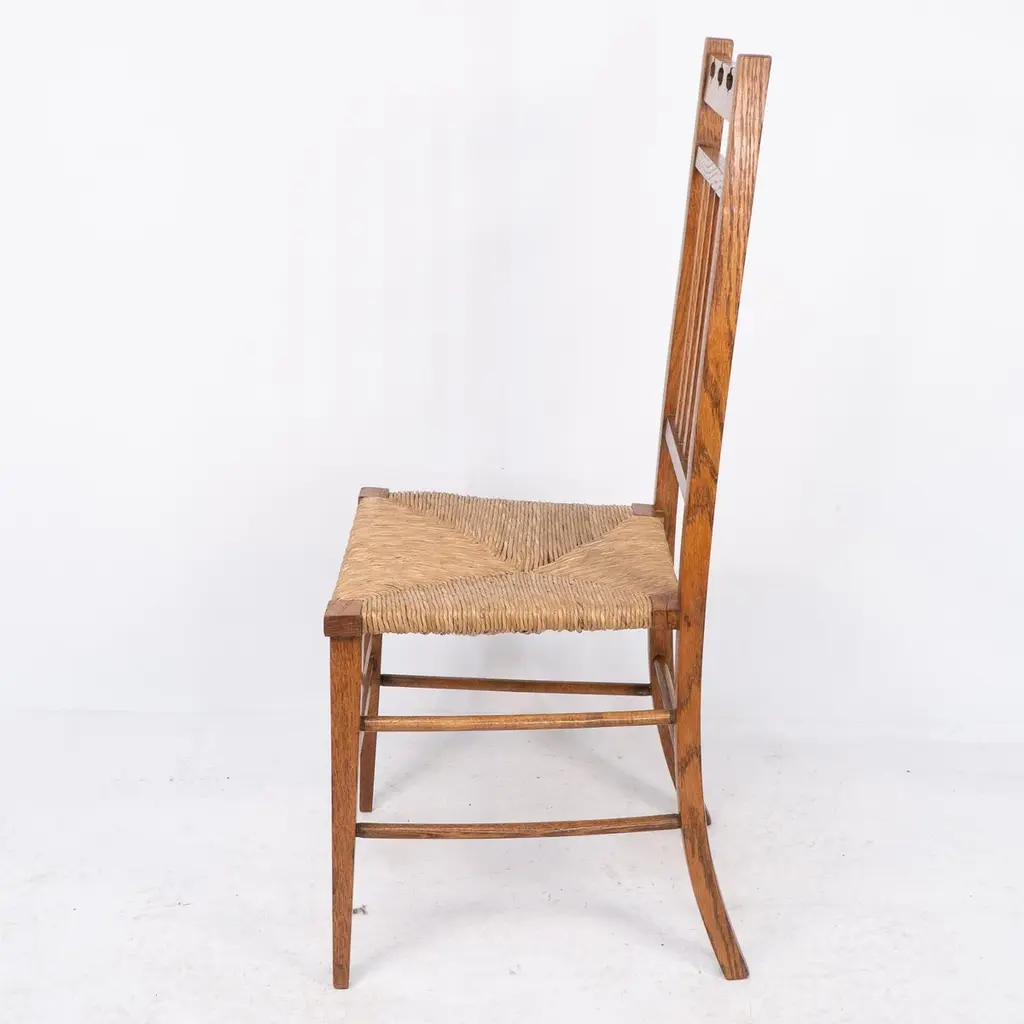 E A Taylor attributed a pair of rush seated side or bedroom chairs made by Wylie and Lochhead. One has straight front legs and one has the slightly splayed front legs, both chairs have been professionally restored and recently re-rushed..