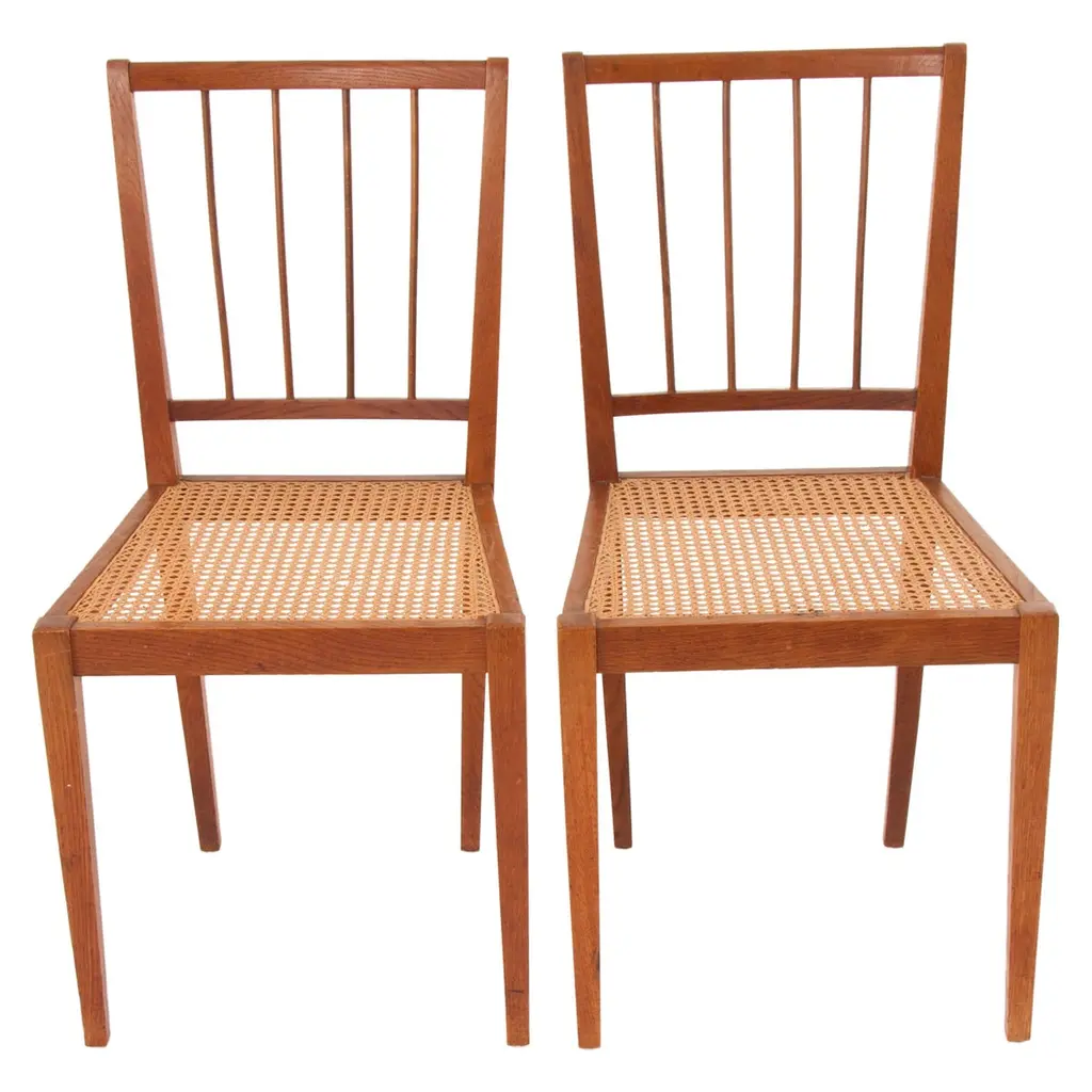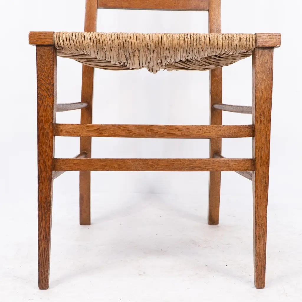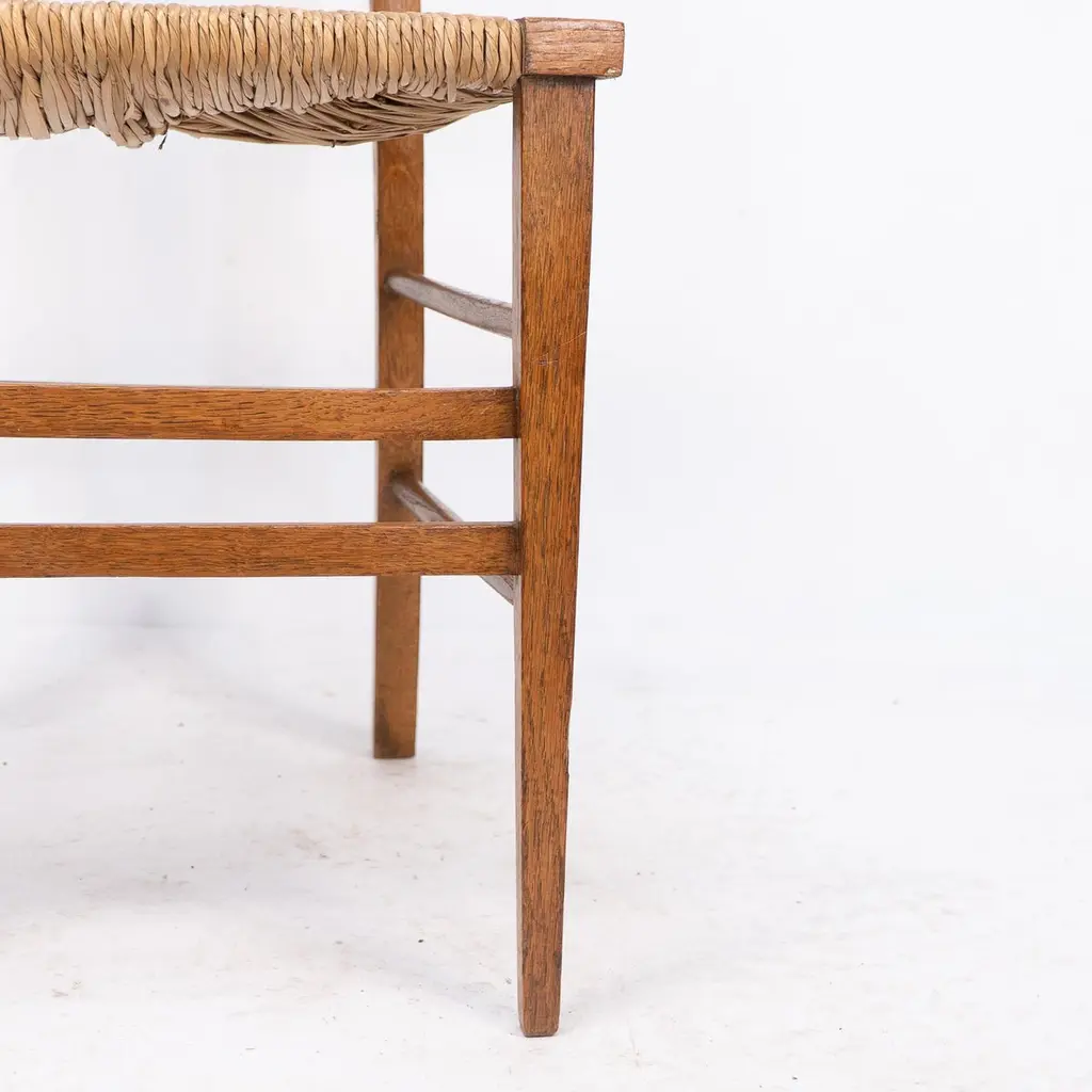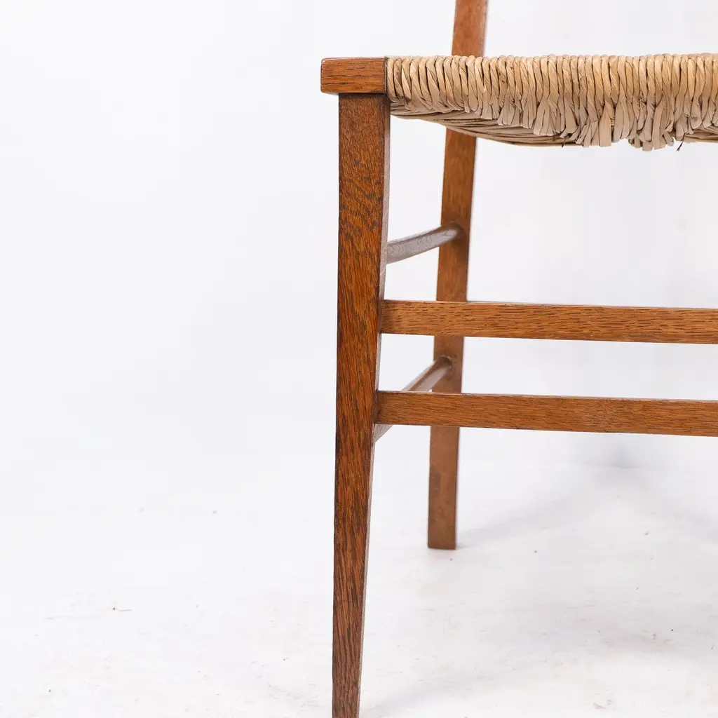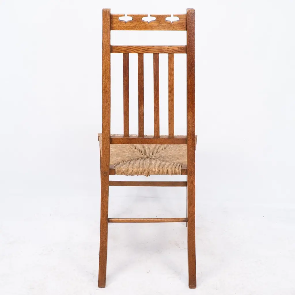 E A Taylor attributed a pair of rush seated side or bedroom chairs made by Wylie and Lochhead. One has straight front legs and one has the slightly splayed front legs, both chairs have been professionally restored and recently re-rushed..