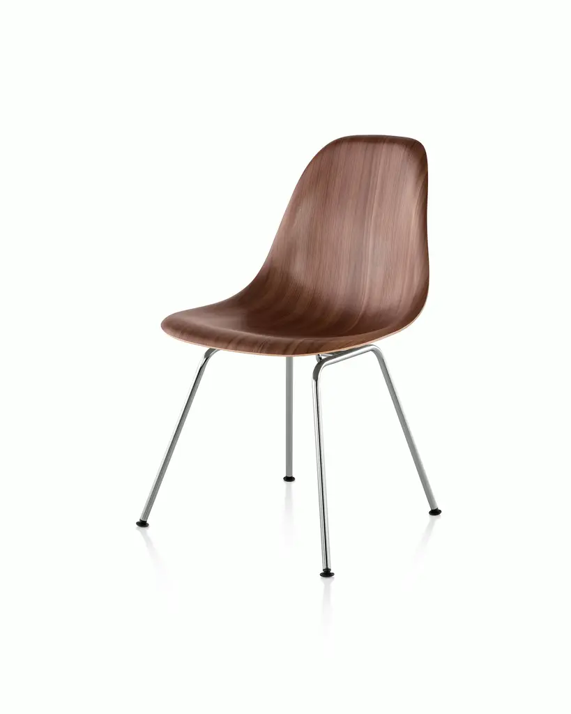Charles and Ray Eames adapted molding techniques developed during World War II to produce their classic shell's simple, gracious form. The Eames Molded Plywood Side Chair comes in various wood finishes and a range of base options. Opt for an attached seat pad for enhanced comfort. This molded plywood office chair is an authentic Eames design made by Herman Miller.