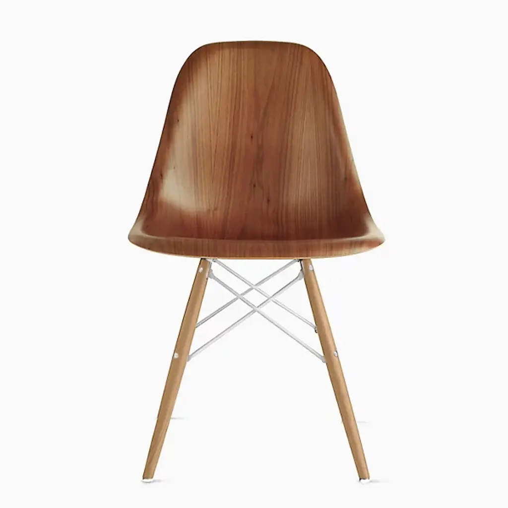 Molded plywood evolved. The Eames® Molded Wood Side Chair - Wood Dowel Base by Herman Miller® is a modern creation designed in honor of the discovery and evolution that Charles and Ray Eames so greatly valued. Advanced 3-D technology allows for deep curves that don't compromise the integrity of the plywood. This smooth seat is paired with wood dowel legs.