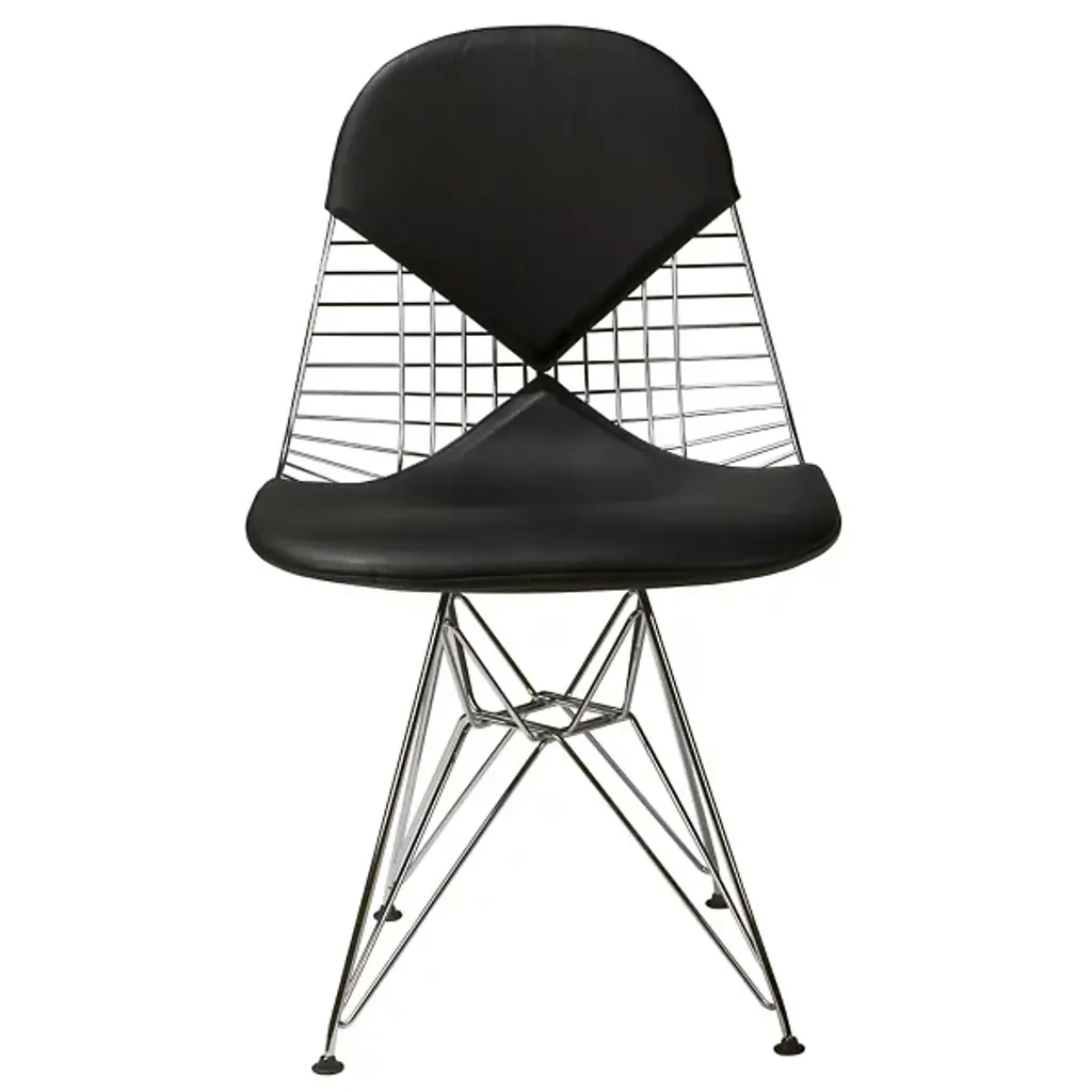 While refining the design of their molded shell chairs, Charles and Ray Eames began experimenting with bent and welded wire. The resulting Wire Chair (1951) borrows the shell shape but reimagines the form in strands of steel. Each seat features two gauges of the material, a mixture that adds strength but keeps manufacturing costs low. This is an authentic Eames Wire Chair by Herman Miller.
