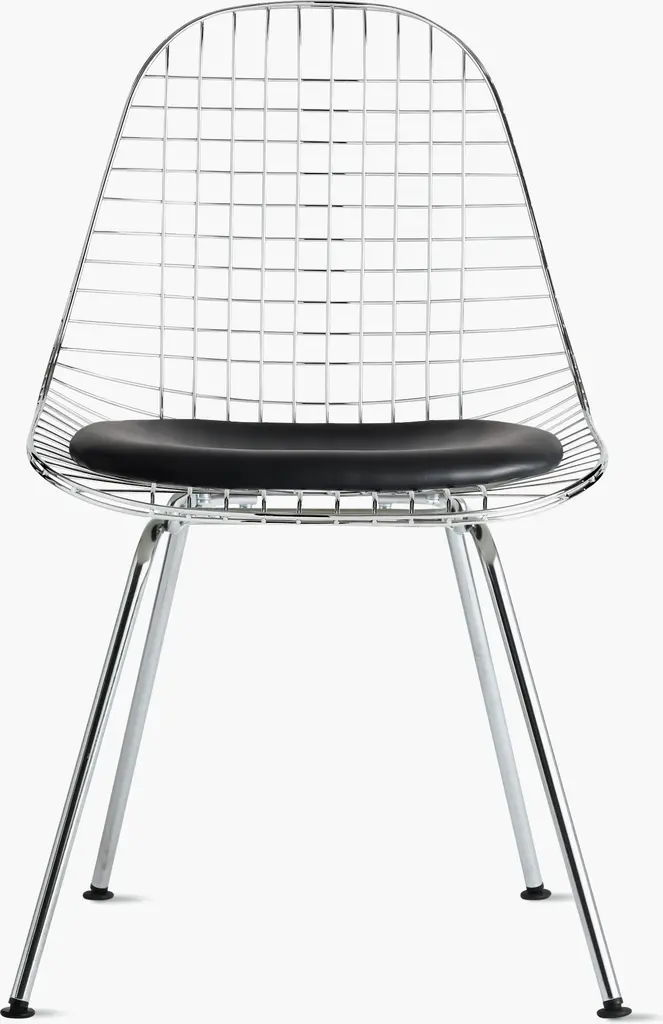 While refining the design of their molded shell chairs, Charles and Ray Eames began experimenting with bent and welded wire. The resulting Wire Chair (1951) borrows the shell shape but reimagines the form in strands of steel. Each seat features two gauges of the material, a mixture that adds strength but keeps manufacturing costs low. This is an authentic Eames Wire Chair by Herman Miller.