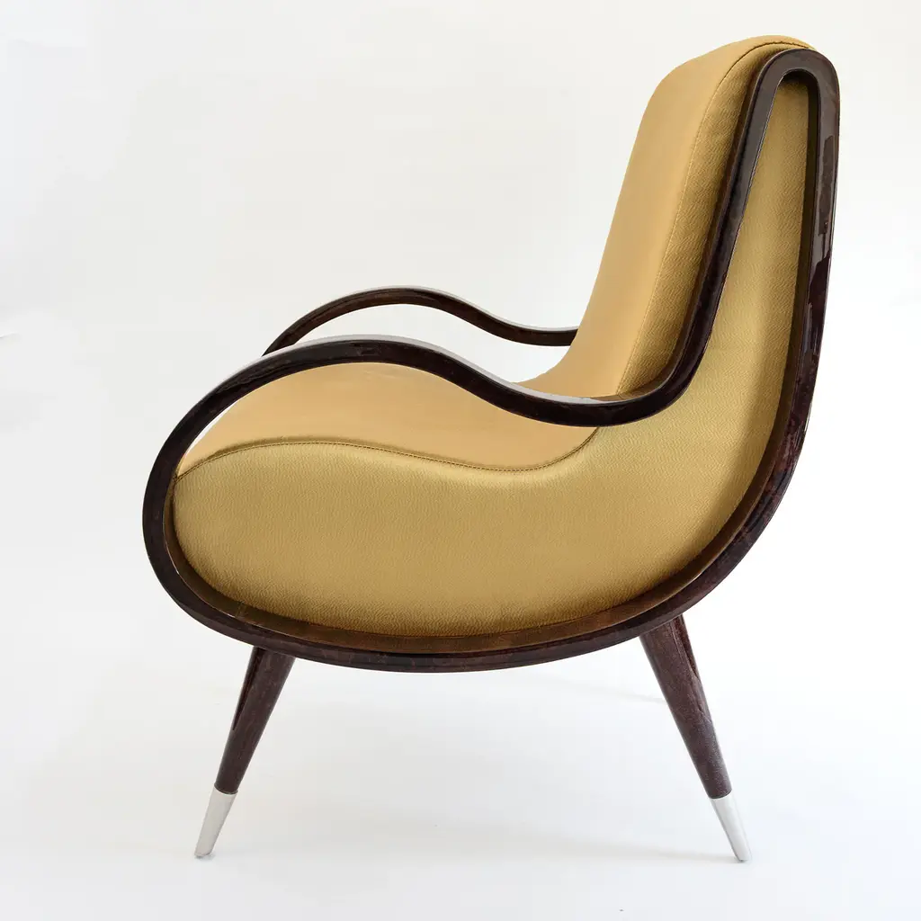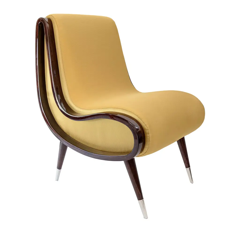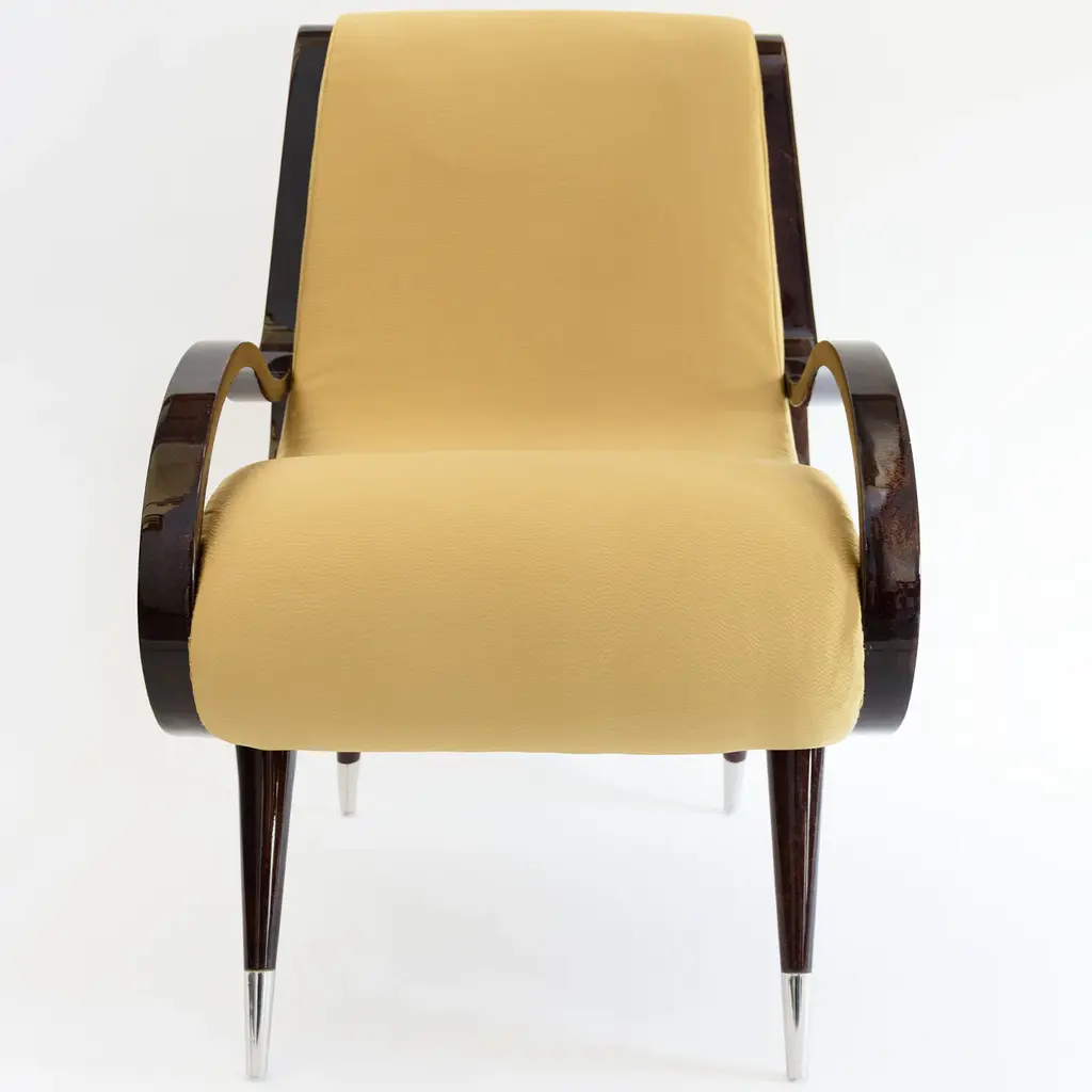 Part of the Eclipse Collection, this elegant dining armchair features a curved silhouette finished with glossy mocha parchment (col. 008) raised on four conical feet accented with steel ferules. Both sides are accented with a single tear-drop piece that follows the profile of the chair and opens delicately towards the front to create a support for the arms. Providing a comfortable embrace, the sophisticated curve of the seating is upholstered with a refined fabric in soft gold. Designed to complete the Eclipse table, this armchair will look perfect in a bedroom or private office.