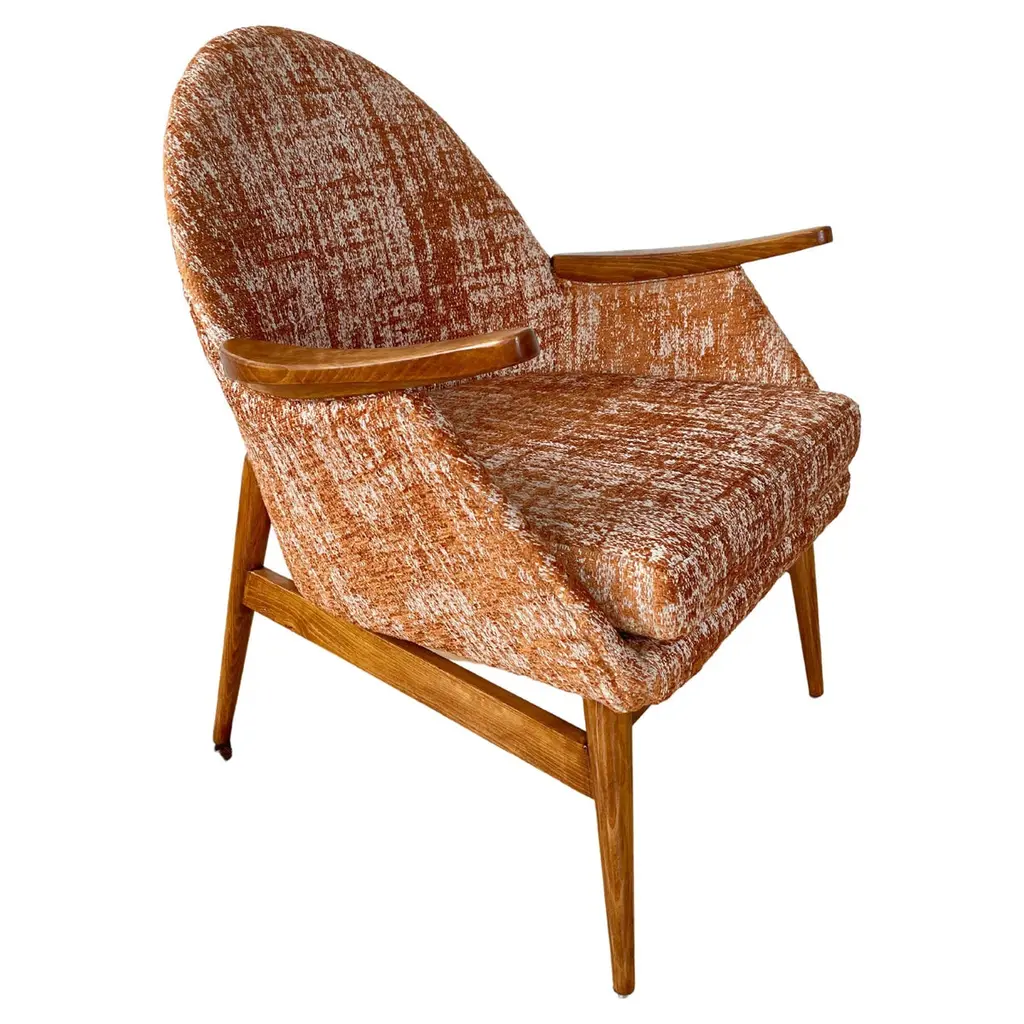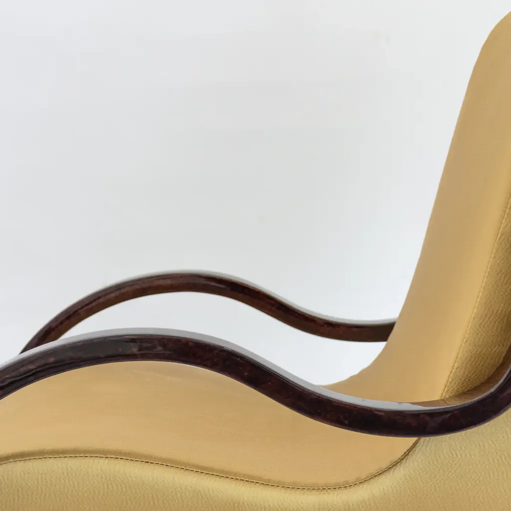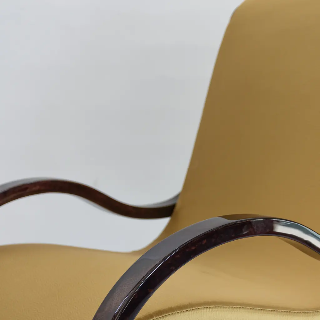 Part of the Eclipse Collection, this elegant dining armchair features a curved silhouette finished with glossy mocha parchment (col. 008) raised on four conical feet accented with steel ferules. Both sides are accented with a single tear-drop piece that follows the profile of the chair and opens delicately towards the front to create a support for the arms. Providing a comfortable embrace, the sophisticated curve of the seating is upholstered with a refined fabric in soft gold. Designed to complete the Eclipse table, this armchair will look perfect in a bedroom or private office.