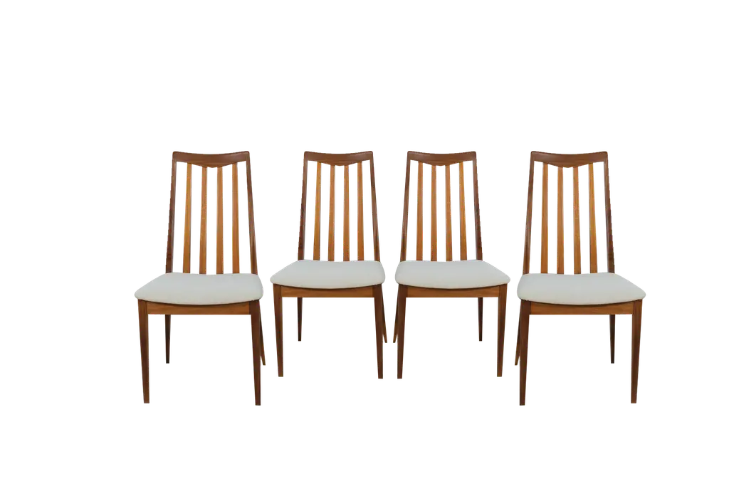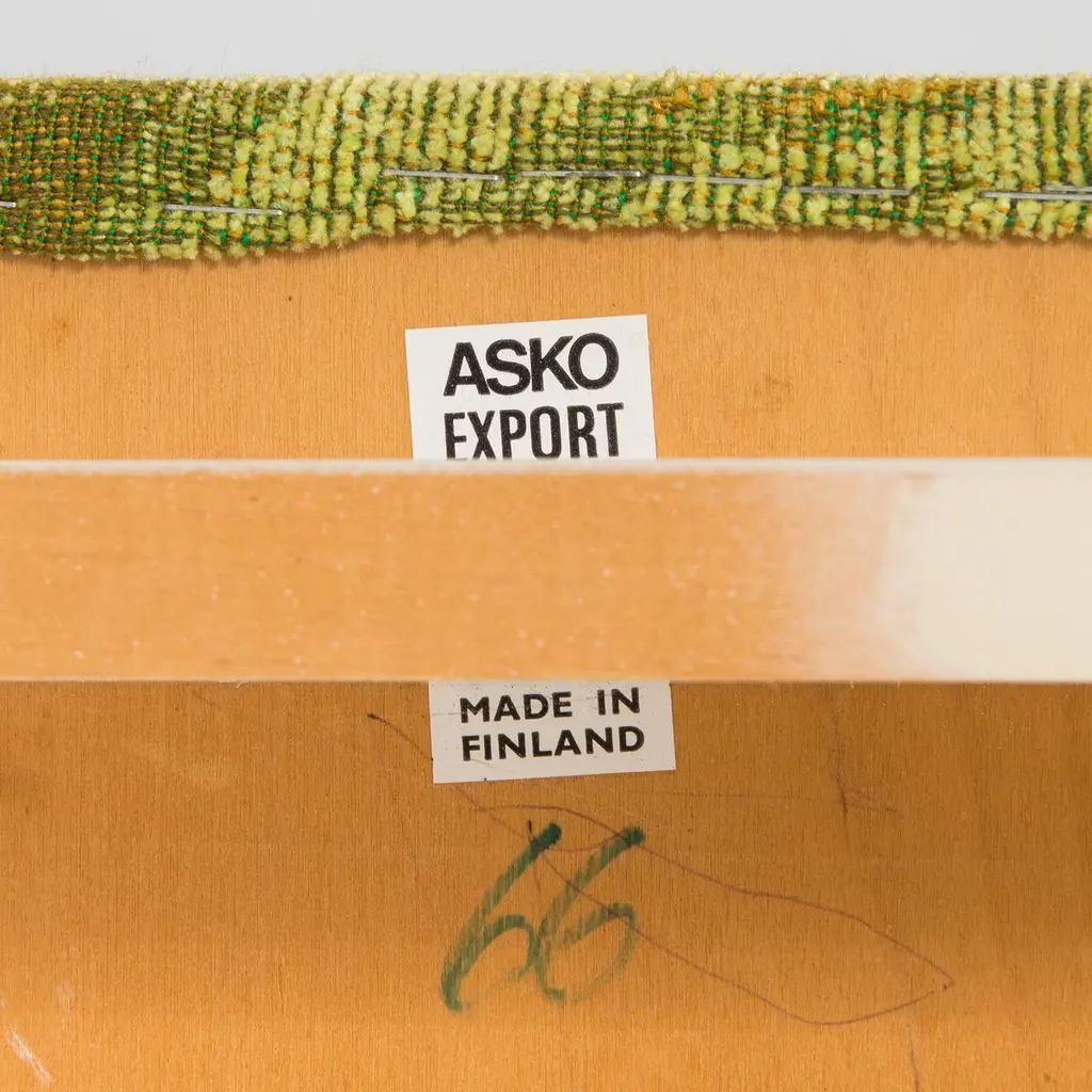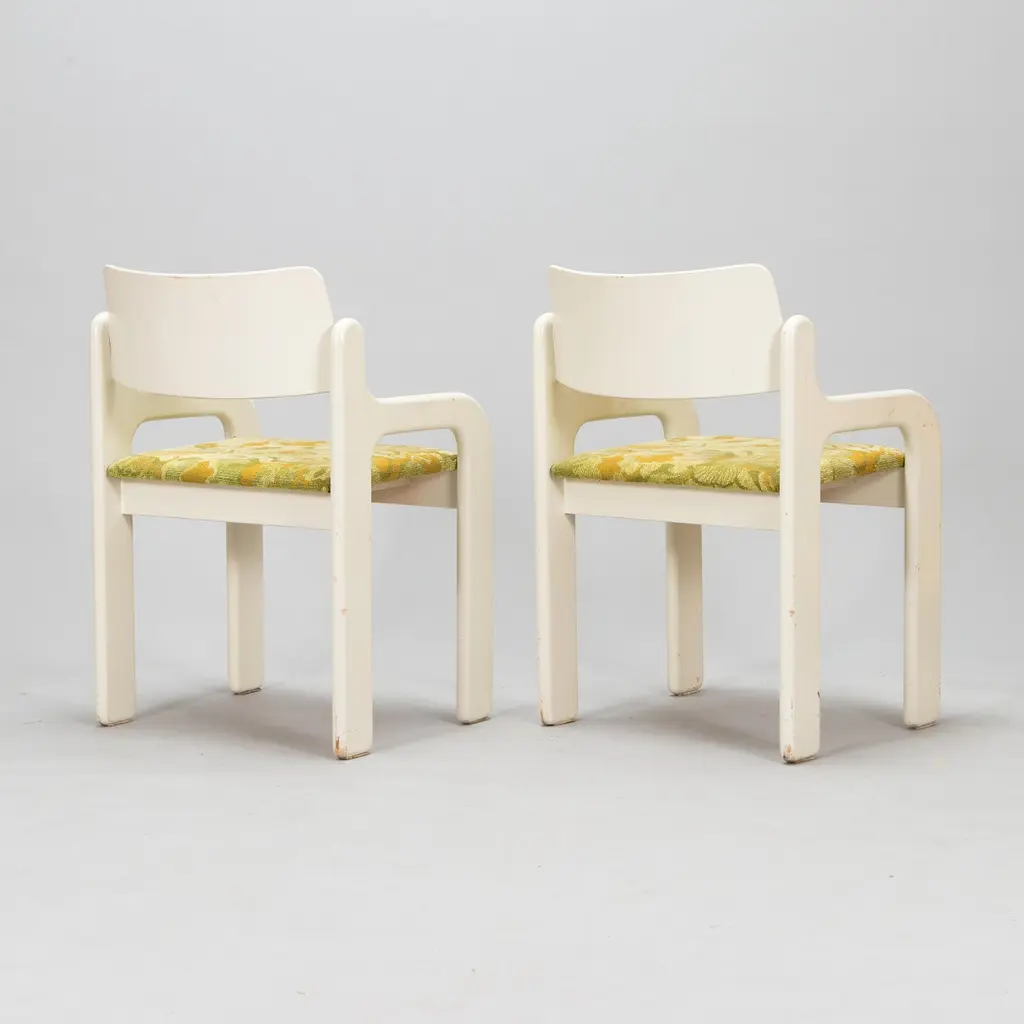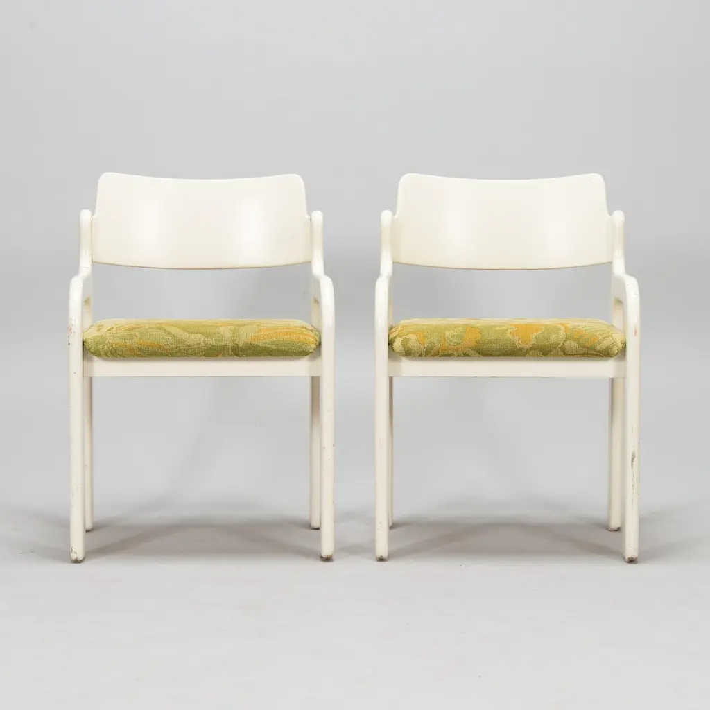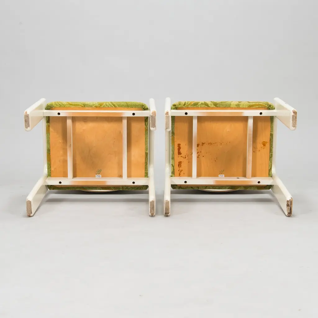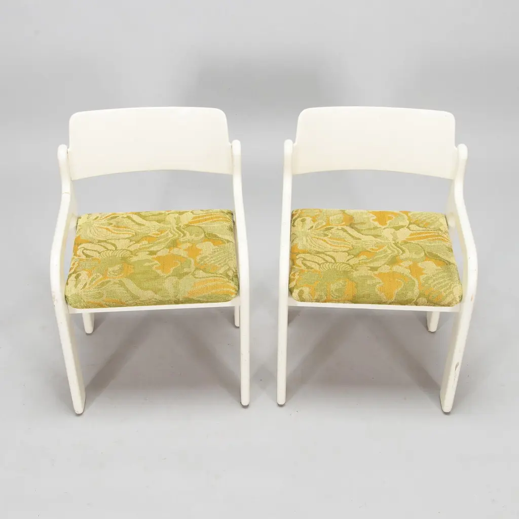 A set of 4 Iconic "Flamingo" chairs by Eero Arnio for Asko Finland White painted wood , some paint chips see photos. Vintage yellow fabric.Born in Helsinki in 1932 Eero Aarnio studied interior and industrial design and worked for Tapiovaara and Asko before launching his own studio. His work has been used a lot in films, videos and fashion shoots. Aarnio won several awards and is shown in a lot of musea arround the world. Up to today he is still practicing from his studio in Helsinki.The flamingo chairs are probably most well known as a complete dining table set, together with a sideboard and extendable dining table.