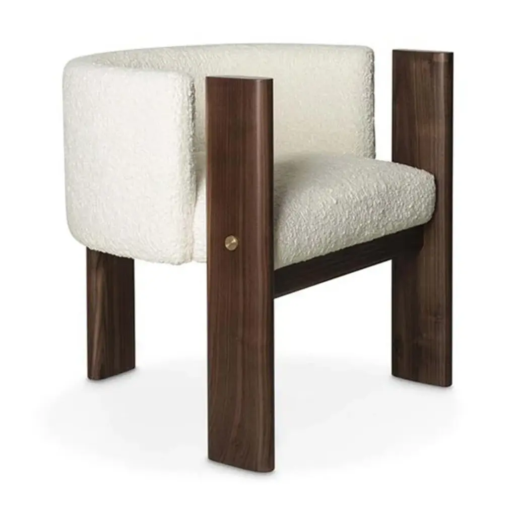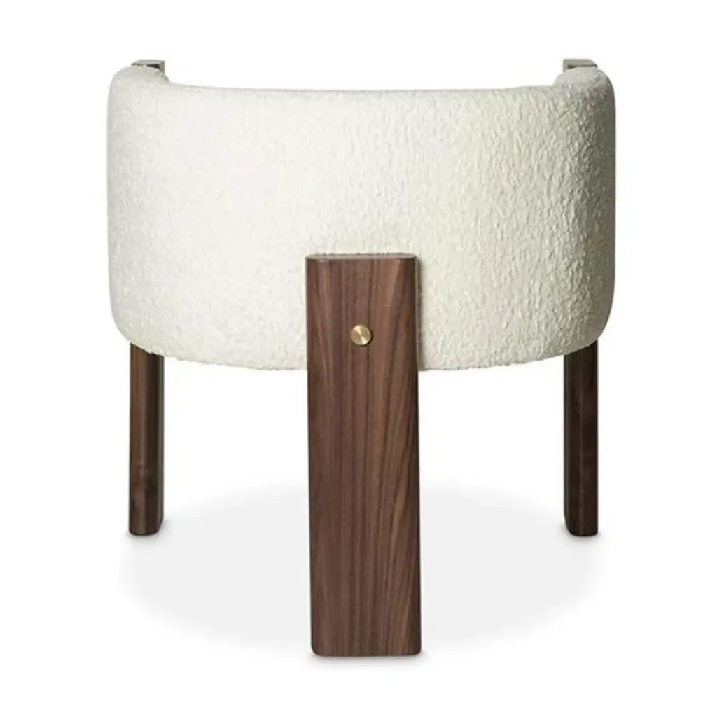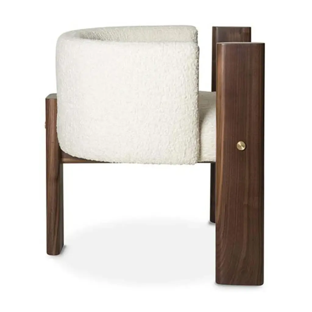 With solid walnut timber and solid brass detail, the modern Malta dining room chair was designed by Egg Designs. It is upholstered in a very on-trend boucle fabric.