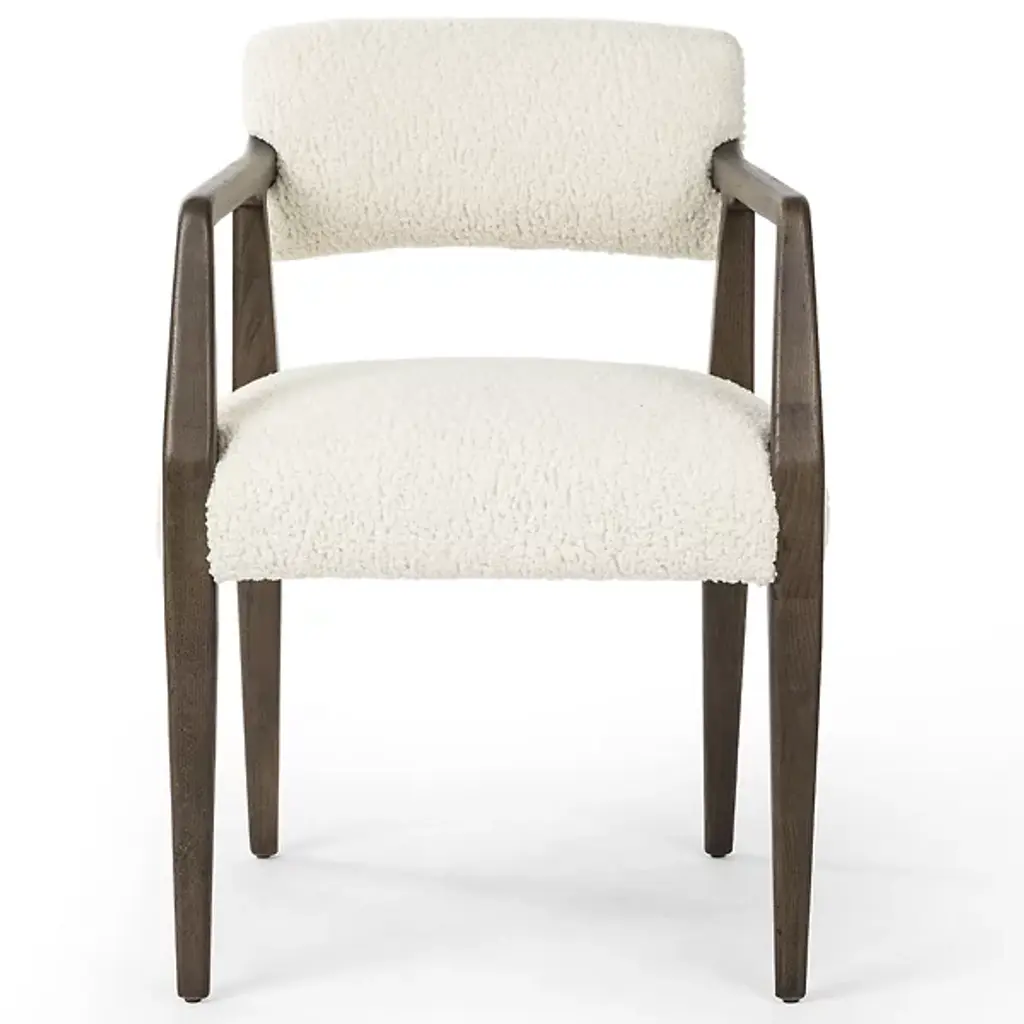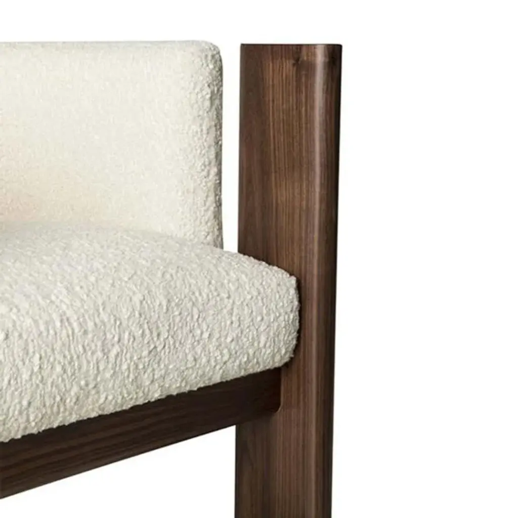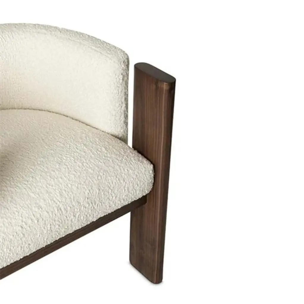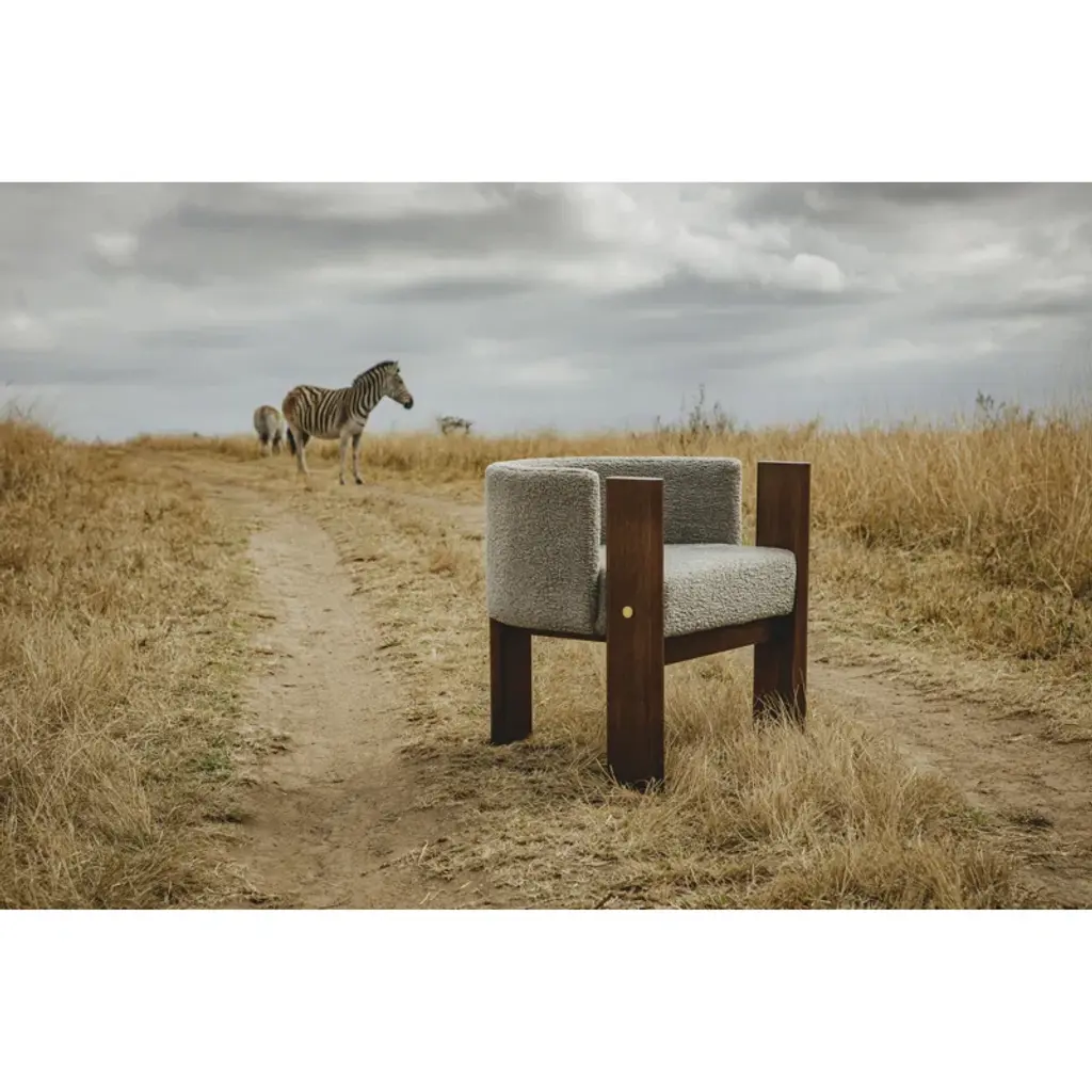 With solid walnut timber and solid brass detail, the modern Malta dining room chair was designed by Egg Designs. It is upholstered in a very on-trend boucle fabric.
