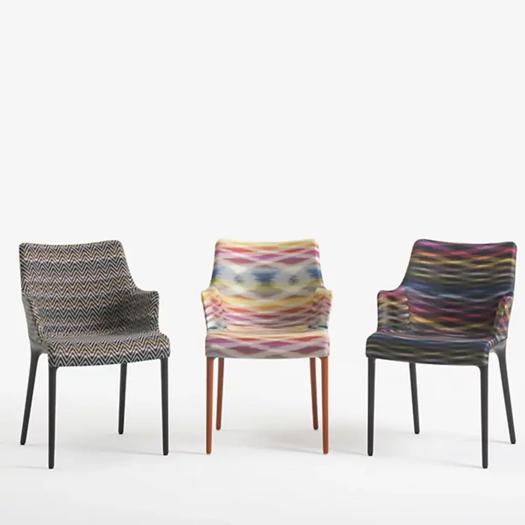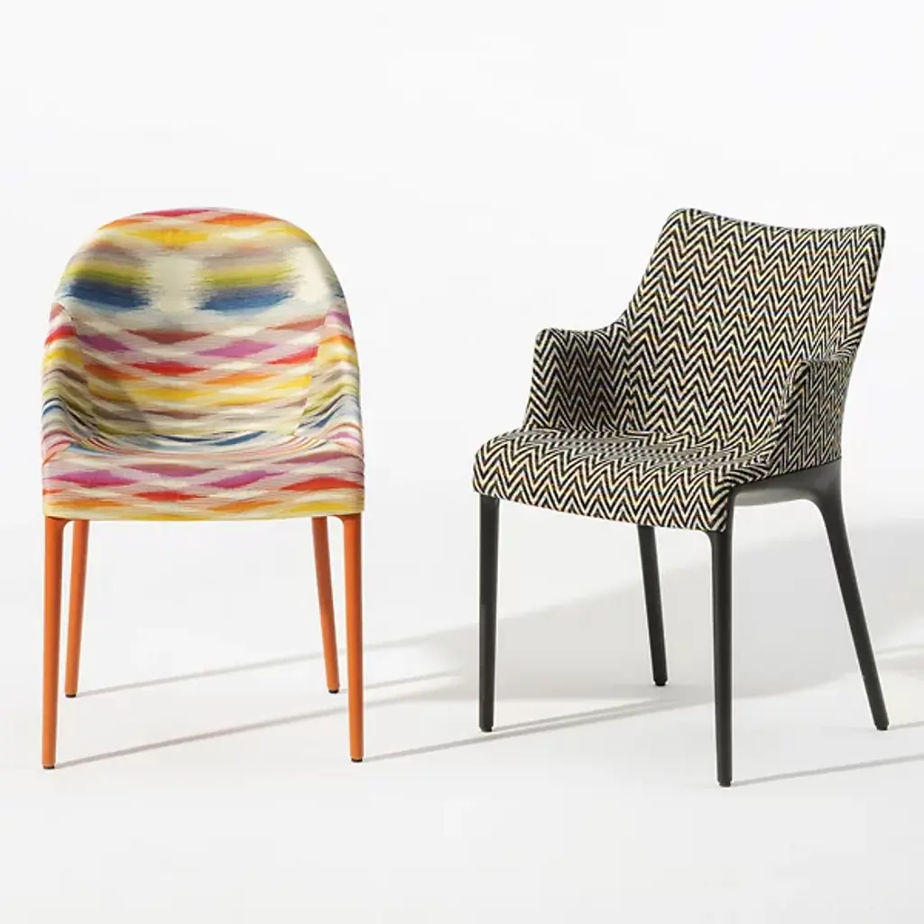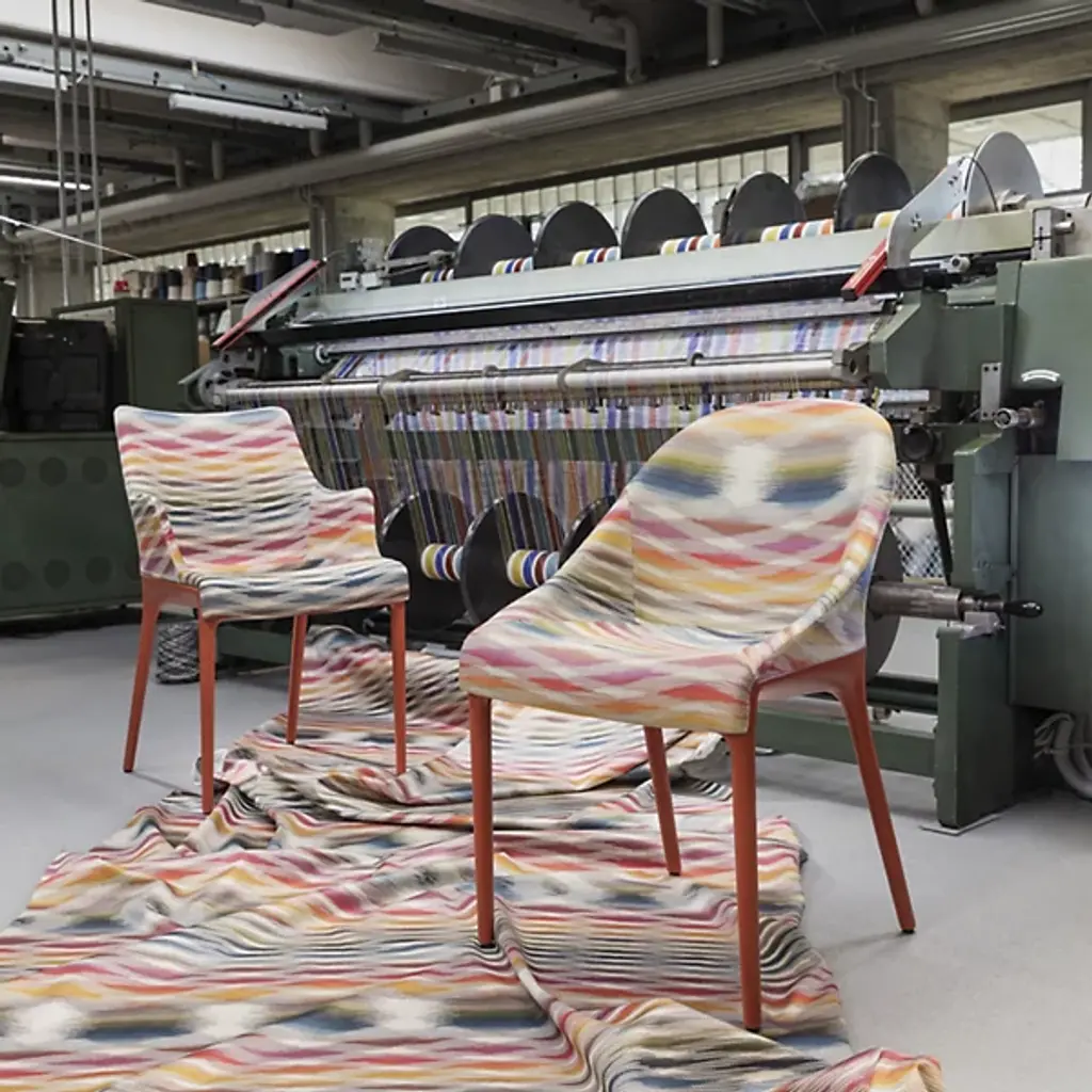 The Eleganza Ela Missoni Arm Chair from Kartell marries fashion innovation with environmental responsibility. This Philippe Starck design uses post-industrial recycled thermoplastic technopolymer created from Illy coffee pods for its frame. The seat features Missoni's famous geometric patterns adapted for furniture, upholstered in 100% cotton over polyurethane padding. This chair represents a groundbreaking partnership between Kartell and Illy, with nearly two years of development needed to achieve the quality standards necessary to turn coffee pod waste into furniture that’s perfect for dining rooms, home offices, or as accent seating.