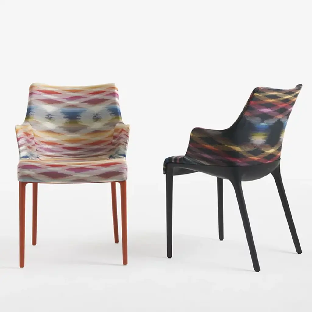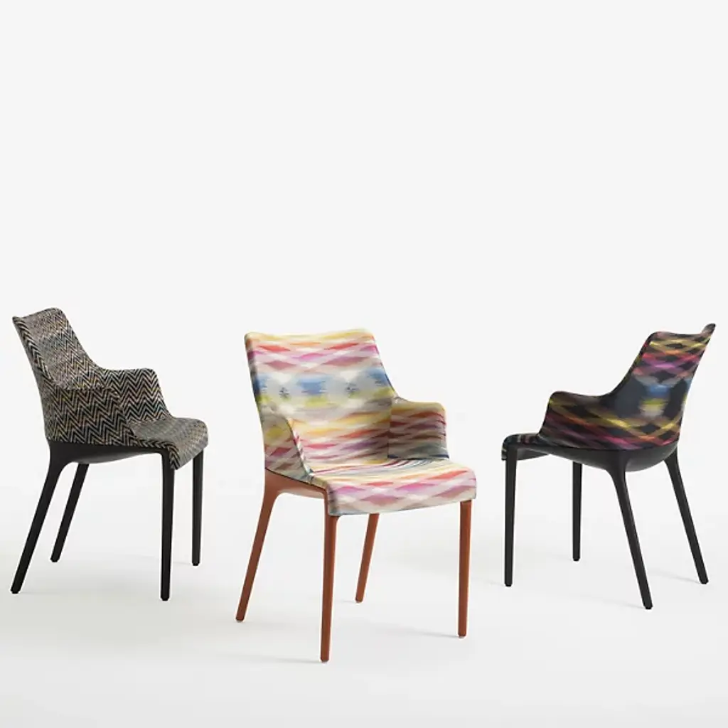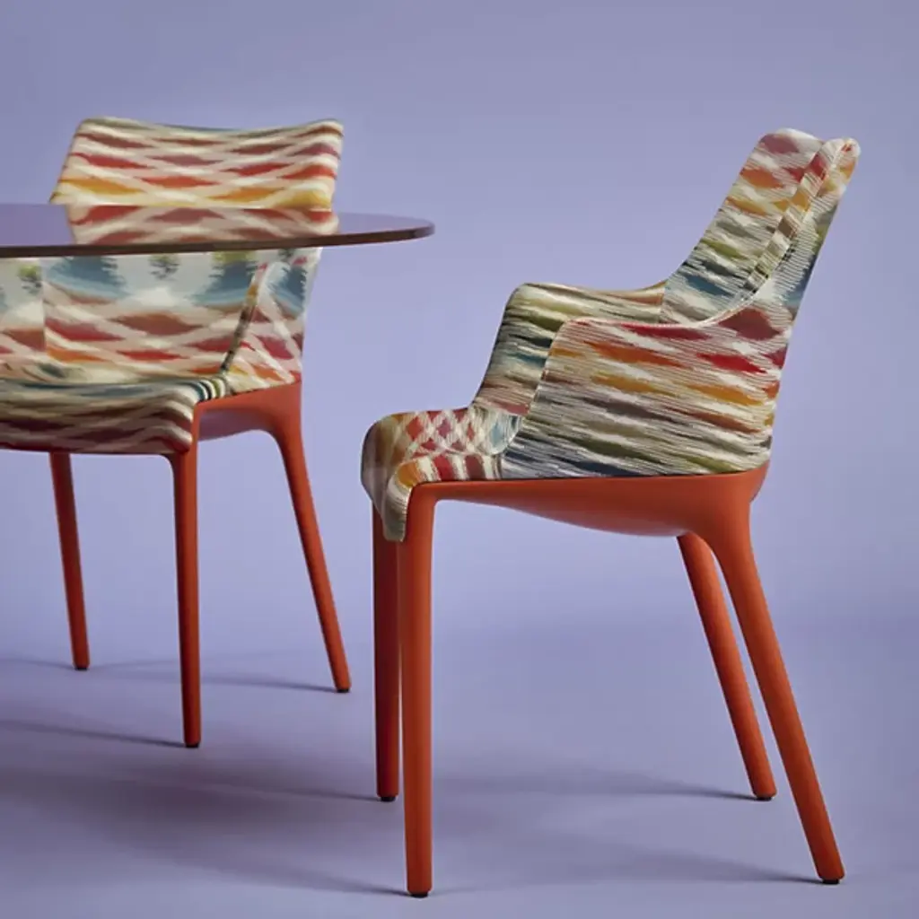 The Eleganza Ela Missoni Arm Chair from Kartell marries fashion innovation with environmental responsibility. This Philippe Starck design uses post-industrial recycled thermoplastic technopolymer created from Illy coffee pods for its frame. The seat features Missoni's famous geometric patterns adapted for furniture, upholstered in 100% cotton over polyurethane padding. This chair represents a groundbreaking partnership between Kartell and Illy, with nearly two years of development needed to achieve the quality standards necessary to turn coffee pod waste into furniture that’s perfect for dining rooms, home offices, or as accent seating.