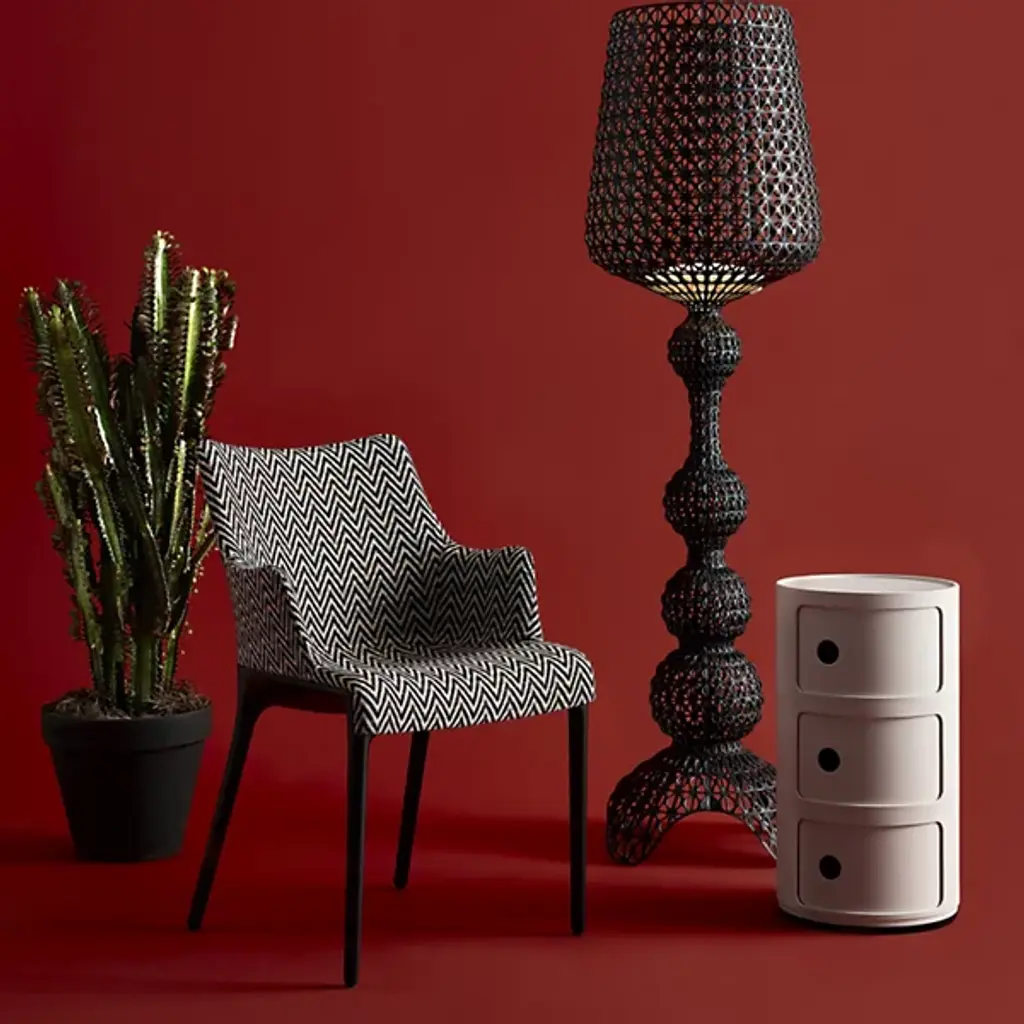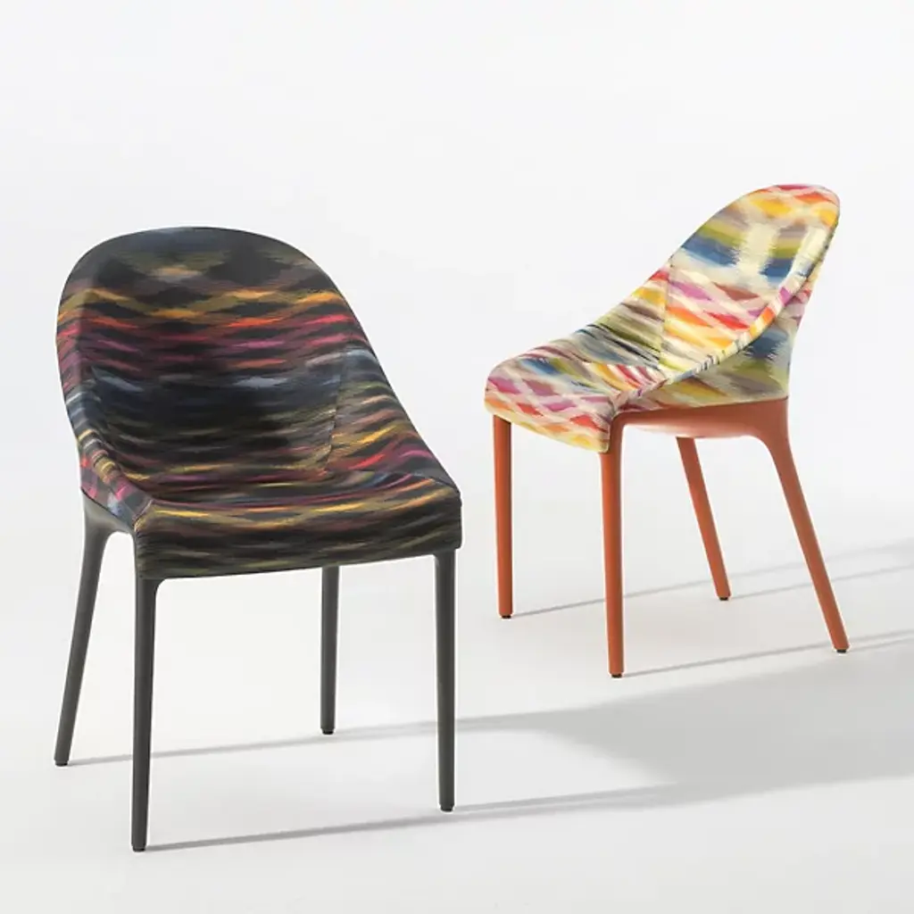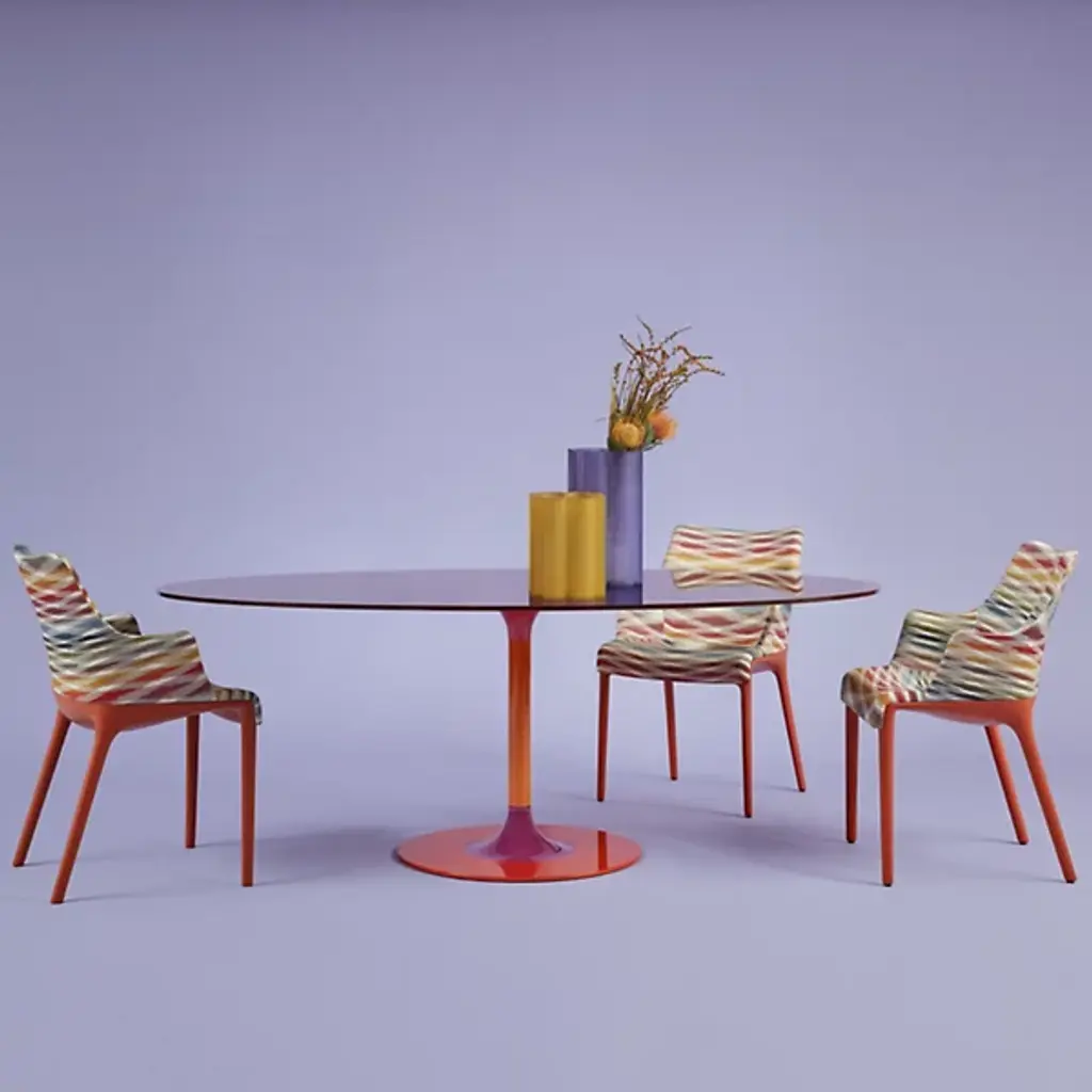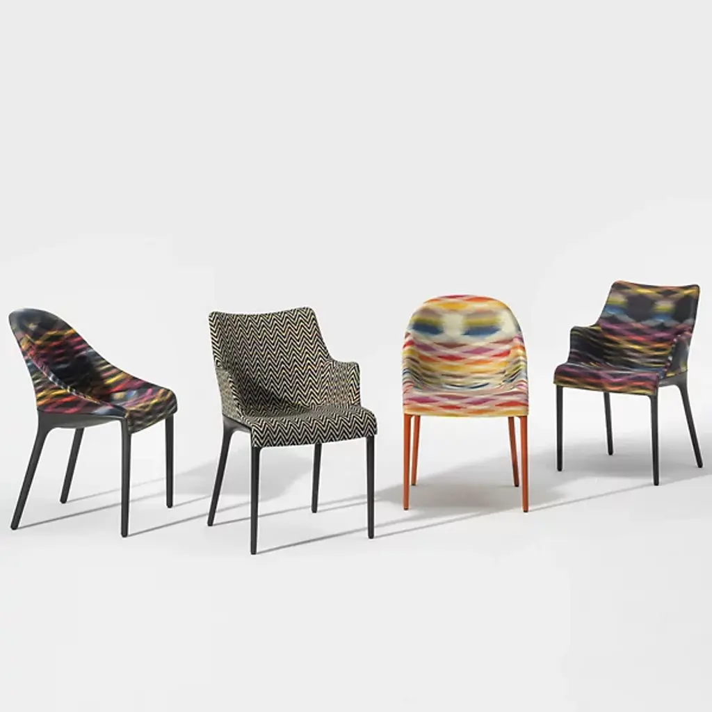 The Eleganza Ela Missoni Arm Chair from Kartell marries fashion innovation with environmental responsibility. This Philippe Starck design uses post-industrial recycled thermoplastic technopolymer created from Illy coffee pods for its frame. The seat features Missoni's famous geometric patterns adapted for furniture, upholstered in 100% cotton over polyurethane padding. This chair represents a groundbreaking partnership between Kartell and Illy, with nearly two years of development needed to achieve the quality standards necessary to turn coffee pod waste into furniture that’s perfect for dining rooms, home offices, or as accent seating.