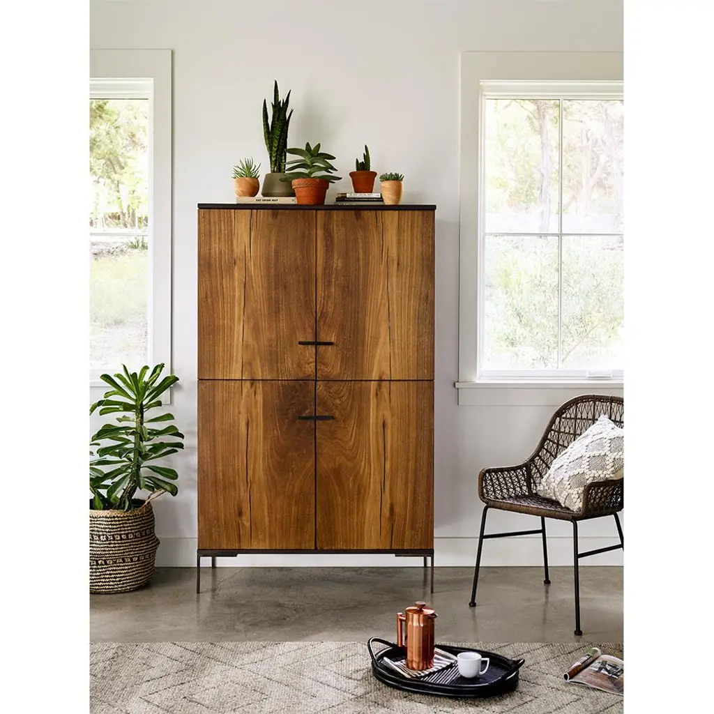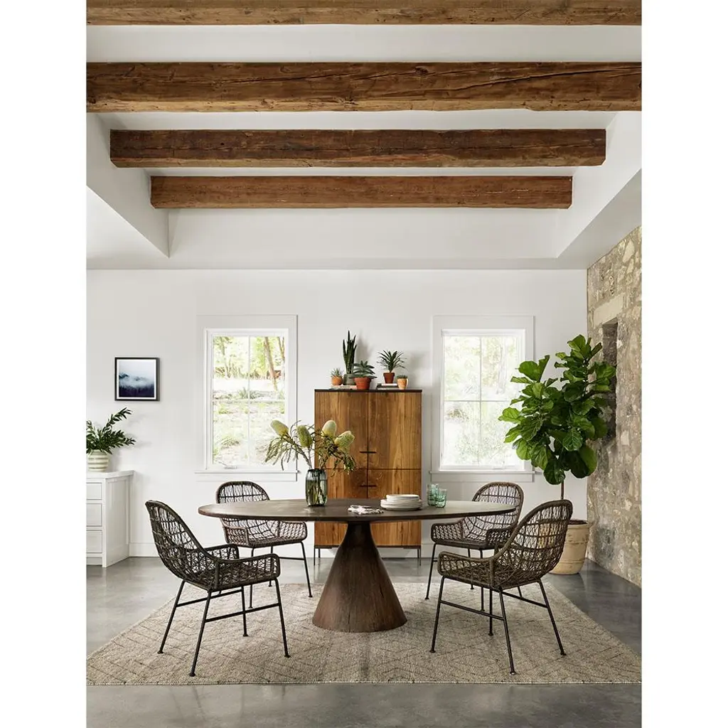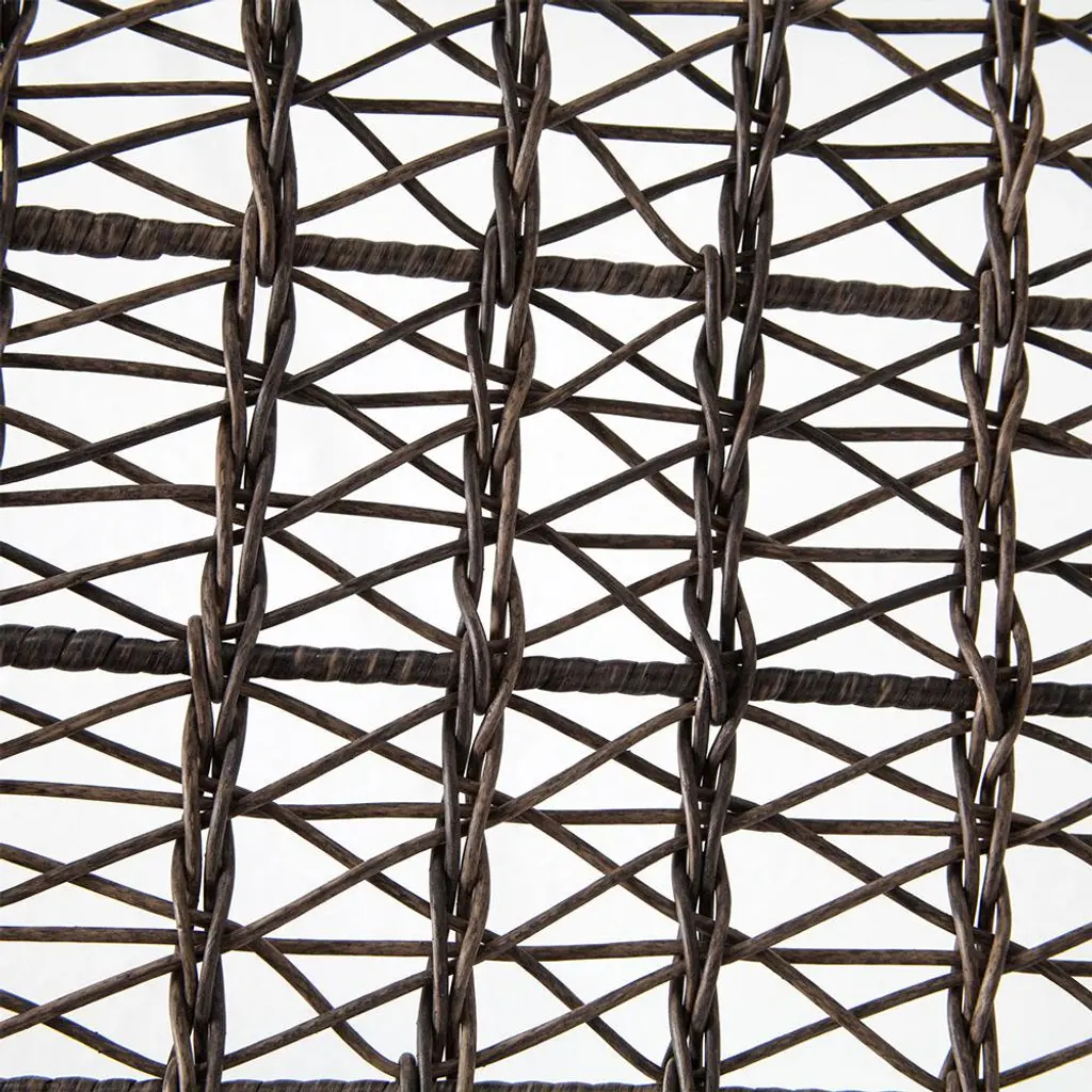 Clean lines meet with intricate woven details on the lively Elena dining chair. Set atop a black iron base, low arms and a gently sloped back create a comfortable seat. Finished in distressed brown, an all-weather wicker weave offers durability both indoors and outdoors.