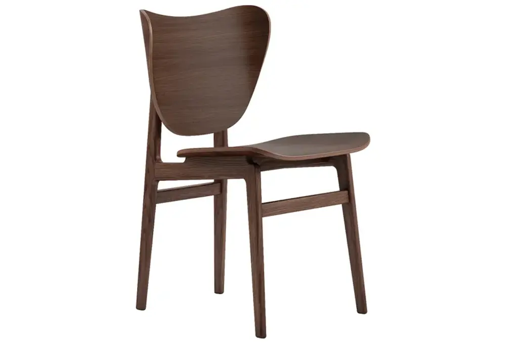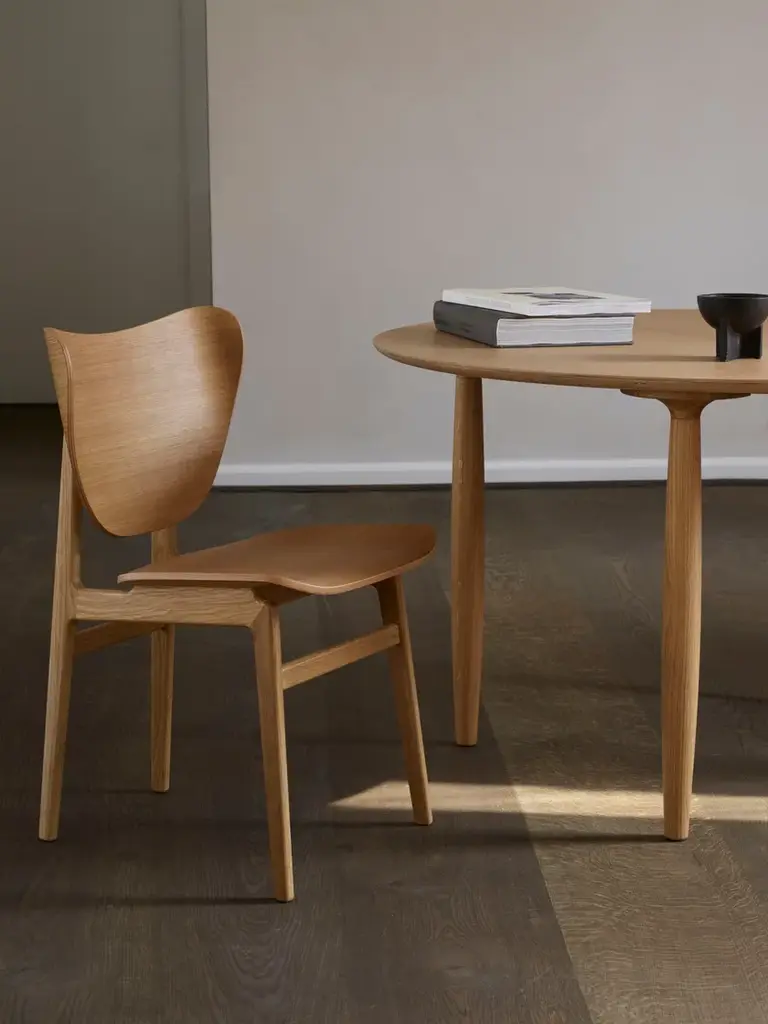 Elephant is an oak dining chair.The Elephant Chair is a dining chair version of the popular Elephant Lounge Chair. With a gently curved back with the same soft curve as the lounge chair and a sculptural wood base the Elephant Chair brings comfort to the table. Elephant Dining is produced with solid oak legs, with back and seat in laminated oak veneer. The seat and the back are upholstered in leather and textile of highest quality, and the refined 25 mm foam blend provides superior comfort. The upholstery gives the chair a solid look, which is contrasted by the slim contour of the veneer edge. “Elegant, simple but sturdy without being clumsy”.Frame: Natural Oak, Dark Stained Oak, Black Oak, Smoked Oak