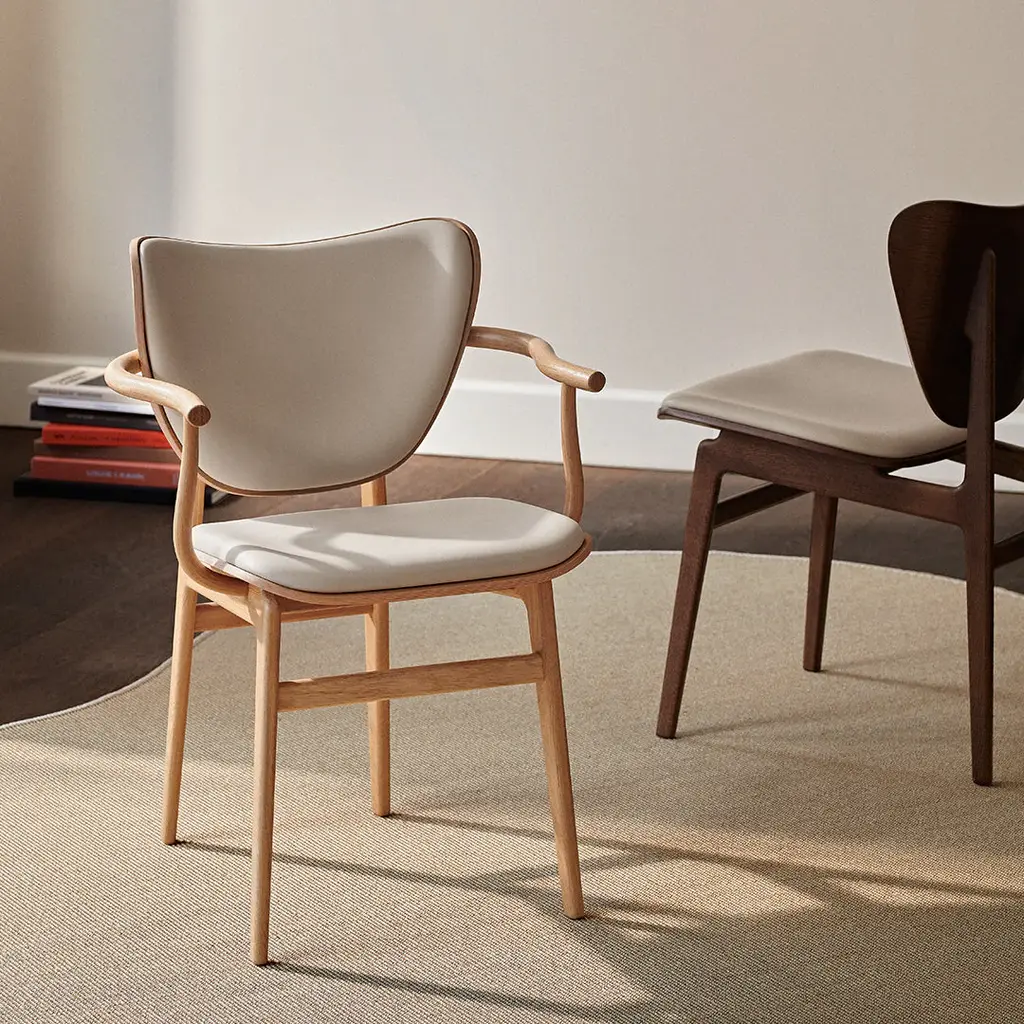 The Elephant Chair is a dining chair version of the popular Elephant Lounge Chair. To add even more comfort we are introducing an Elephant Chair with armrest. The armrest is made of bent oak and provides firm support. The design is a new and modern touch to traditional Scandinavian dining chairs and the armrest with its strong lines gives an interesting contrast to the soft shapes of the Elephant. The result is a chair that can stand stylish on its own as a side chair or in a set of many around a dining table.