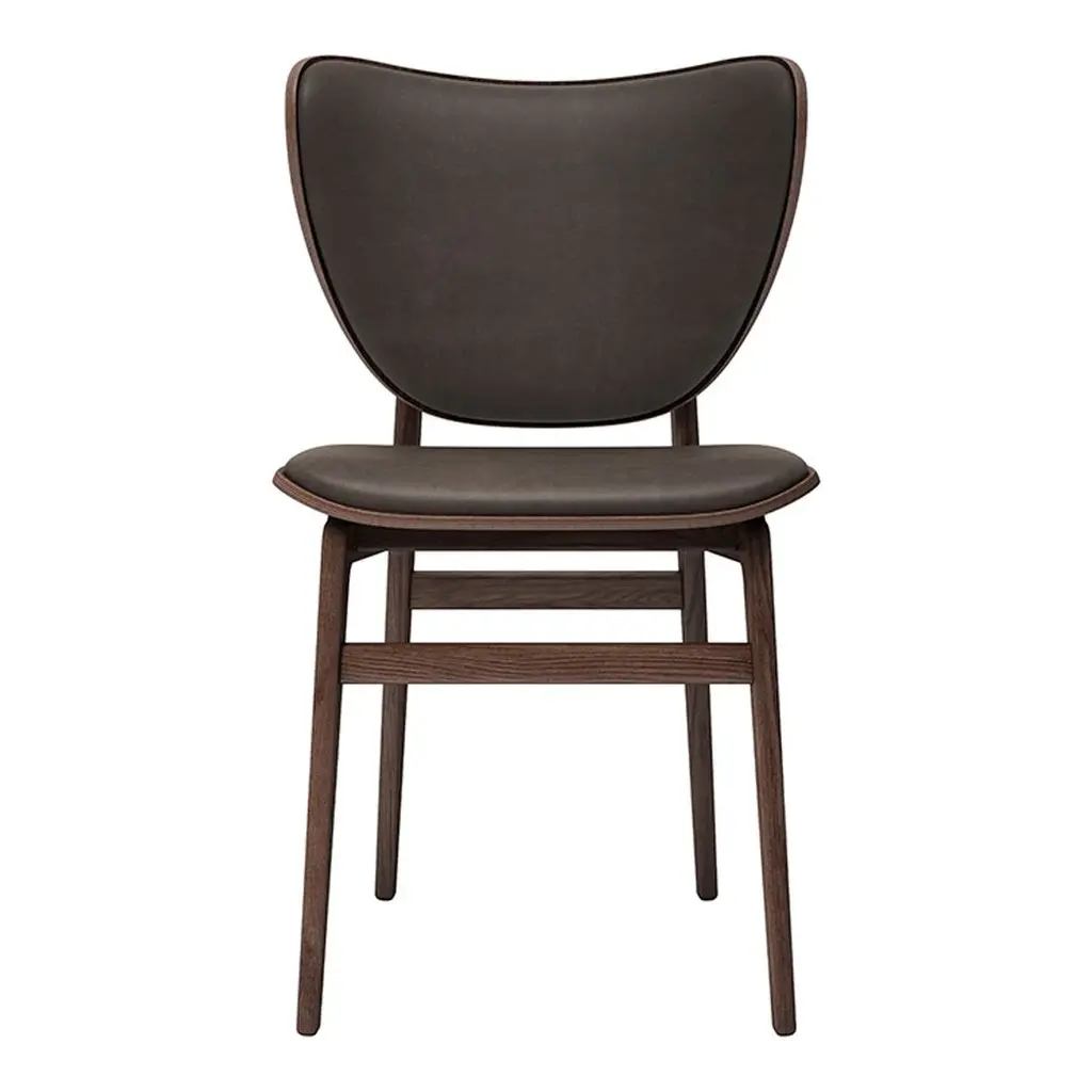 The Elephant Dining Chair is a dining chair version of the popular Elephant Lounge Chair. The legs are shared with the proven NY11 Dining Chair while the seat and back are pressed in the same soft curve as the Elephant Lounge Chair. The result is a light and elegant dining chair where the Elephant ear shaped back gently curves around the body. Elephant Dining is produced with solid oak legs, with back and seat in laminated oak veneer. The seat and the back are upholstered in leather and textile of highest quality, and the refined 25 mm foam blend provides superior comfort. The upholstery gives the chair a solid look, which is contrasted by the slim contour of the veneer edge. "Elegant, simple but sturdy without being clumsy".