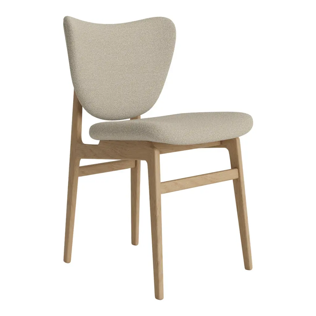 The Elephant Dining Chair is a dining chair version of the popular Elephant Lounge Chair. The legs are shared with the proven NY11 Dining Chair while the seat and back are pressed in the same soft curve as the Elephant Lounge Chair. The result is a light and elegant dining chair where the Elephant ear shaped back gently curves around the body. Elephant Dining is produced with solid oak legs, with back and seat in laminated oak veneer. The seat and the back are upholstered in leather and textile of highest quality, and the refined 25 mm foam blend provides superior comfort. The upholstery gives the chair a solid look, which is contrasted by the slim contour of the veneer edge. "Elegant, simple but sturdy without being clumsy".