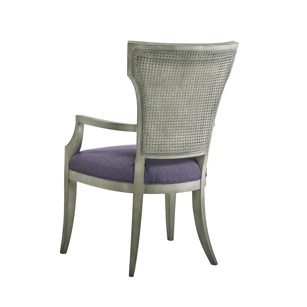 Beautiful rounded angles pair with the cane backing to make this upholstered chair a versatile mix of contemporary and traditional styles. Set at each ends of your dining table, or place in a hallway or foyer for a convenient seat when most needed. The Elisa collection also includes an armless dining chair (sold separately). Ships In 8-10 Weeks Cane back Tight seat As Shown Fabric: Jake Purple, Enchanted Sky (lifestyle) As Shown Finish: Mineral, Sandstone (lifestyle) If you choose to purchase COM, once you have placed your order a customer service rep will contact you regarding where to send your fabric. Please note that current lead time is 17-19 weeks once your fabric arrives at the factory, and if unused fabric is under 1.5 yards, it cannot be sent back to you.This product can be special ordered in additional fabrics, leathers, finishes, and cushion fillings. Click here to email us for for additional information about special ordering.This image is for illustrative purposes only. The colors shown are accurate within the constraints of lighting, photography, and the color accuracy of your screen.