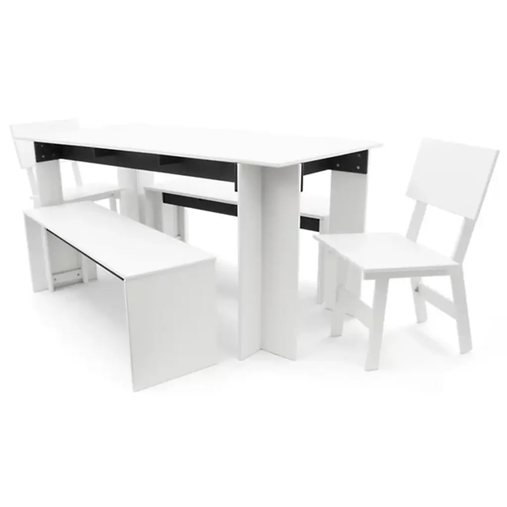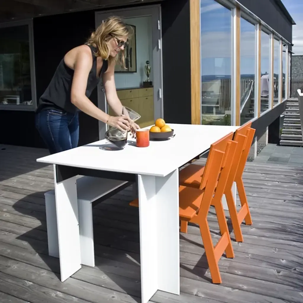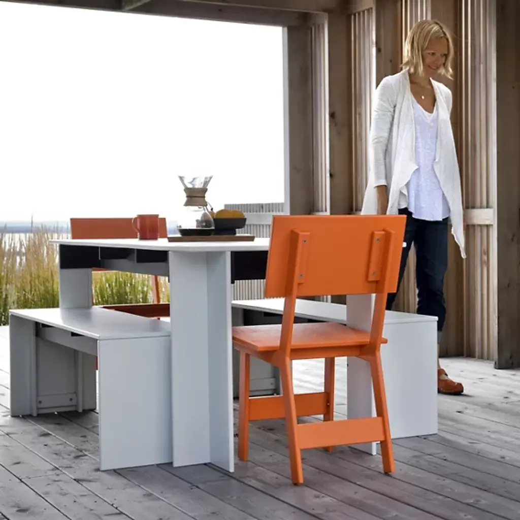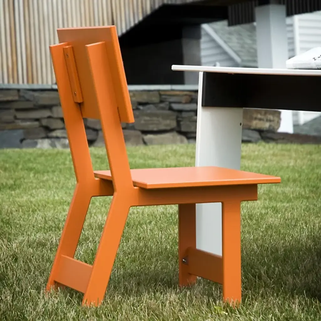 A compact yet comfortable chair for stylish outdoor dining. Designed by David Salmela, the Loll Designs Emin Outdoor Dining Chair has a versatile modern form that will fit in with the rest of the Salmela or any other Loll Designs dining set. It is made out of recycled milk jugs and non-recycled HDPE, and comes in a rainbow of colors.