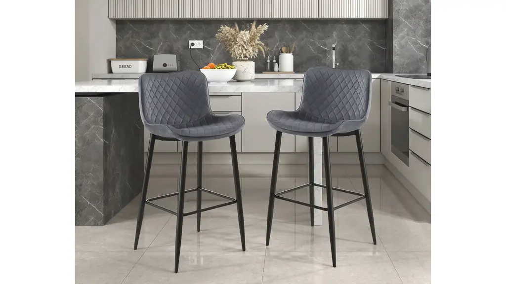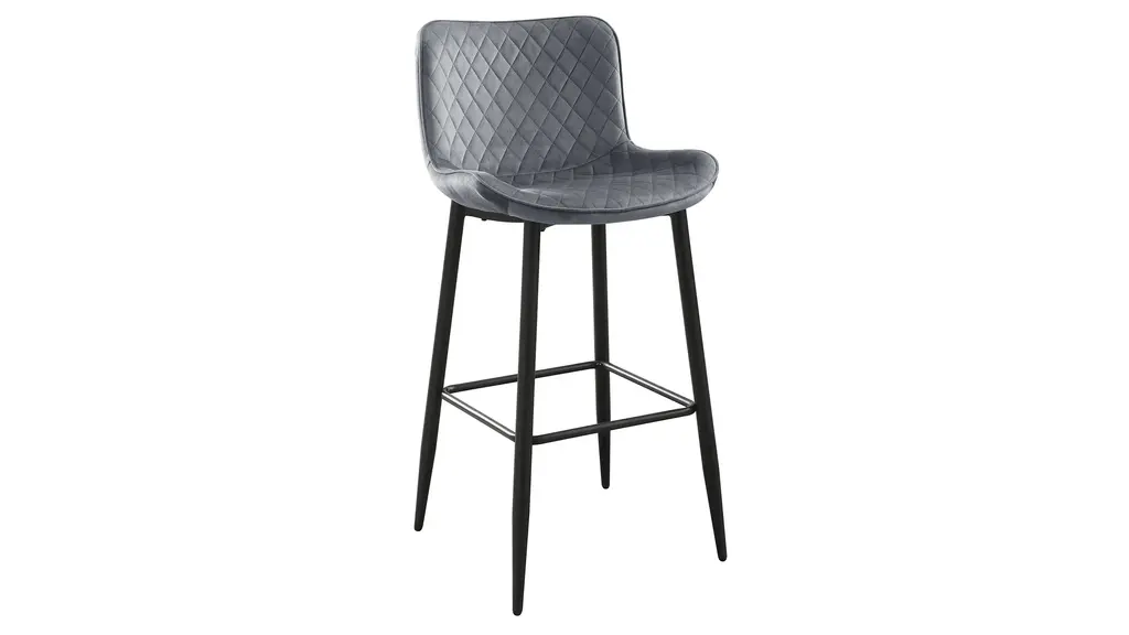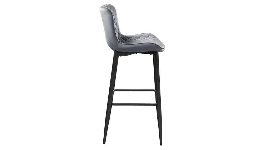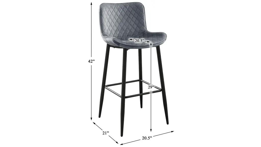 Emmeline Pub Height Chair is serving as the perfect complement to your modern casual dining space, the Emmeline Collection pairs with your existing counter or bar tabletop. The available 29-inch height chair features a seat which is covered in dark gray velvet fabric upholstery and is supported by black metal legs. The diamond stitch pattern of the seat further lends to the modern aesthetic of the piece.