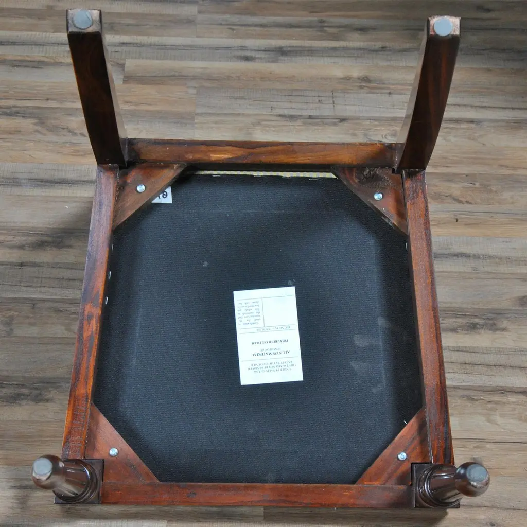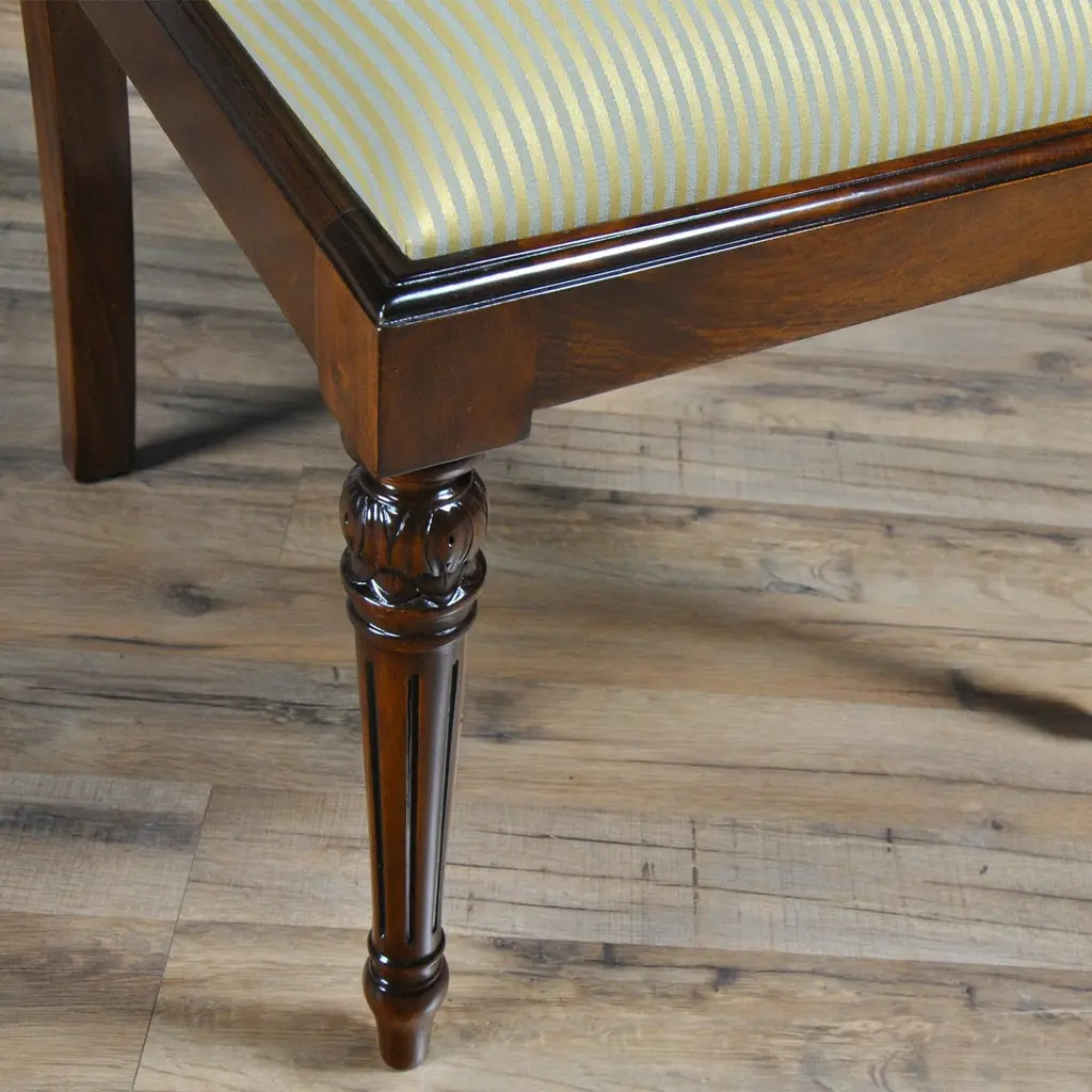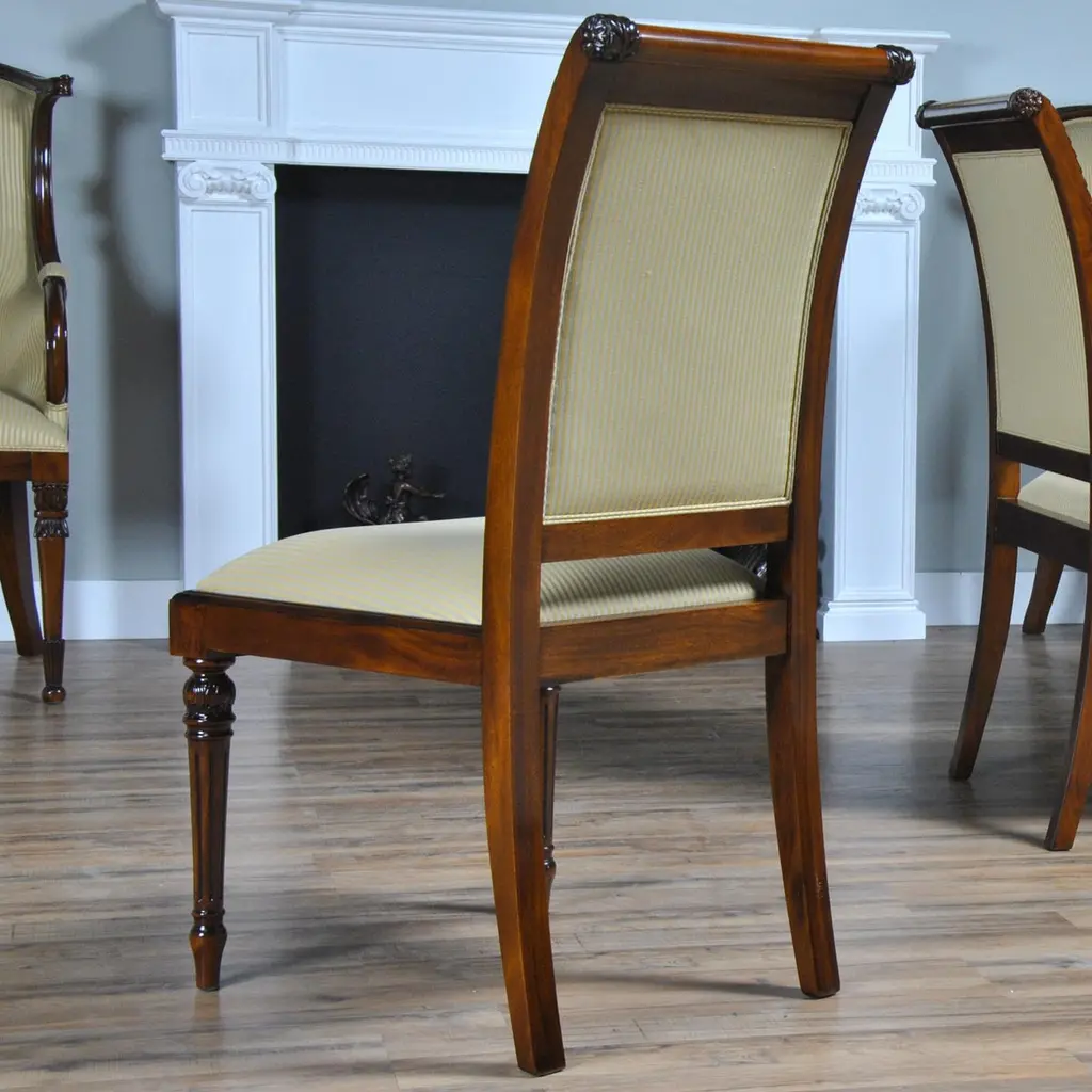 This set of 10 Empire Upholstered Chairs features 2 arm chairs as well as 8 side chairs. All of the chairs in this set feature a fully upholstered back for maximum comfort. And the drop in seat also gives these chairs a great quality designer look along with the ability to have the fabric changed somewhat easily. The hand carved solid mahogany frames are produced from kiln dried, plantation grown mahogany. The chair is stocked and ships out with our standard, neutral green stripe fabric, suitable for use in almost any setting.Arm Height approximately 27.5 inches and seat height approximately 20 inches.Arm Chairs measure 24w x 28d x 40hSide Chairs measure 21w x 25d x 40hSet consists of 2 Arm and 8 Side Chairs
