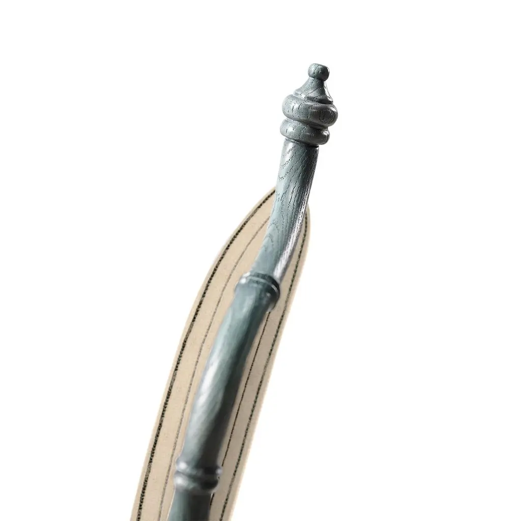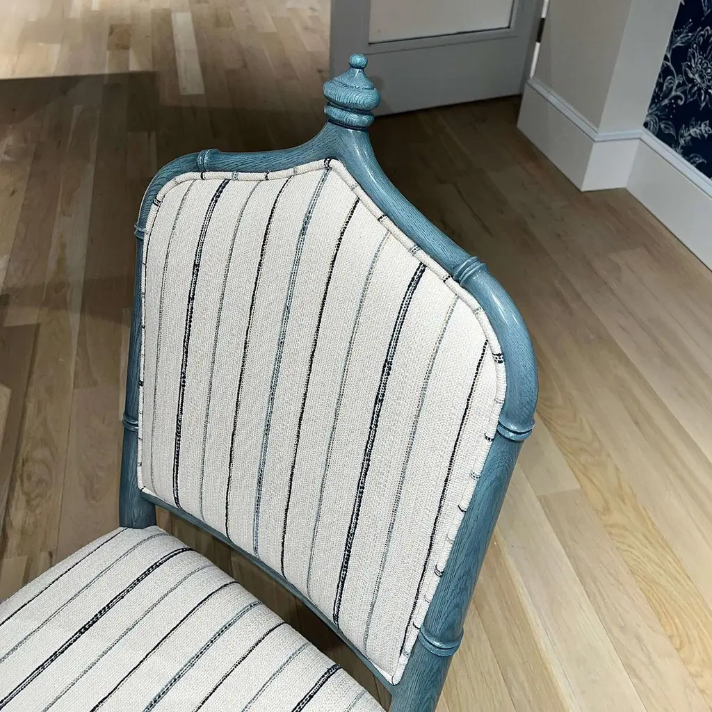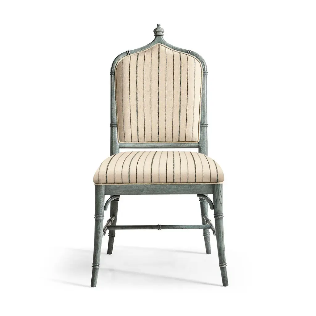 Inspired by English Regency design, this exquisite side chair features a faux bamboo frame with flared, tapered legs and an H-form stretcher for added stability. The solid oak frame is finished in a distinguished blue faded oak, exuding a timeless appeal that complements both classic and contemporary interiors.Upholstered in Marlin Baltic striped fabric, the cushioned seat and back provide exceptional comfort while adding a touch of playful sophistication. Perfect for dining rooms, living spaces, or any corner in need of a statement piece, this chair seamlessly balances style and function. Dimensions: 21.5" W x 24.625" D x 41.625" HSeat Height: 19"