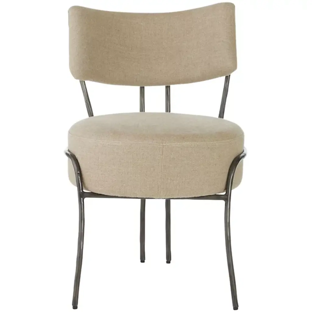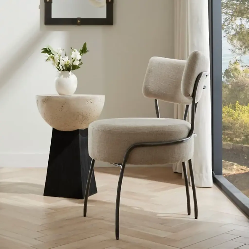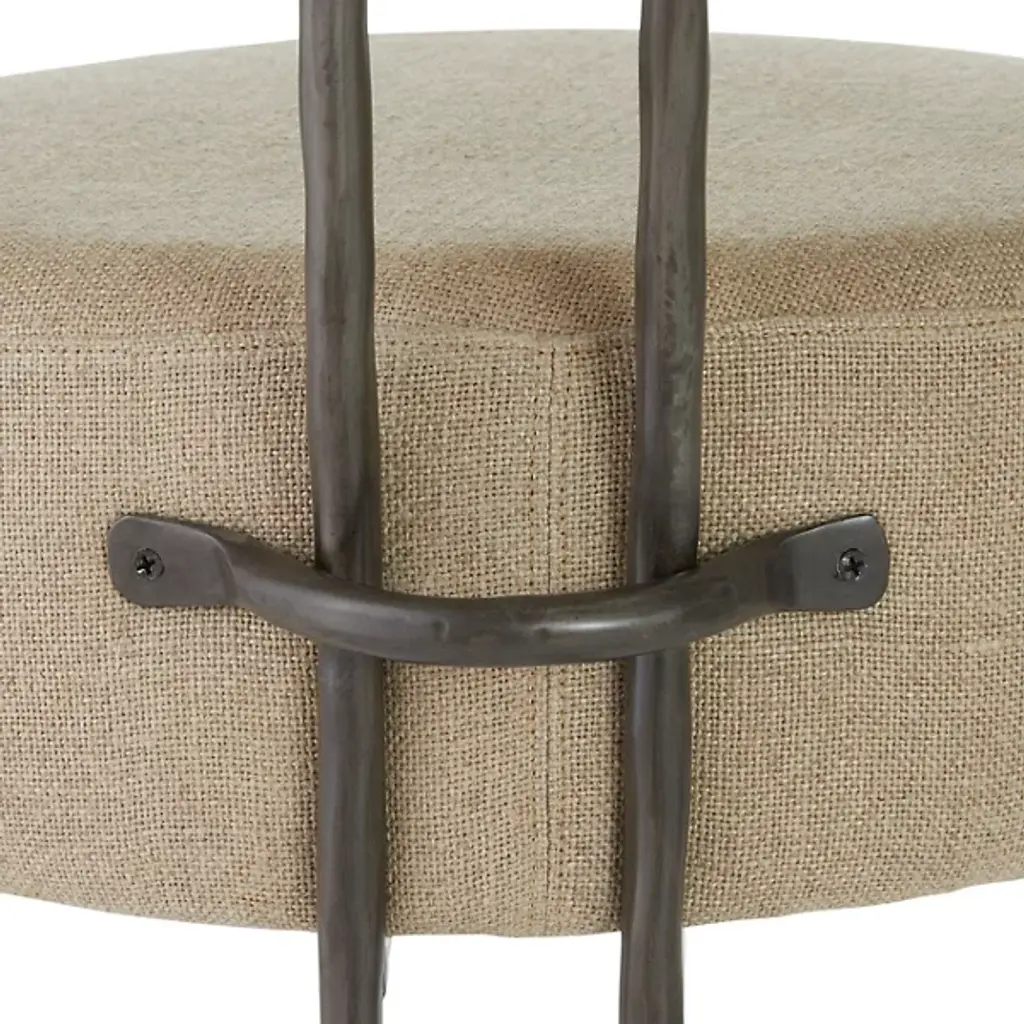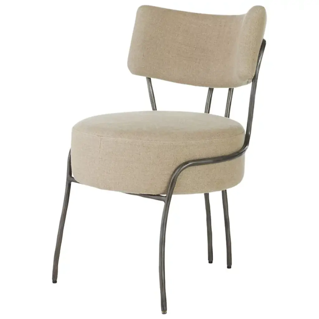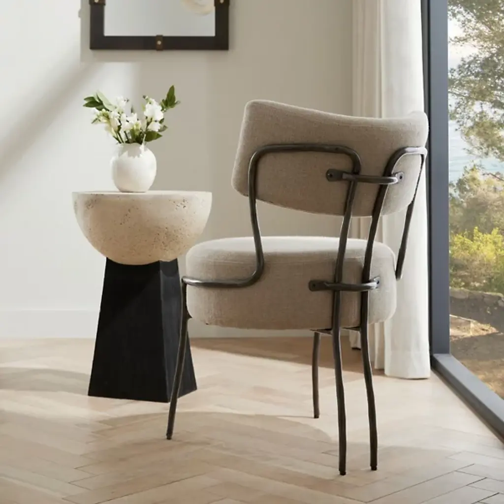 The Enid Side Chair from Arteriors combines flowing lines and textural details to create a visually striking piece. Crafted from natural iron and upholstered in soothing oatmeal linen, its airy organic form is complemented by a barrel seat and curved backrest. The design is enhanced by a stylish back clasp detail and added handles, allowing you to position it anywhere in a room with ease. Each chair features unique variations in finish, ensuring every piece is one-of-a-kind.