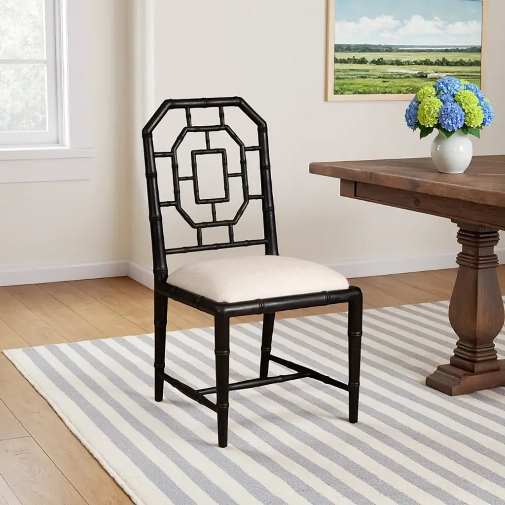 Introducing the Epifanio Mahogany Upholstered Side Chair in a sleek black finish. Crafted from high-quality mahogany wood, this chair boasts a sturdy frame that ensures durability while adding a touch of sophistication to your decor. The plush upholstery provides exceptional comfort, making it an ideal choice for long gatherings or casual meals with family and friends. With its timeless design and versatile color, the Lahara side chair seamlessly complements various interior styles, enhancing your home’s aesthetic appeal.