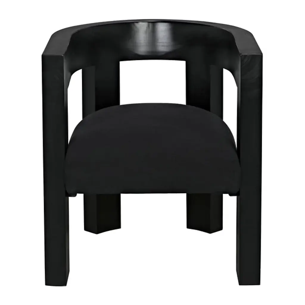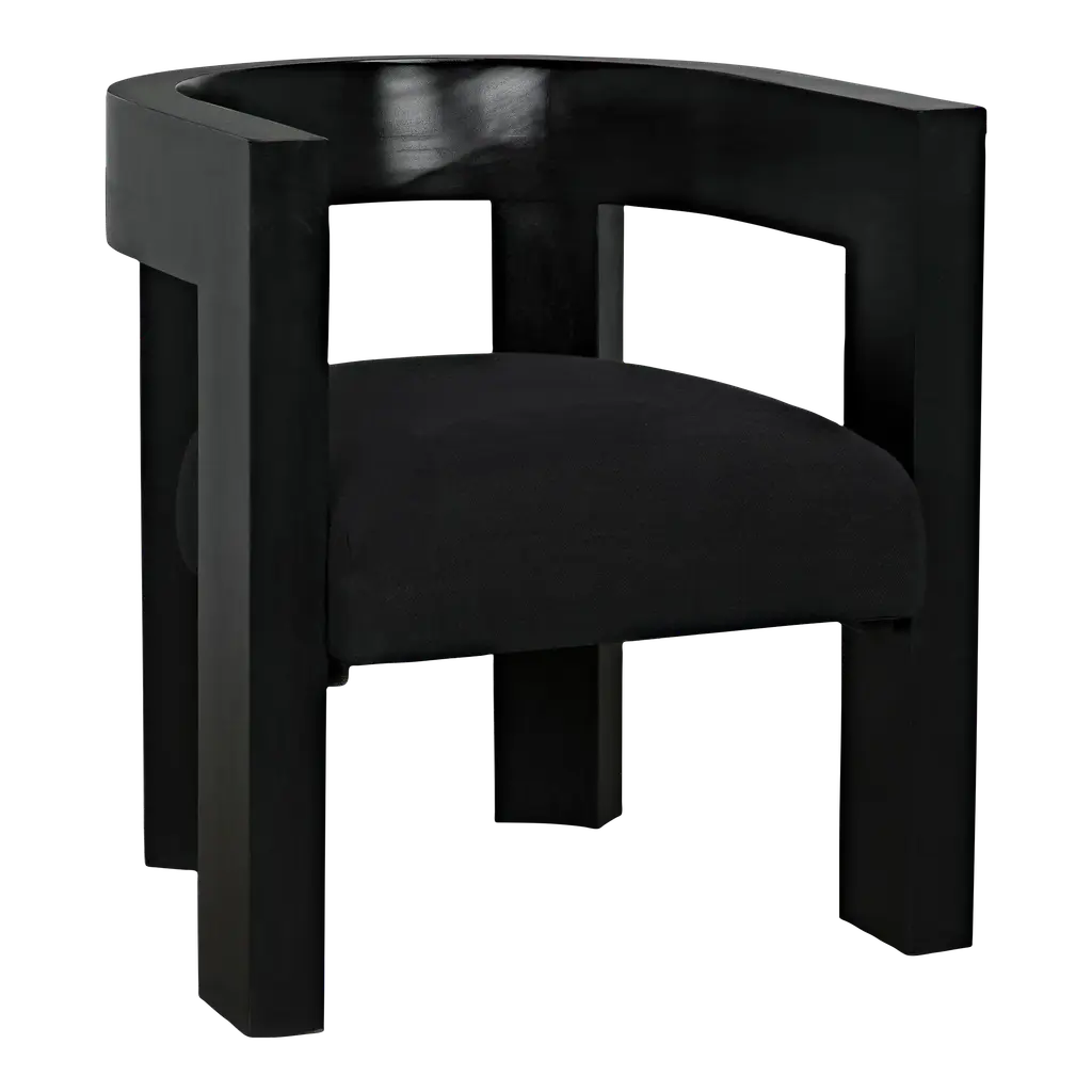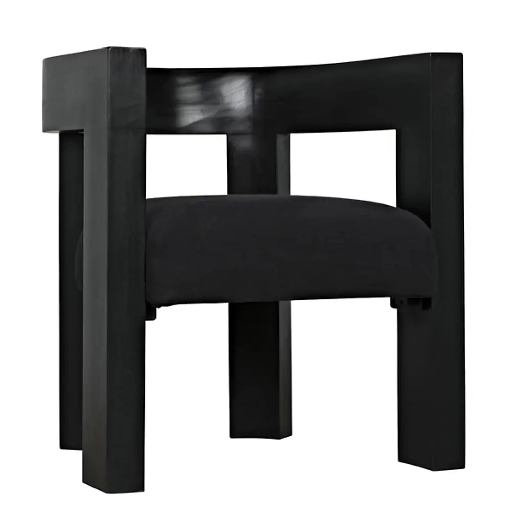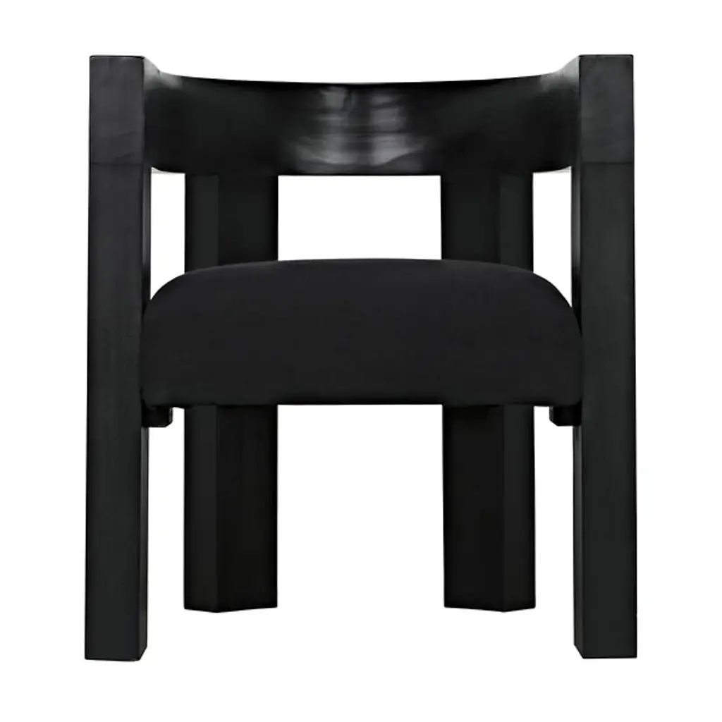 The Eros Dining Armchair from Noir employs thick mahogany construction to create a sculptural seat with geometric cutouts that serve as both armrests and backrest. Solid wood blocks are carved and joined to form the chair's distinctive silhouette, with rectangular openings that reduce visual weight while maintaining structural integrity. The absence of upholstery allows the mahogany's natural grain patterns to remain the primary design element. This chair pairs well with substantial dining tables where its bold geometric form can complement rather than compete with other furniture pieces.
