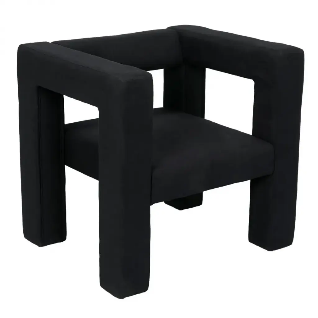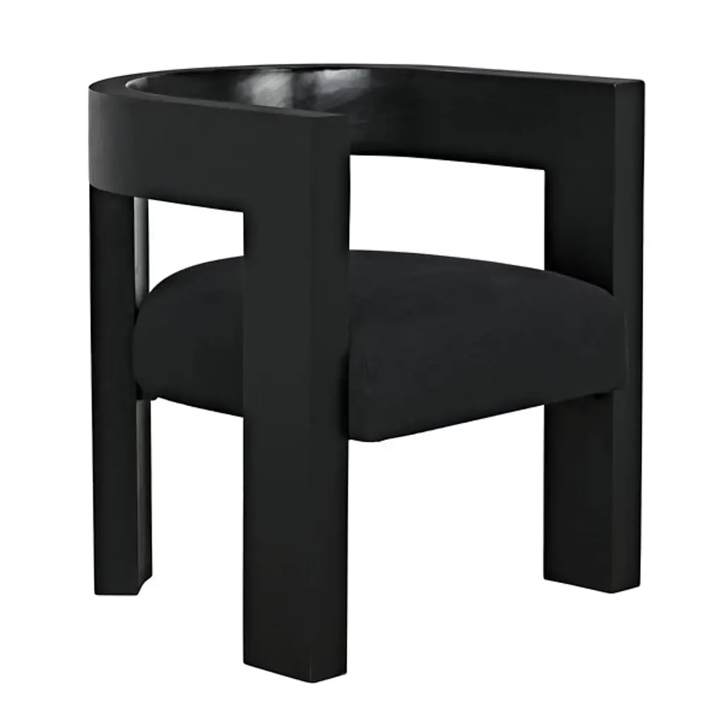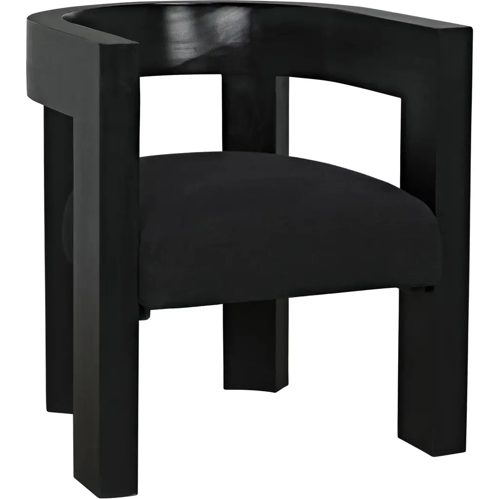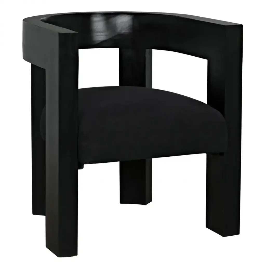 The Eros Dining Armchair from Noir employs thick mahogany construction to create a sculptural seat with geometric cutouts that serve as both armrests and backrest. Solid wood blocks are carved and joined to form the chair's distinctive silhouette, with rectangular openings that reduce visual weight while maintaining structural integrity. The absence of upholstery allows the mahogany's natural grain patterns to remain the primary design element. This chair pairs well with substantial dining tables where its bold geometric form can complement rather than compete with other furniture pieces.