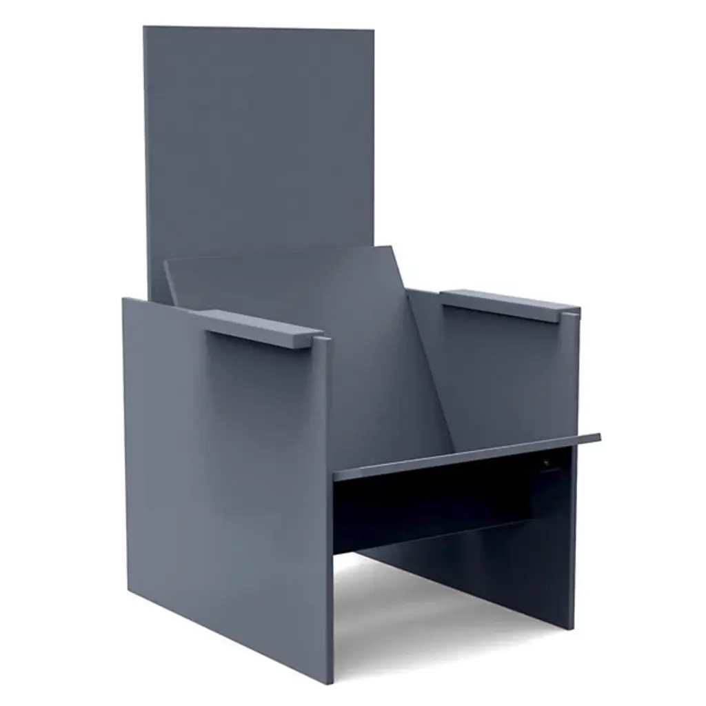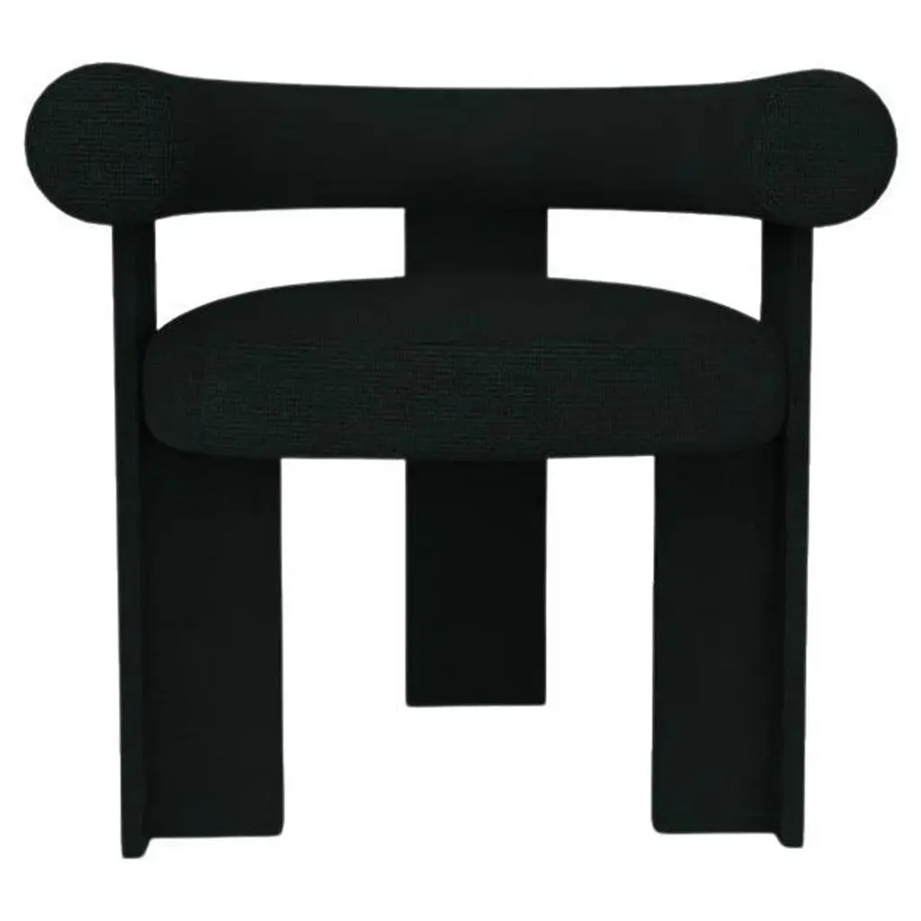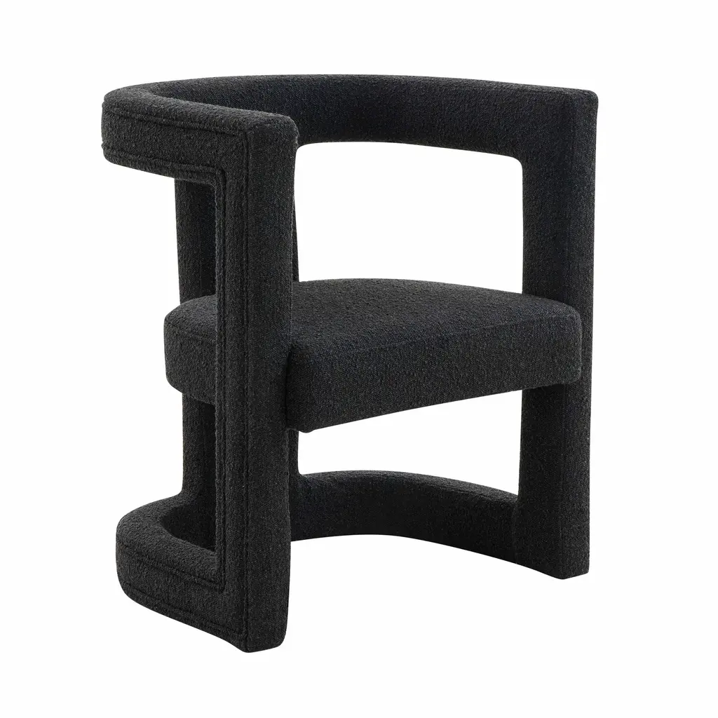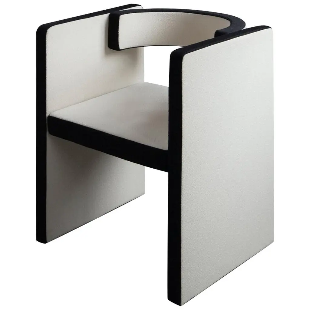 The Eros Dining Armchair from Noir employs thick mahogany construction to create a sculptural seat with geometric cutouts that serve as both armrests and backrest. Solid wood blocks are carved and joined to form the chair's distinctive silhouette, with rectangular openings that reduce visual weight while maintaining structural integrity. The absence of upholstery allows the mahogany's natural grain patterns to remain the primary design element. This chair pairs well with substantial dining tables where its bold geometric form can complement rather than compete with other furniture pieces.